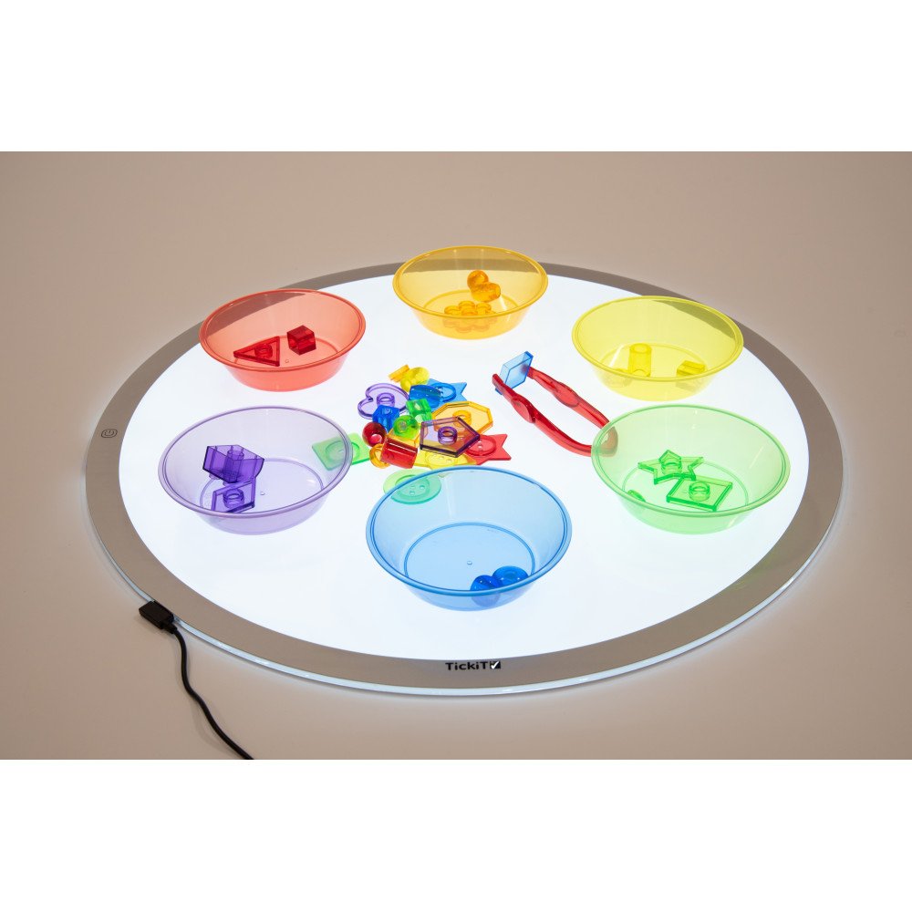 Apvali LED šviesos panelė – tai universali ugdymo priemonė, kuri sukuria ryškų, tolygų apšviestą foną šviesos, spalvų ir formų tyrinėjimui. Apvali forma ypač patogi veikloms, kai vaikai dirba ratu, dalinasi priemonėmis ir natūraliai įsitraukia į bendrą užduotį. Panelė tinka tiek individualiam darbui, tiek mažoms grupėms, kai svarbu aiškiai matyti detales, stebėti pokyčius ir atlikti tyrinėjimu grįstas užduotis.