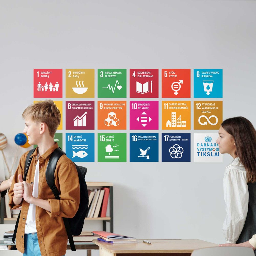 Darnaus vystymosi tikslai ant sienos - vizualiai aiškus ir pritaikytas mokykloms bei ugdymo erdvėms sienų lipdukas. Edukacinis lipdukas pristato 17 Jungtinių Tautų darnaus vystymosi tikslus – svarbiausią šiuolaikinio pasaulio tvarumo ir socialinės atsakomybės gairių rinkinį. Lipdukas skirtas ne tik puošti, bet ir aktyviai skatinti pažinimą, diskusijas bei vertybinį supratimą apie darnią plėtrą.