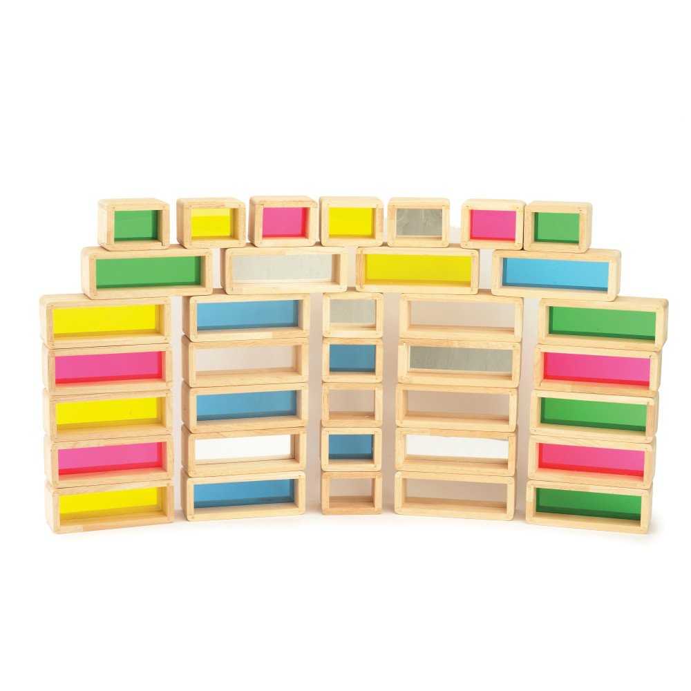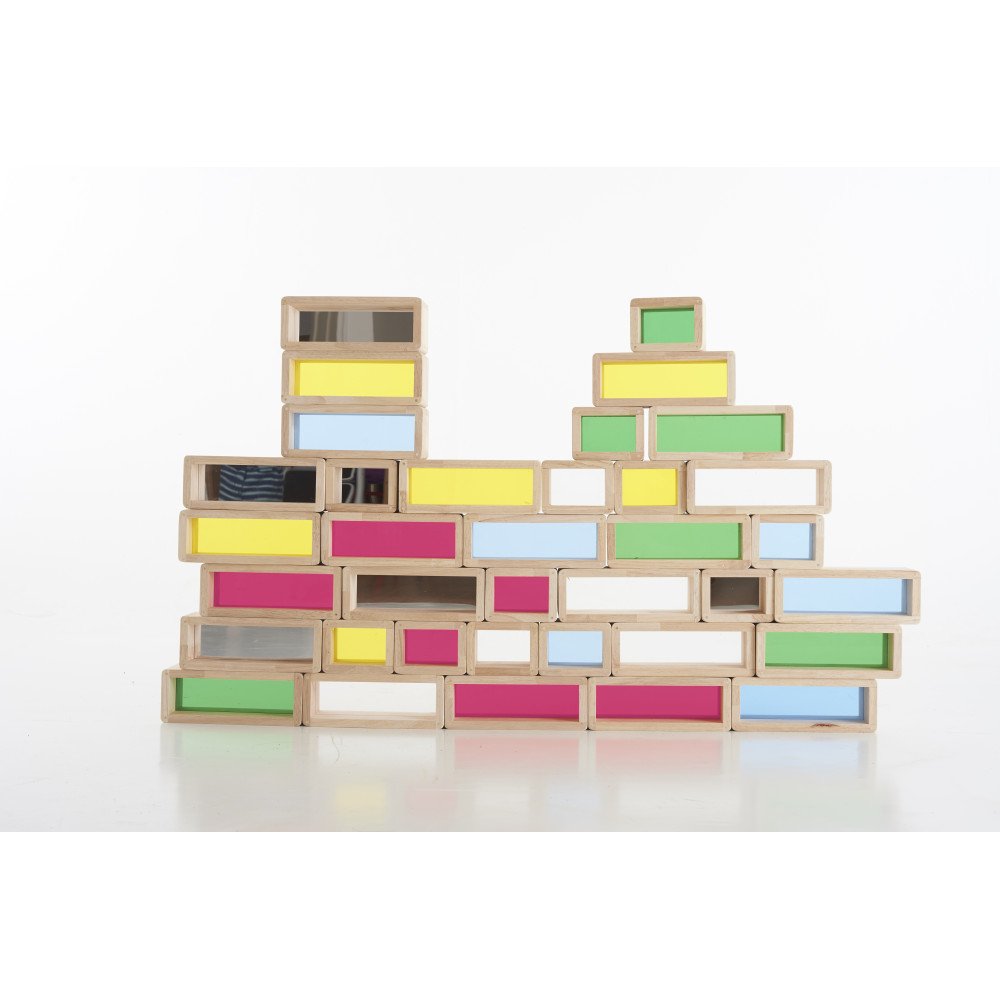 Kaladėlių spalvoti, skaidrūs tarpeliai veikia kaip langeliai: vaikai juos kelia prie akių, žiūri į aplinką per skirtingas spalvas, lygina, kaip keičiasi vaizdas, ir stebi šviesą. Naudojant prie lango ar ant šviesos stalo ryškiai matosi spalvoti atspindžiai, o permatomi ir veidrodinis langeliai leidžia tyrinėti skaidrumą, atspindį ir paprastą spalvų maišymą.