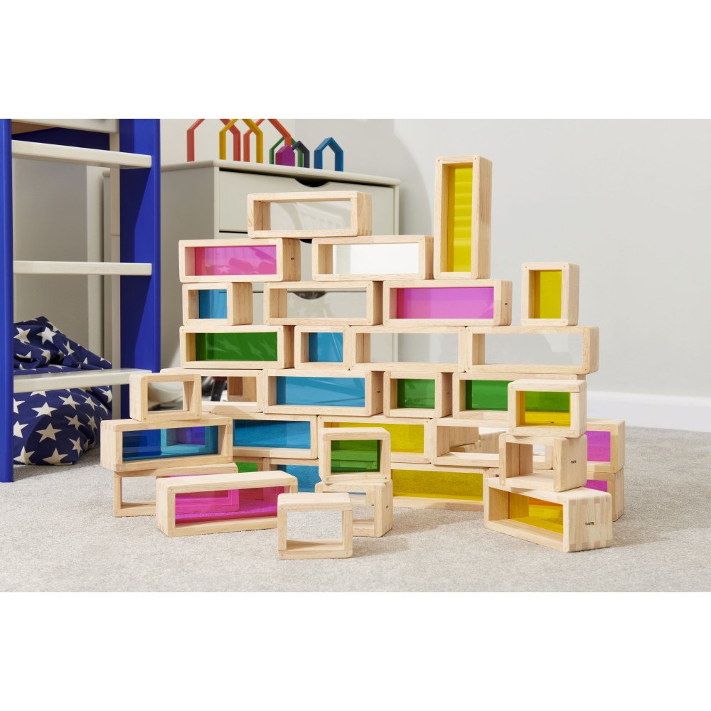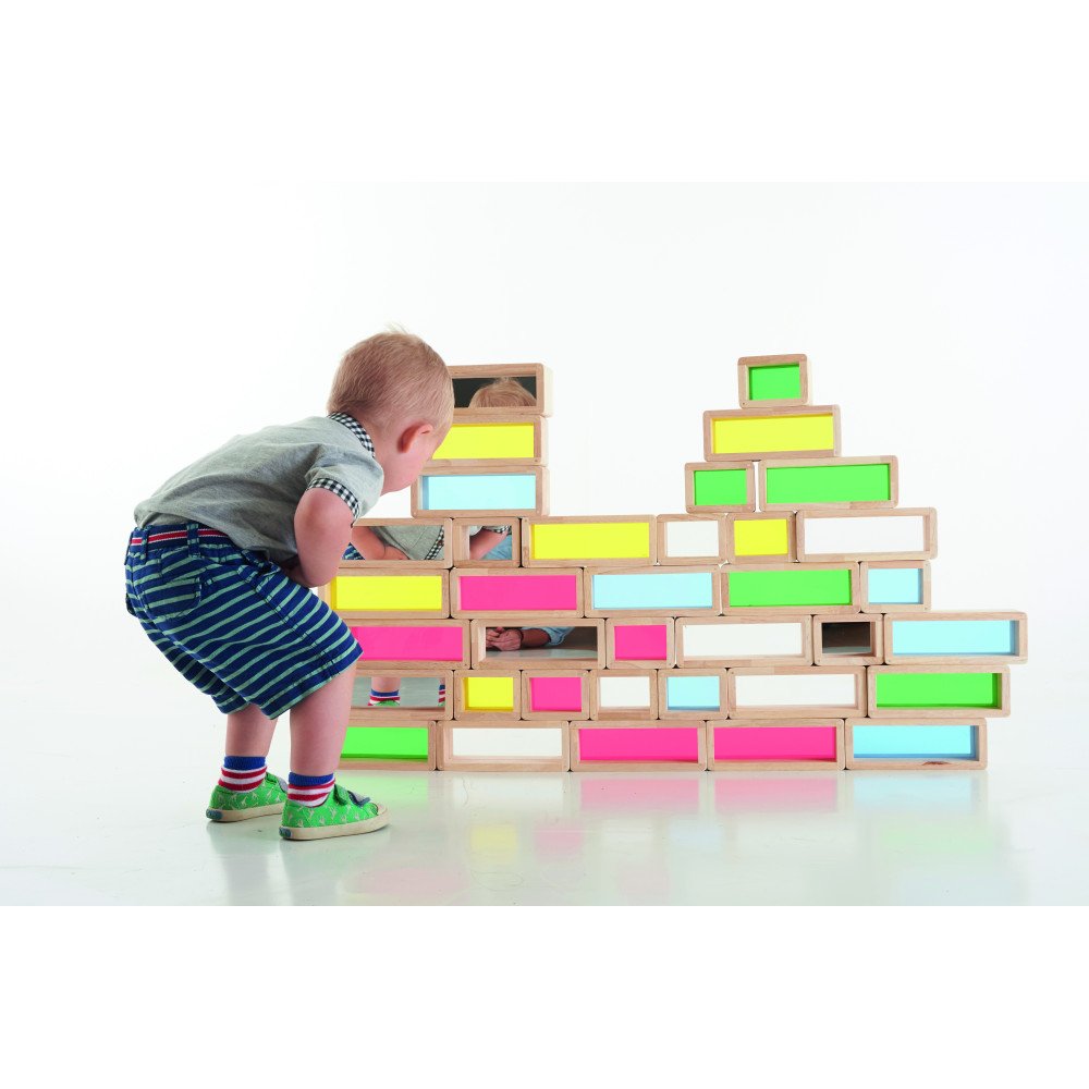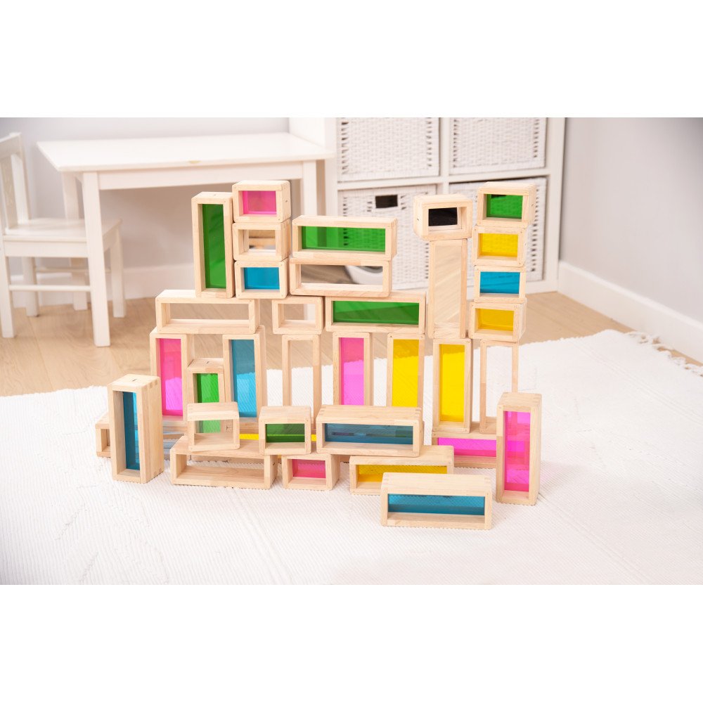 Didelės spalvotos kaladėlės su skaidriais langeliais lavina konstravimo įgūdžius, smulkiąją motoriką ir koordinaciją. Kartu leidžia vaikams tyrinėti pasaulį per spalvotus langelius. Statant sieneles, bokštus ar sieneles, vaikas turi tiksliai sulygiuoti dideles ir mažas kaladėles, išlaikyti konstrukcijos pusiausvyrą ir suplanuoti, kur dėti sunkesnę detalę, kad statinys laikytųsi. Tokie veiksmai stiprina suėmimą, pirštų ir plaštakos kontrolę, gerina rankų–akių koordinaciją ir moko pastatyti stabiliai. Skirtingi dydžiai (didelės ir mažesnės) padeda vaikui suprasti, kaip skirtingos detalės pakeičia konstrukcijos aukštį ar plotį, todėl statymas tampa įdomesnis ir tikslesnis.