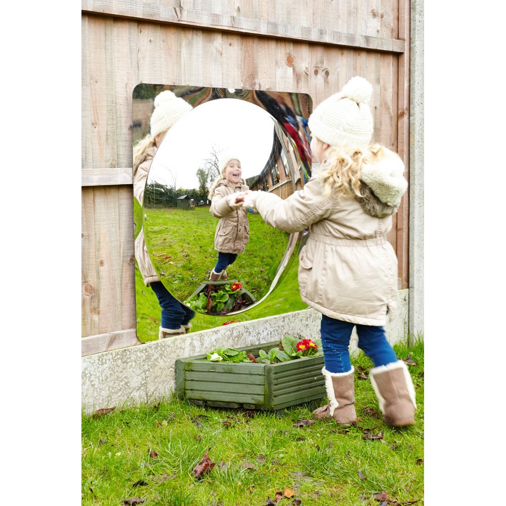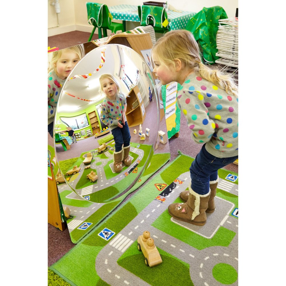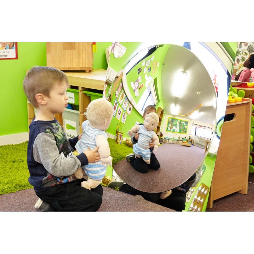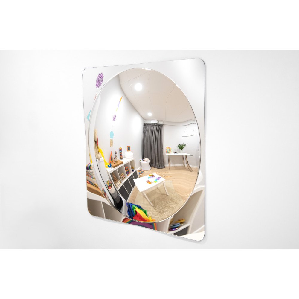 Išgaubtas veidrodžio paviršius sukuria iškraipytą, žaismingą pasaulio vaizdą, kuris vaikams atrodo netikėtas ir smagus. Stebėdami save ir aplinkinius objektus, vaikai natūraliai domisi atspindžiais, mimika, judesiais ir erdvės pokyčiais. Tai skatina smalsumą ir savęs suvokimą.