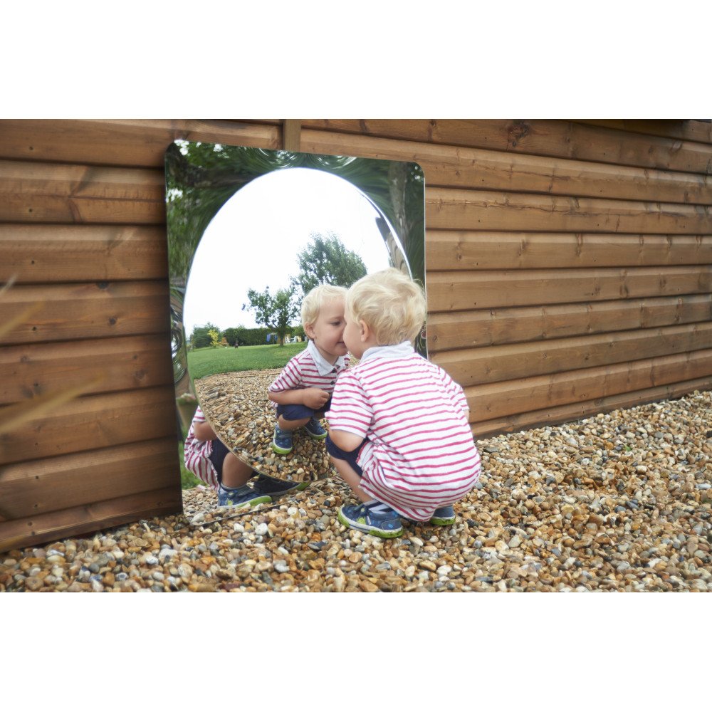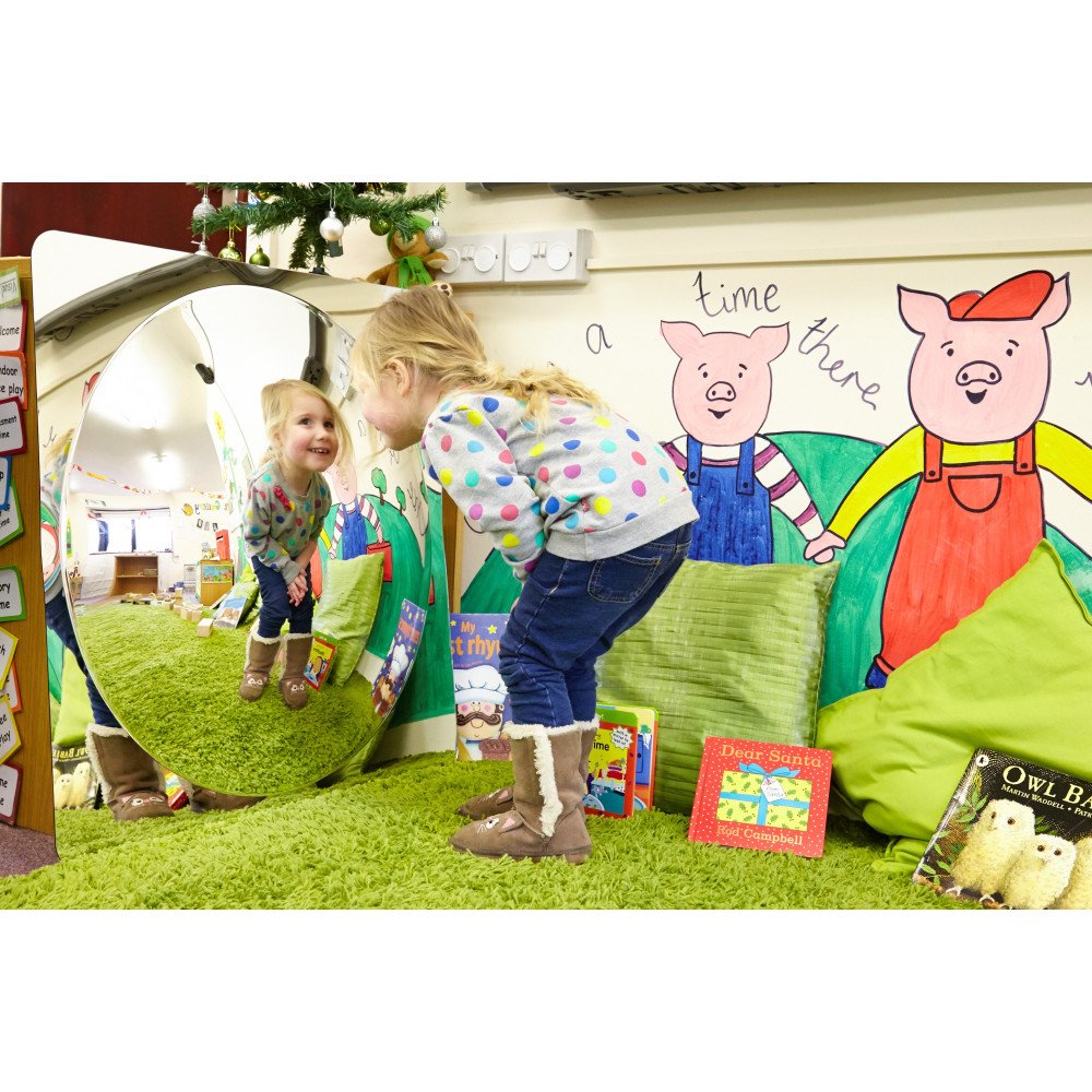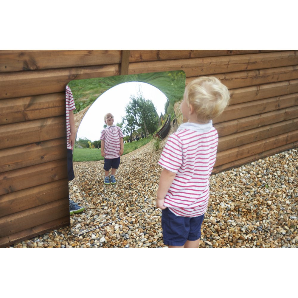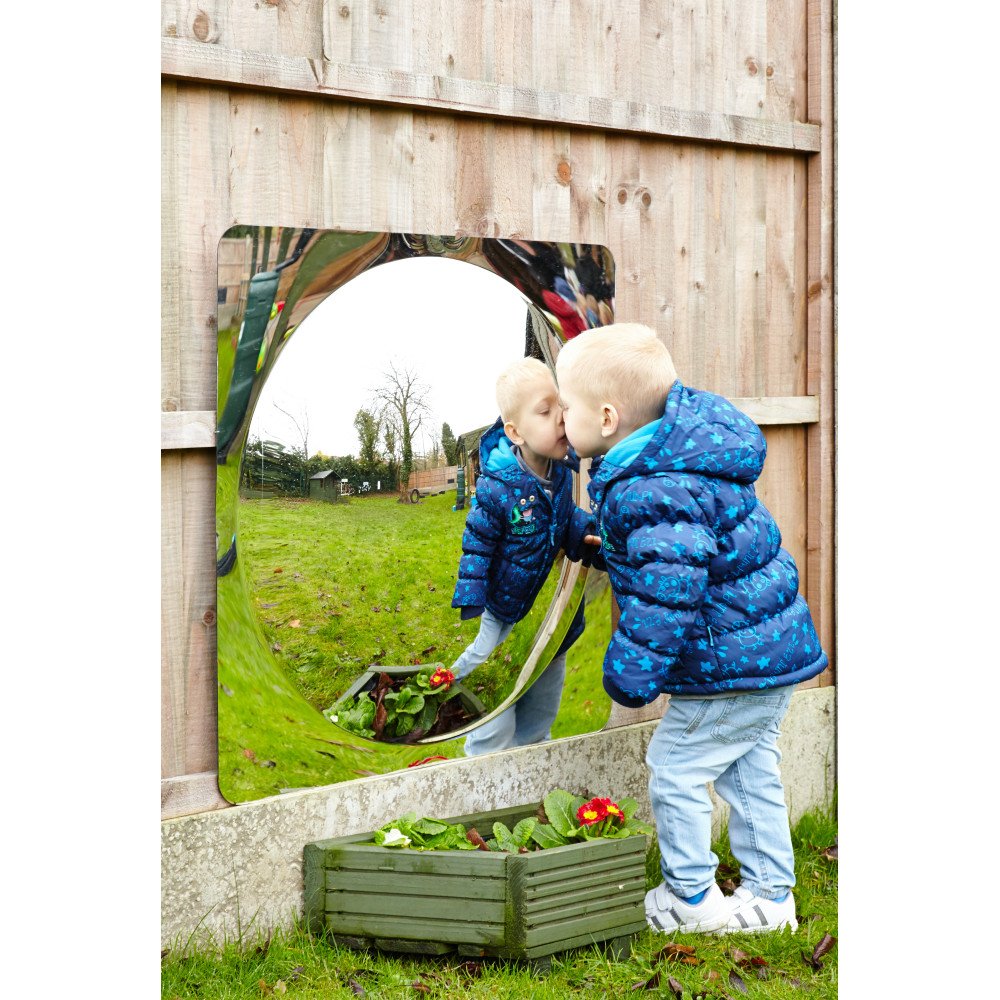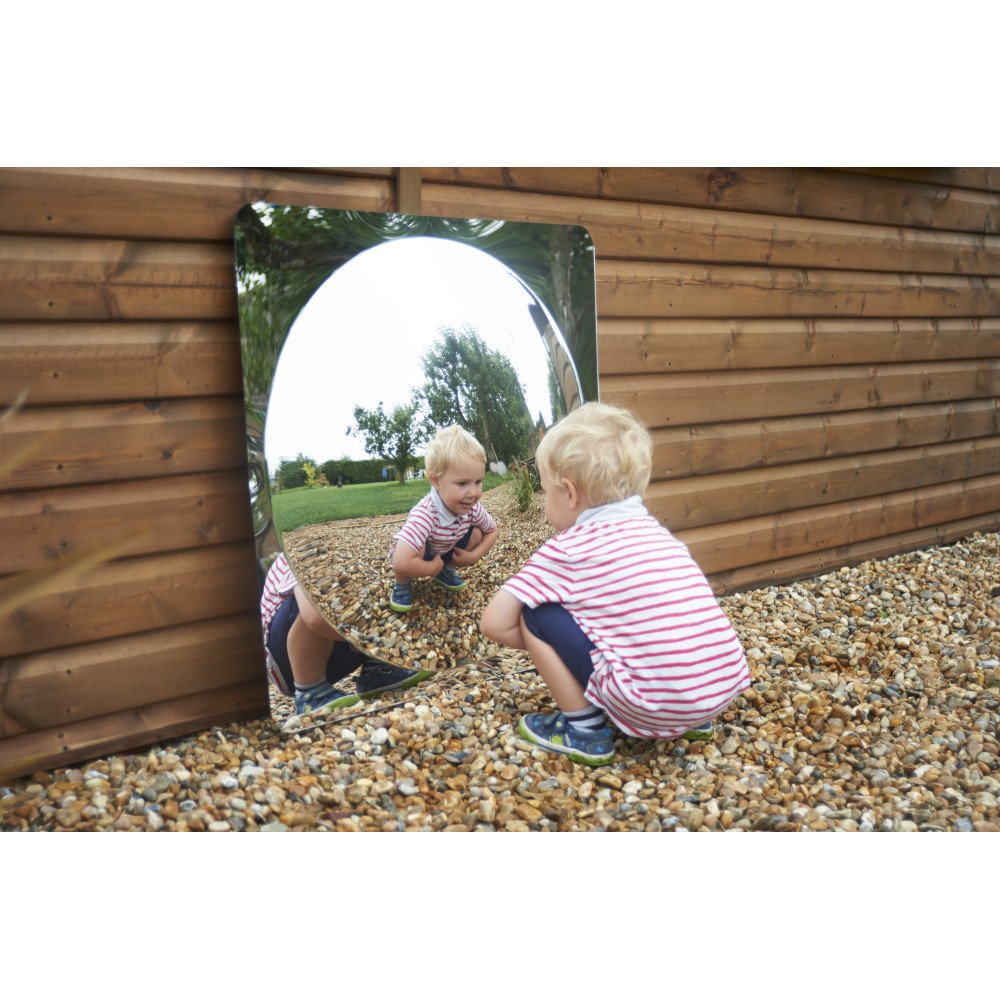 Išgaubtas veidrodžio paviršius sukuria iškraipytą, žaismingą pasaulio vaizdą, kuris vaikams atrodo netikėtas ir smagus. Stebėdami save ir aplinkinius objektus, vaikai natūraliai domisi atspindžiais, mimika, judesiais ir erdvės pokyčiais. Tai skatina smalsumą ir savęs suvokimą.