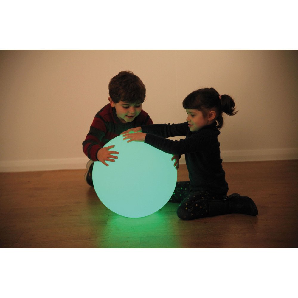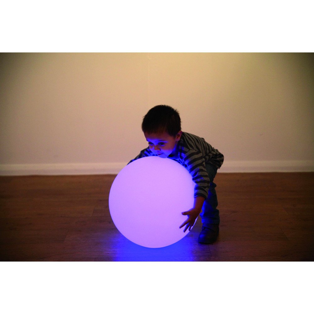 Švelnus, tolygus apšvietimas sukuria aiškų vizualinį fokusą, todėl kamuolys tinka sensorinio kambario veikloms, kai svarbu vizualinė stimuliacija be triukšmo ir chaoso. Nuotolinio valdymo pulteliu galima pasirinkti vieną iš 16 spalvų pastoviam švytėjimui arba įjungti lėtą spalvų perėjimą, kuris padeda stebėti spalvų kaitą, lyginti šiltus ir šaltus atspalvius bei mokytis spalvų pavadinimų.