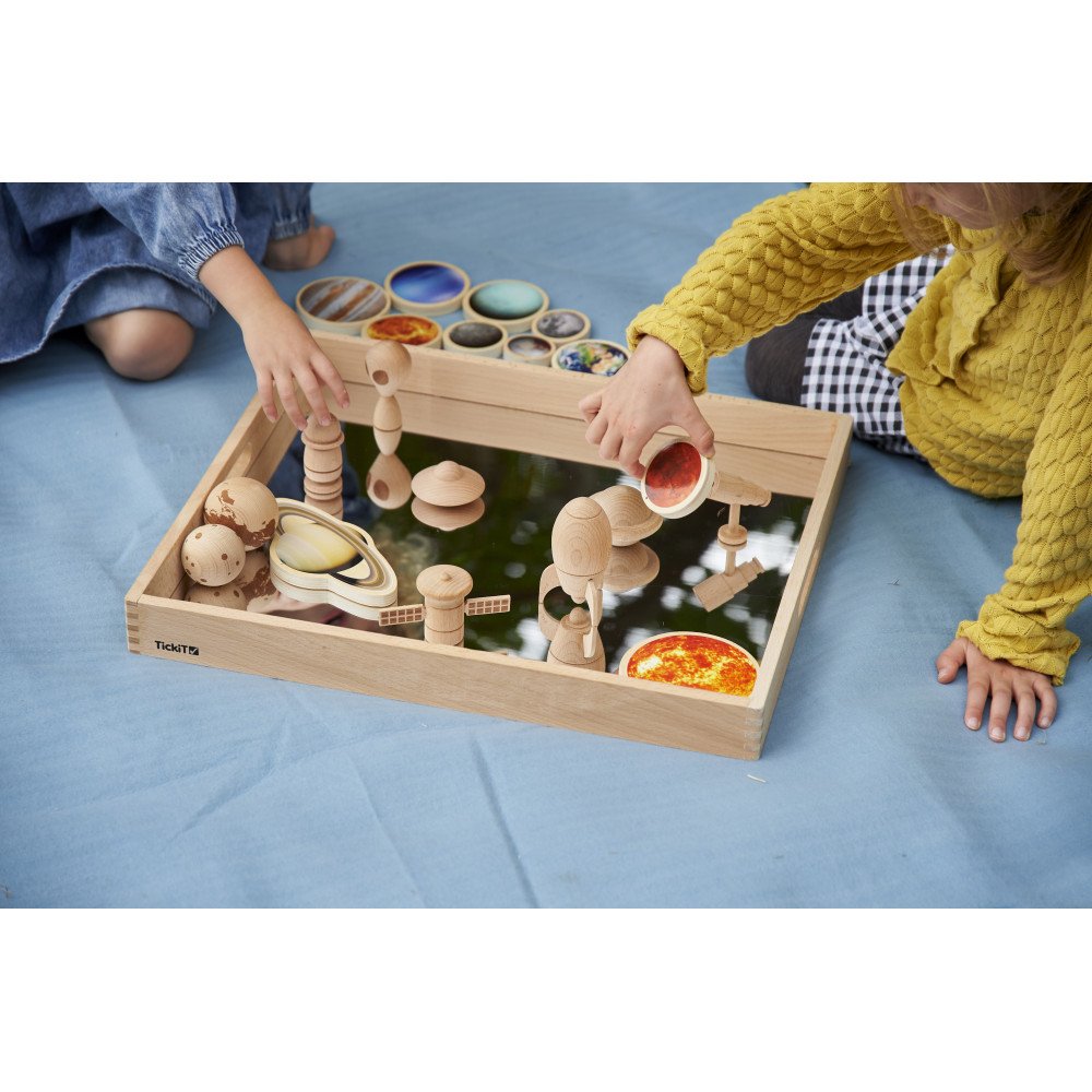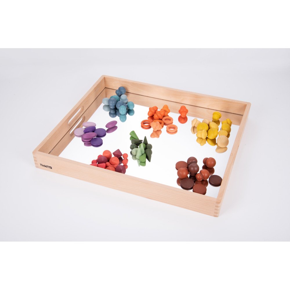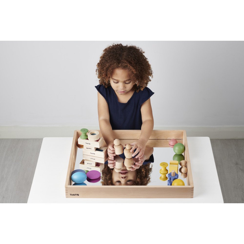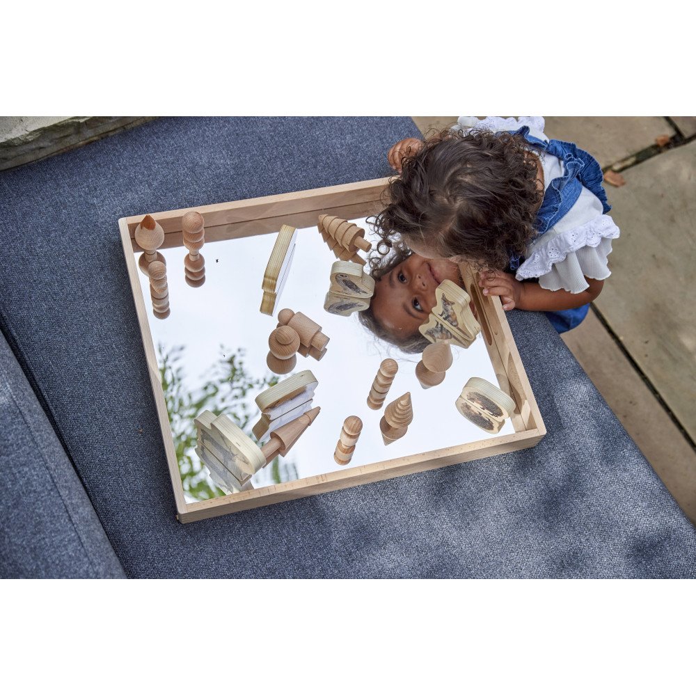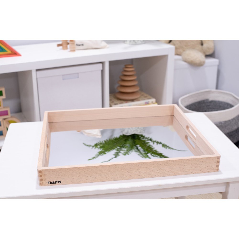 Edukacinis - sensorinis veidrodinis padėklas su akriliniu pagrindu skirtas atspindžių tyrinėjimui, stebėjimui ir kūrybiniams žaidimams. Tvirtas buko medienos rėmas sukuria stabile pagrindą, ant kurio vaikai gali dėlioti gamtines medžiagas, figūrėles, kaladėles ar kitus smulkius objektus ir stebėti juos iš skirtingų kampų. Veidrodinis paviršius sustiprina vizualinį efektą, sužadina smalsumą ir kviečia tyrinėti, kaip keičiasi vaizdas, kai objektai juda, persidengia ar pasisuka.