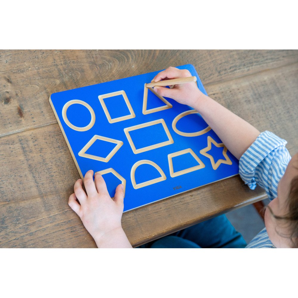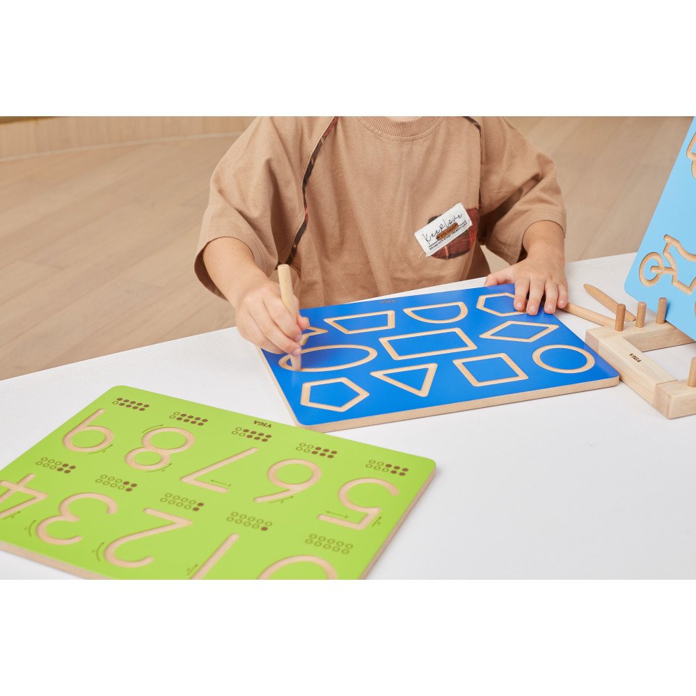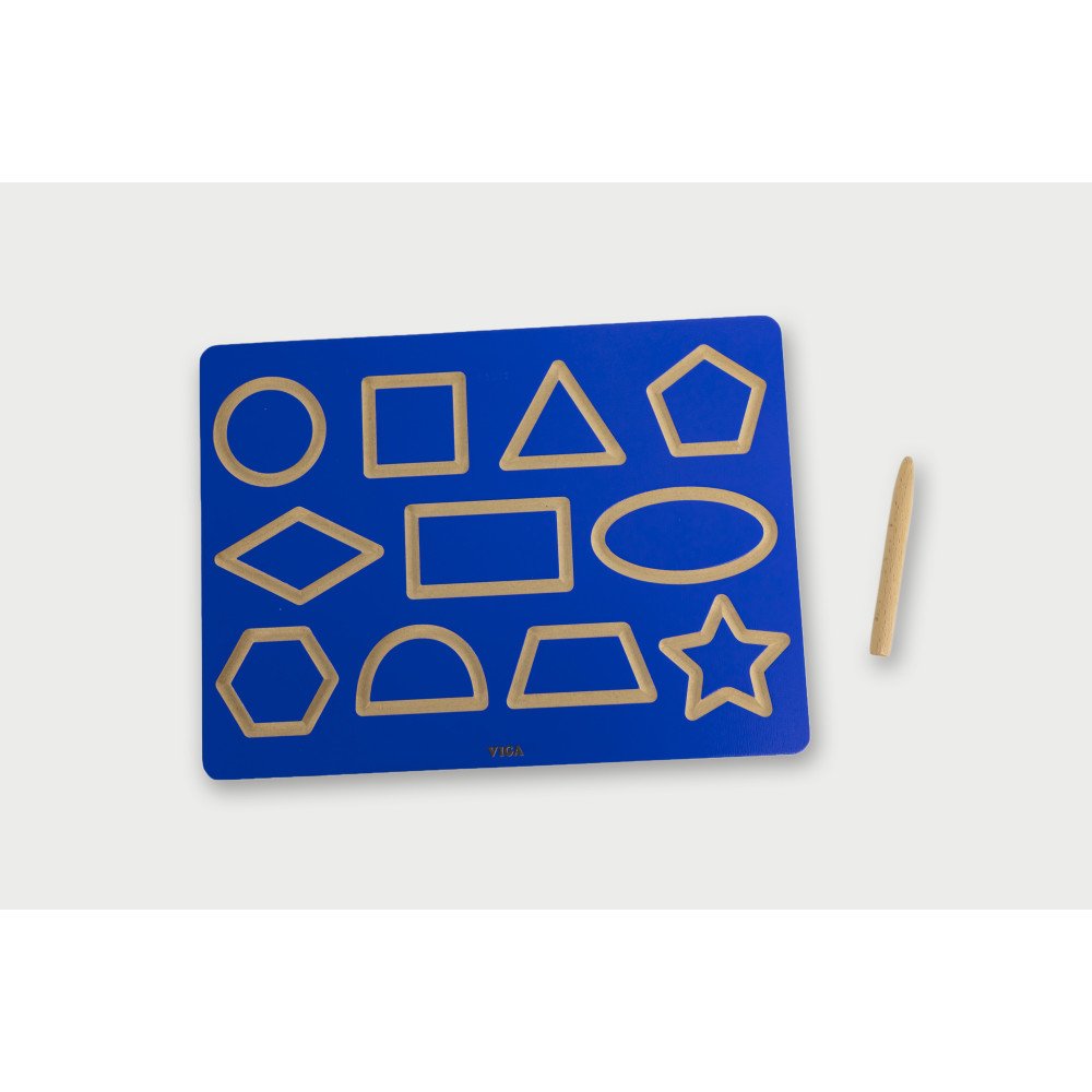Mokomoji lenta „Figūrų braižymas" padeda vaikams treniruoti pieštuko laikyseną ir stabilų rankos judesį apvedžiojant 11 skirtingų figūrų griovelius.