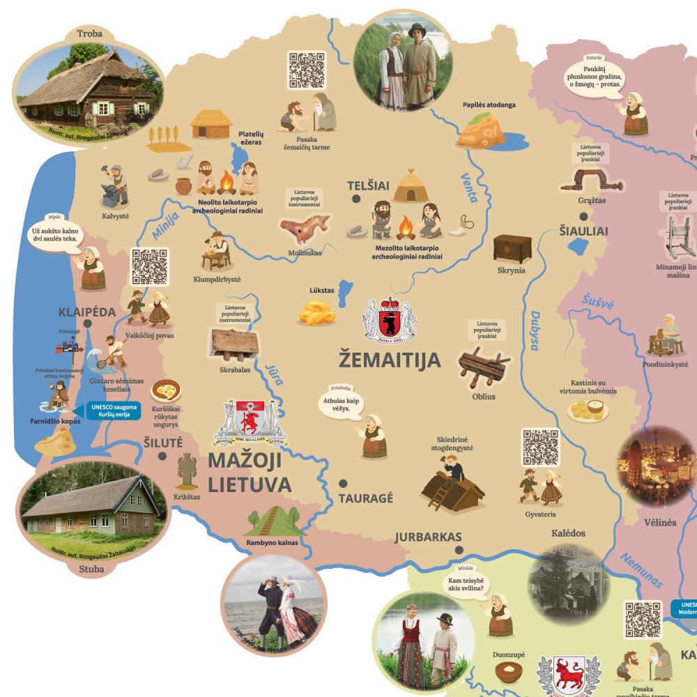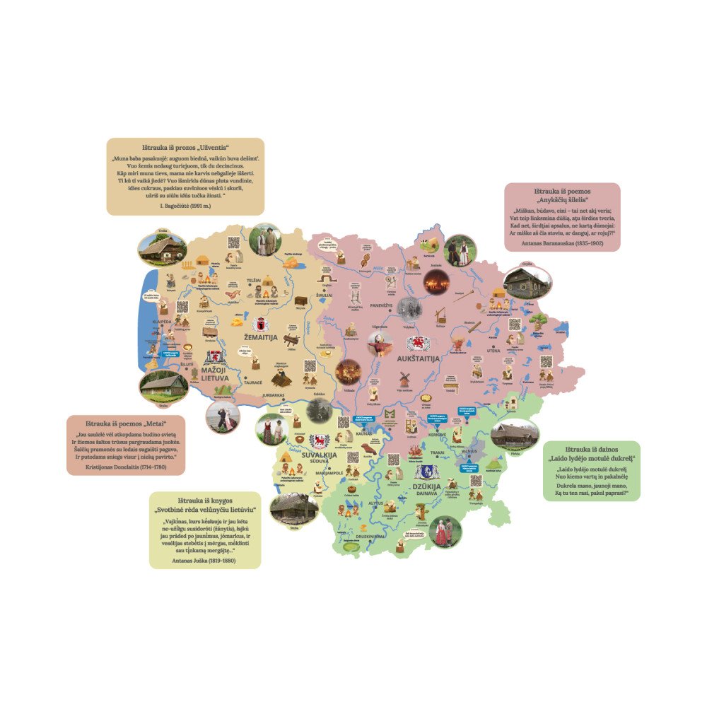 Unikalus etnografinis žemėlapis lietuvių kalba – įtraukiam ugdymui ir atradimams! Tai - interjero dekoracija, kuri įkvepia mokytis, atrasti ir didžiuotis Lietuvos kultūriniu paveldu, UNESO saugomais objektais. Puikus pasirinkimas bet kuriai erdvei, kur mokymasis susilieja su atradimais. Žemėlapis padalintas į 5 Lietuvos etnografinius regionus, kuriuose pavaizduoti ne tik didieji miestai, bet ir tam regionui ypatinga tautinė apranga su kasdienino gyvenimo detalėmis, pirmosios gyvenvietės, uniklalus kraštovaizdis ar amatai.