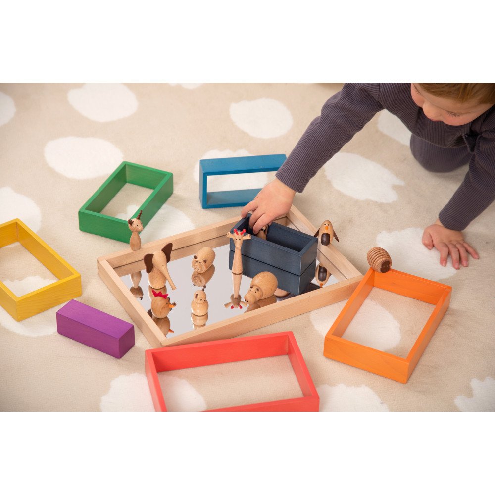 Mažas medinis veidrodinis padėklas su akriliniu pagrindu skirtas atspindžių tyrinėjimui, mažų objektų stebėjimui ir kūrybiniams žaidimams. Patogaus dydžio padėklas leidžia vaikams savarankiškai (ar kartu su draugu ar suaugusiuoju) tyrinėti daiktus iš skirtingų kampų, žaisti su šviesa ir atspindžiais, dėlioti figūrėles, gamtines medžiagas ir kurti vaizduotės scenas. Veidrodinis paviršius sustiprina vizualinį efektą, todėl veiklos tampa įtraukesnės ir padeda ilgiau išlaikyti dėmesį.