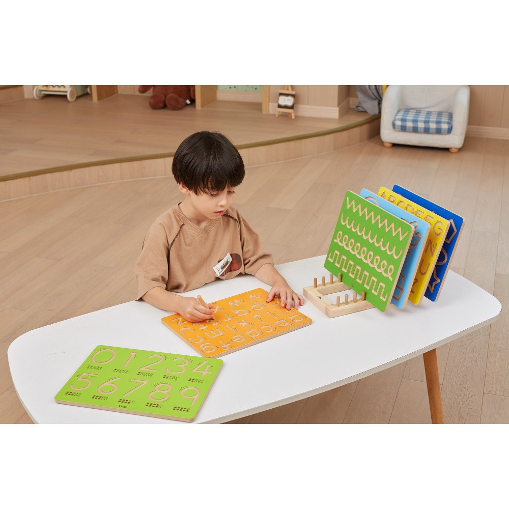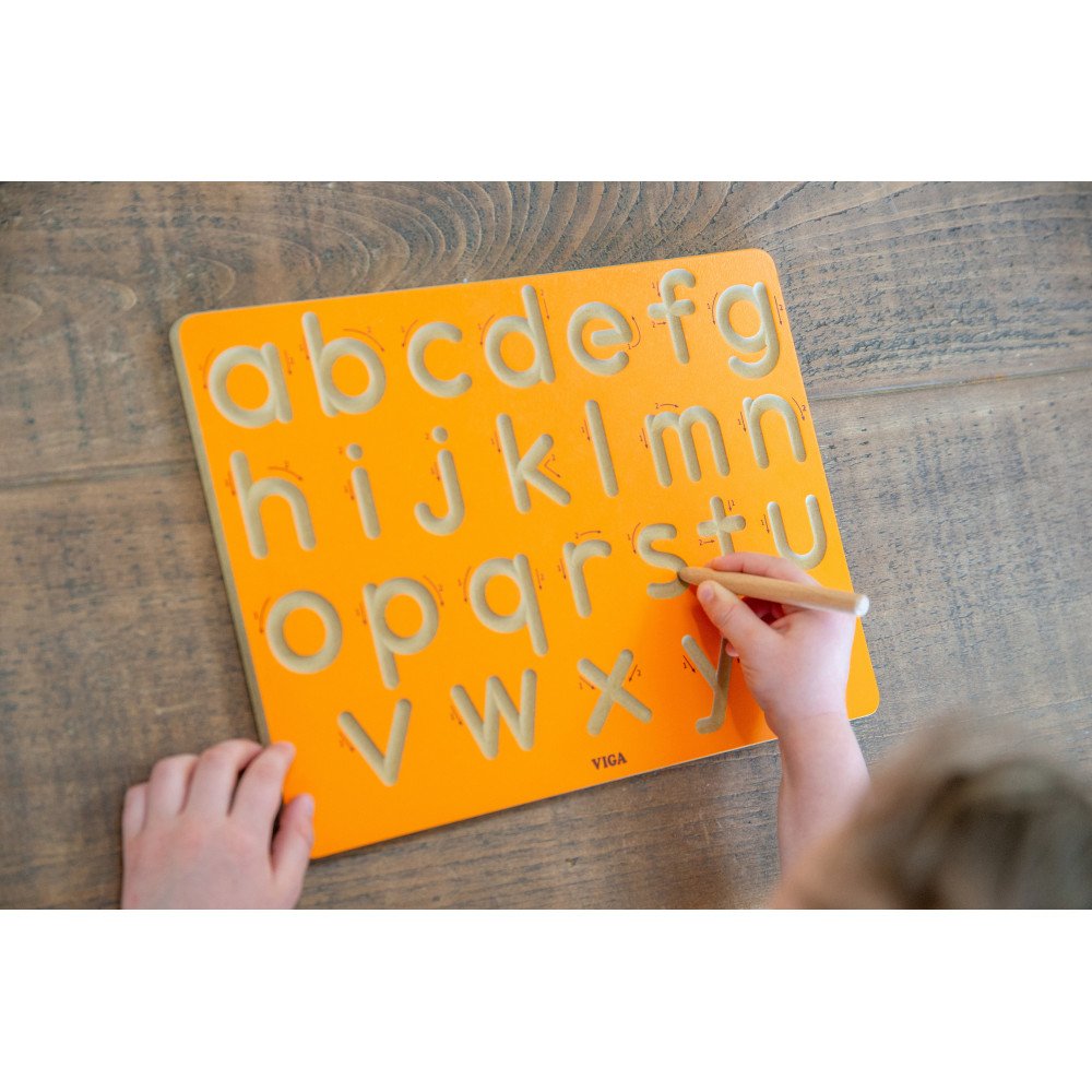 Išgraviruotos raidės sudaro aiškų takelį, kuriuo vaikas veda medinį rašiklį ar pieštuką, todėl lengviau išlaikyti kryptį, sustabdyti posūkiuose ir užbaigti raidę tvarkingai. Kartojant judesį formuojasi raumenų atmintis, o ranka pripranta prie smulkesnių, tikslių linijų, kurios būtinos rašant mažąsias raides. Rodyklės su numeriais parodo, nuo kur pradėti ir kokia seka vesti linijas, todėl vaikui lengviau išmokti taisyklingą raidžių formavimą.