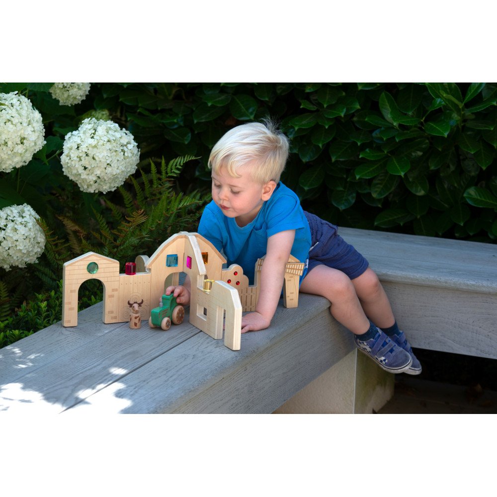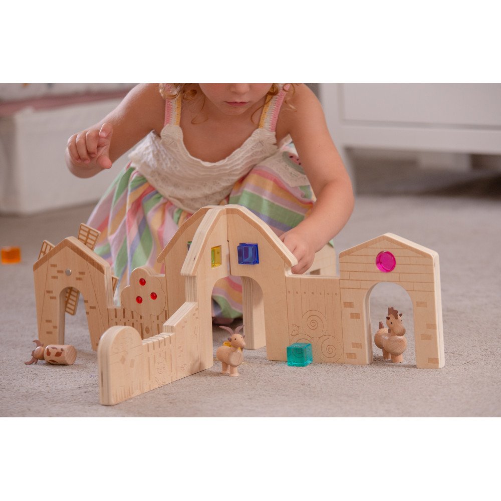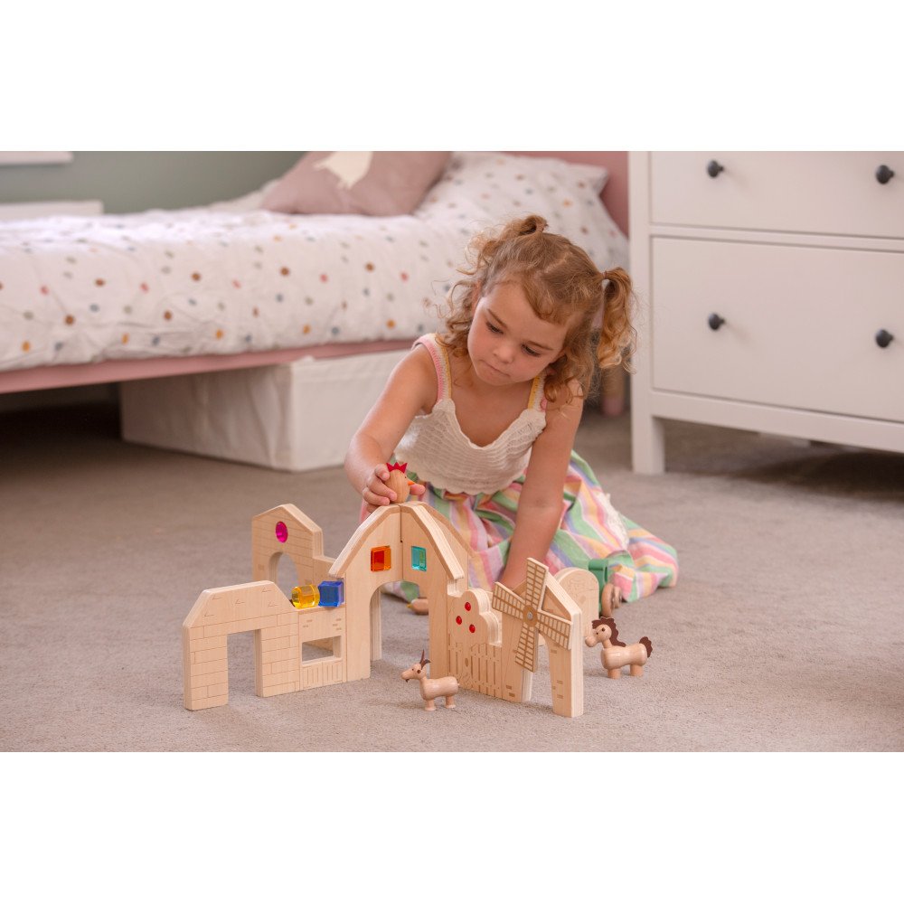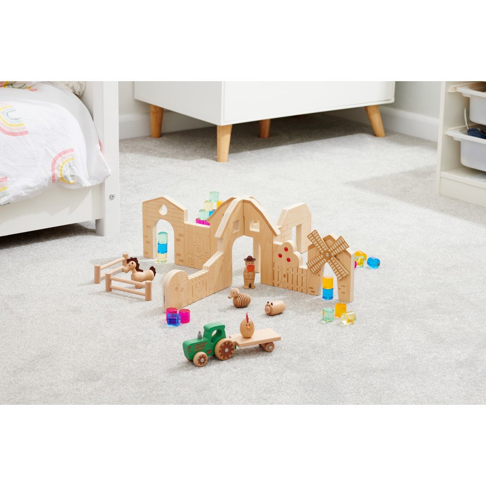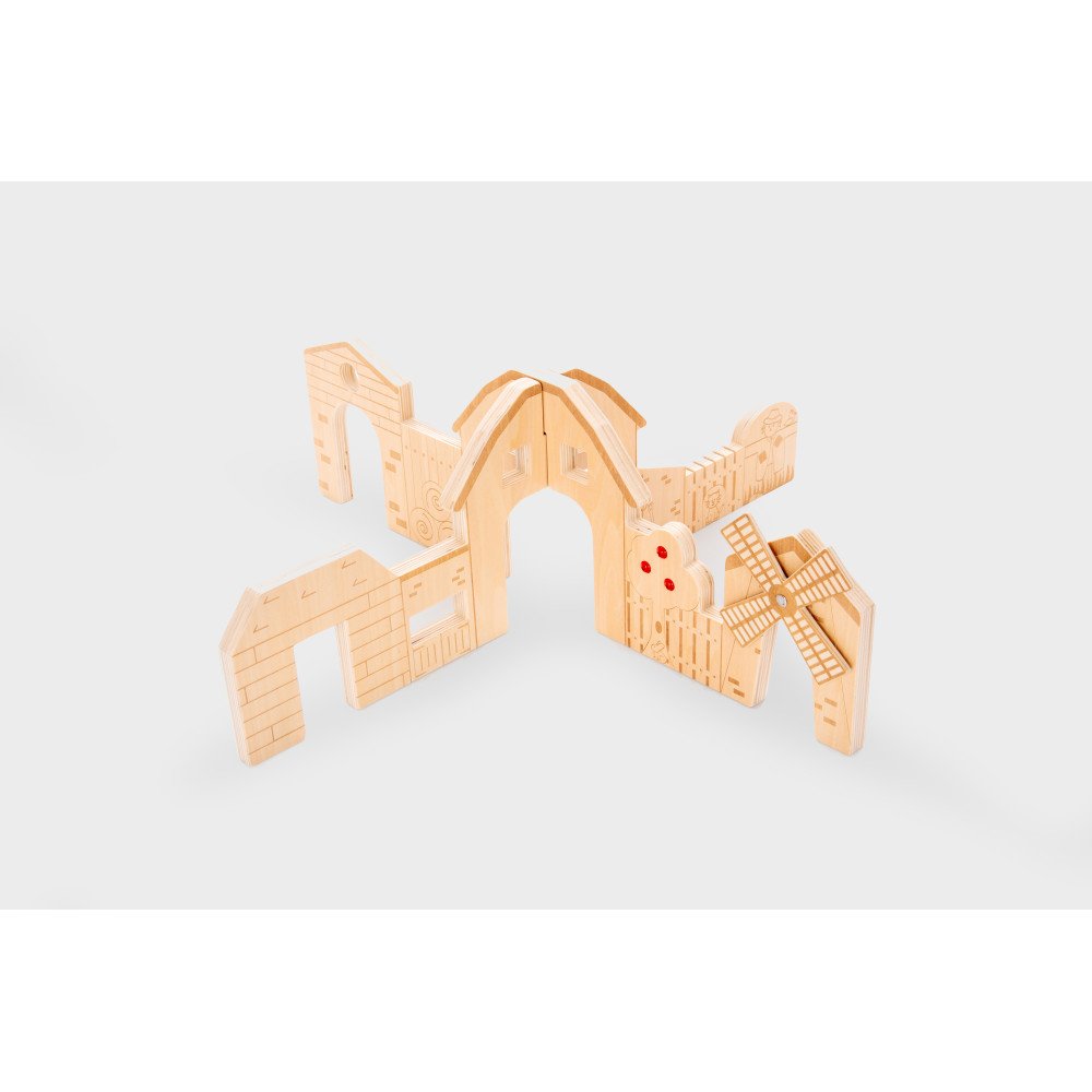 Medinė žaidimų pertvara “Ūkio pažinimas” leidžia greitai sukurti 4 zonų ūkinę sceną vaikų vaizduotės žaidimams. Dvi faneros pertvaros paprastai susistato į kryžiaus formą, todėl vienu metu atsiranda kelios erdvės skirtingoms išgalvotoms situacijoms su gyvūnams, personažais ar ūkio darbais. Lazeriu išpjautos taktilinės detalės kviečia liesti, tyrinėti ir kurti istorijas, o dekoruotas vaismedis bei judantis vėjo malūnas suteikia papildomo įsitraukimo ir sensorinio smalsumo.