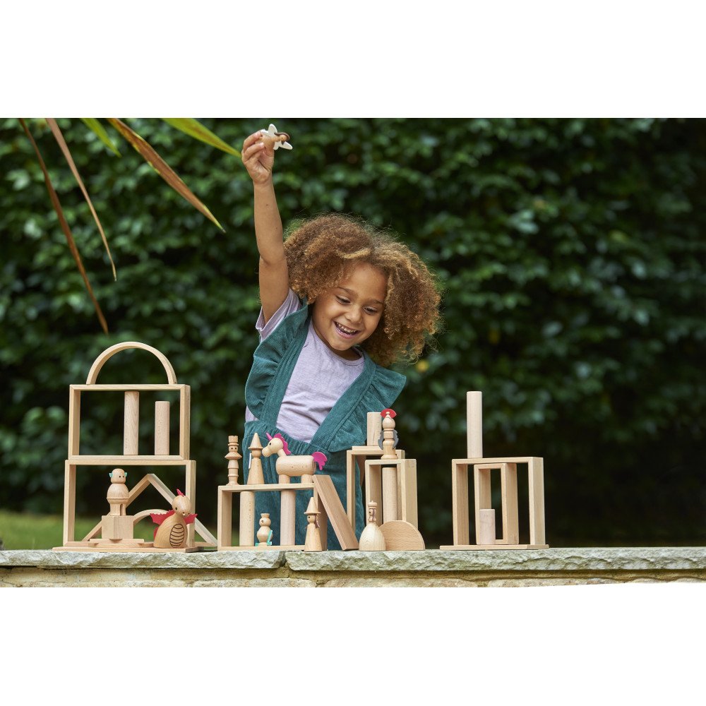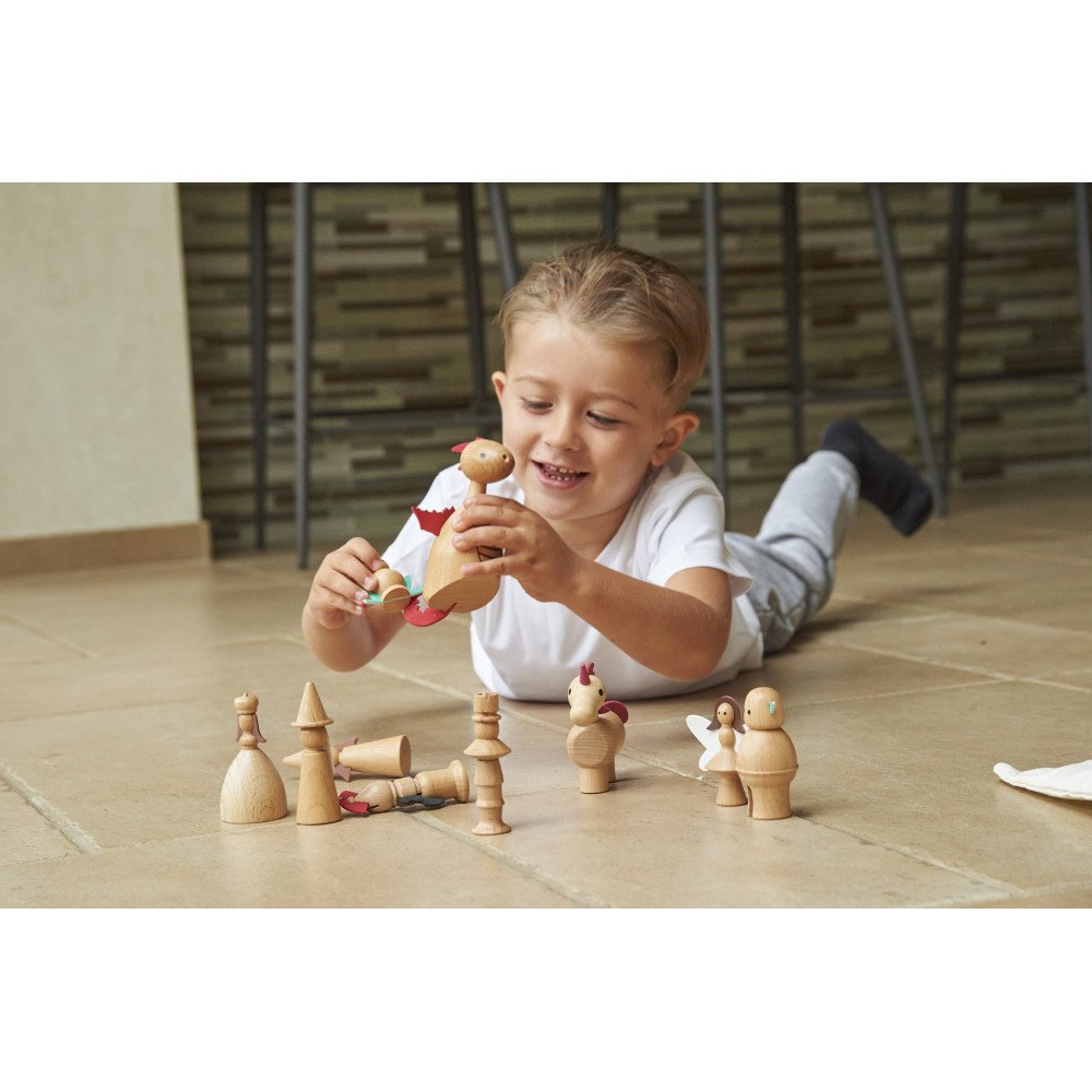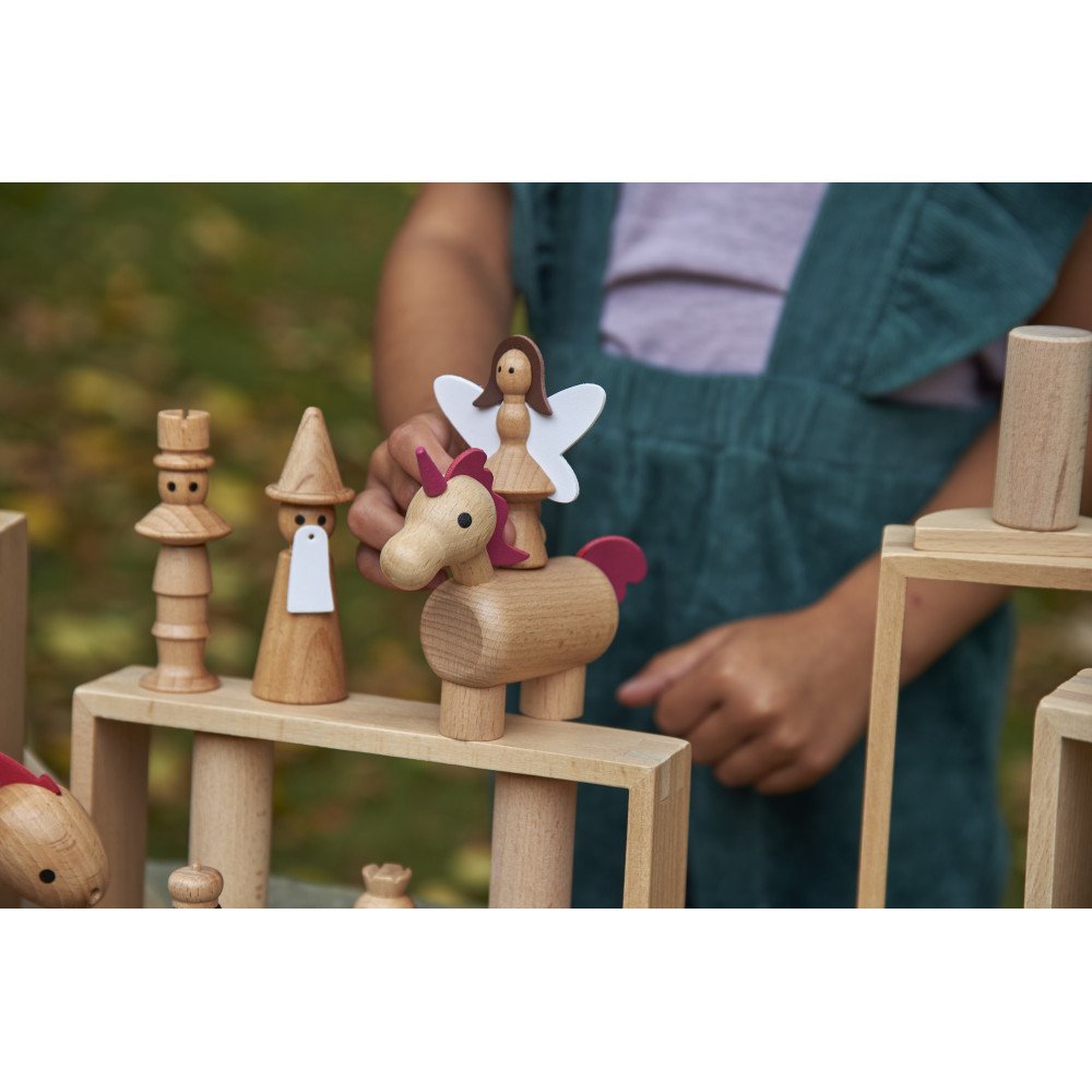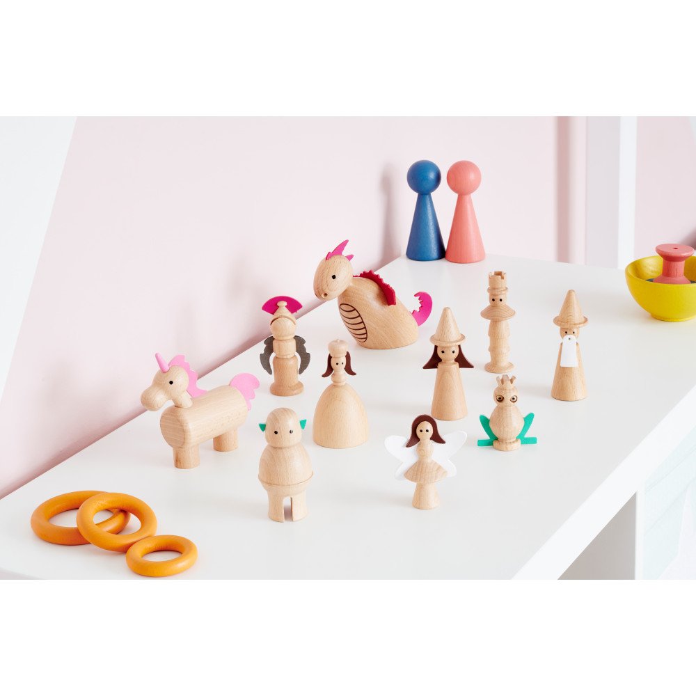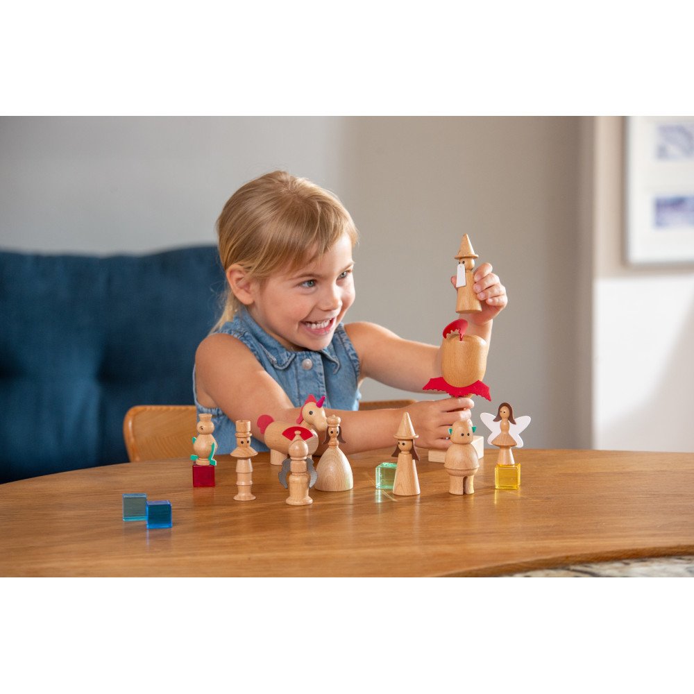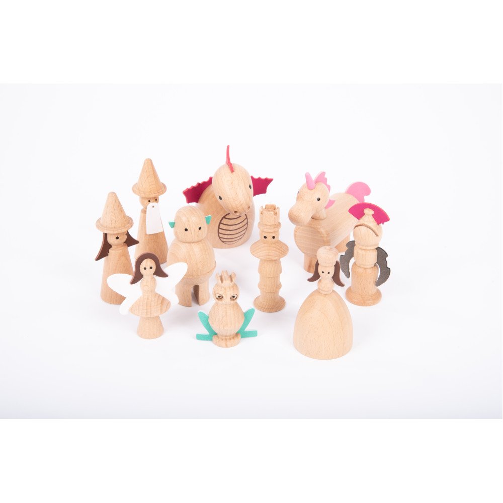 Medinės figūrėlės „Pasakų veikėjai“ (10 vnt.) sukurtos kalbos ugdymui, pasakojimams ir vaidmenų žaidimams su aiškiais personažais. Rinkinyje esantys pasakų herojai suteikia vaikams lengvą pradžią jų istorijoms: vaikas gali kurti siužetą, kalbėti už personažus, apibūdinti veiksmus ir mokytis naujų žodžių. Toks kūrybingas formatas ypač naudingas ugdymo įstaigose, nes leidžia greitai sukurti sceną pasakojimui ar užduotims, kurios lavina sakinių struktūrą, dialogus ir nuoseklų minčių dėstymą.