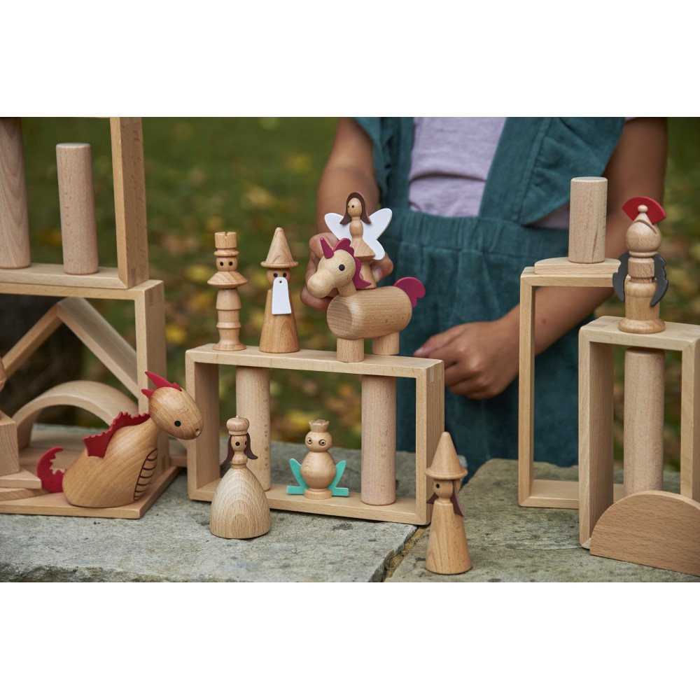 Medinės kaladėlės tinka ir grupinėms veikloms, kai vaikai pasiskirsto vaidmenis ir susitaria dėl bendros istorijos eigos. Tai padeda praktikuoti socialinį bendravimą, klausymąsi ir kalbėjimą paeiliui. Logopedijoje ir specialiajame ugdyme rinkinys gali būti naudojamas kaip aiški priemonė pasakojimui, klausimų–atsakymų užduotims, emocijų ir situacijų aptarimui, ypač kai vaikui lengviau kalbėti turint konkretų personažą rankoje. Figūrėlių rinkinį galima suderinti su medine pertvara „Pilies pažinimas“, kad kiekvienas vaikas gautų erdvę nuosavų istorijų kūrybai.