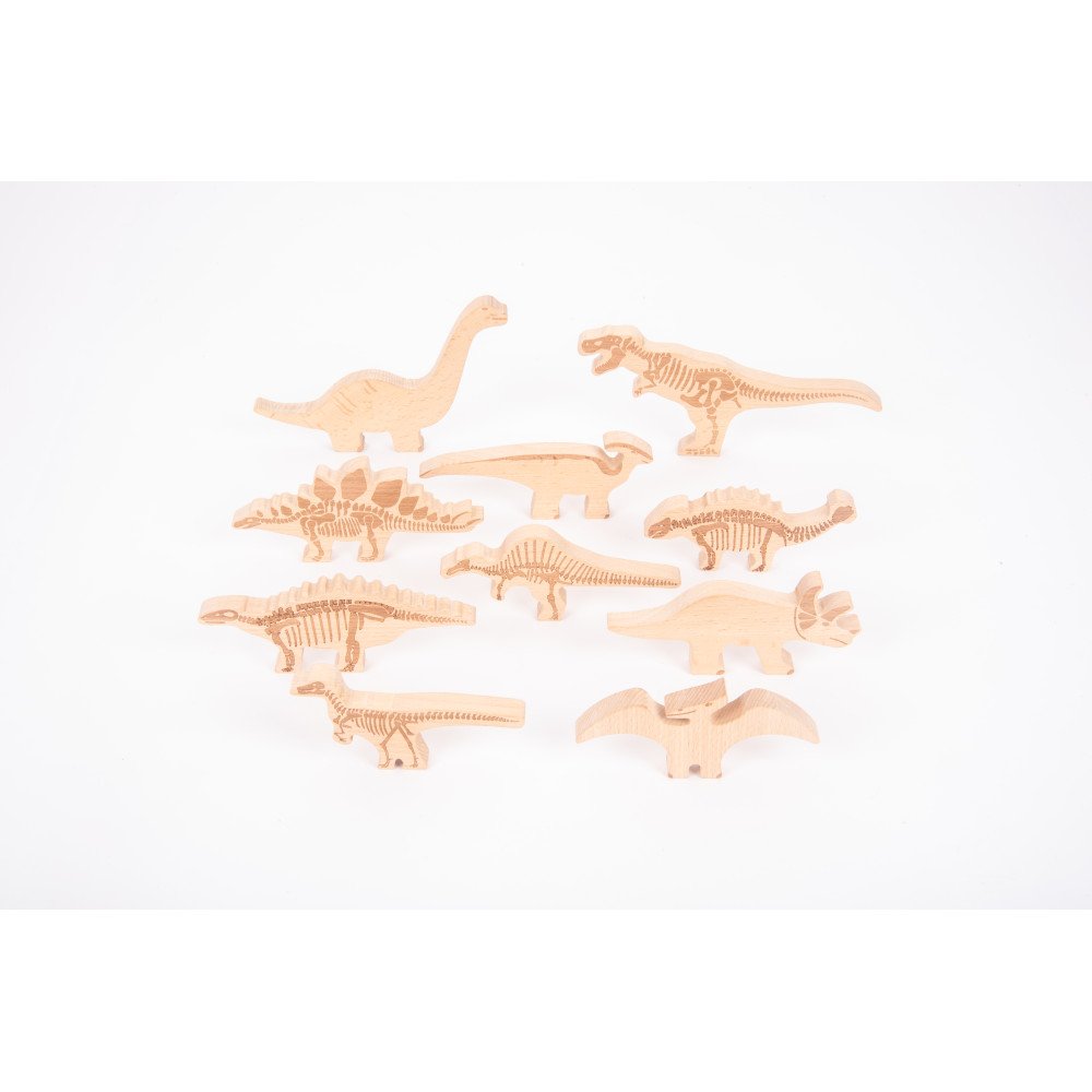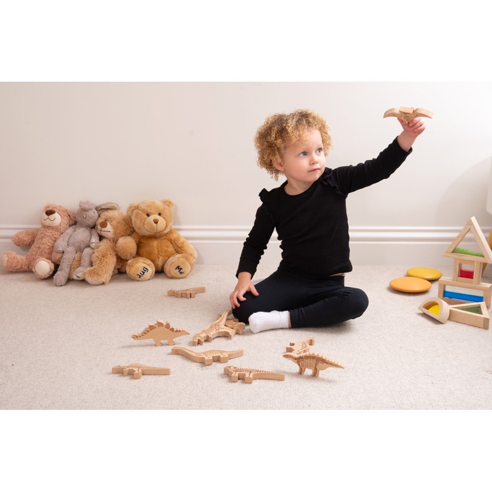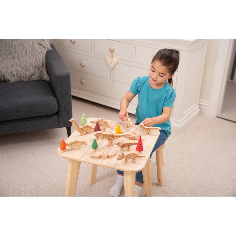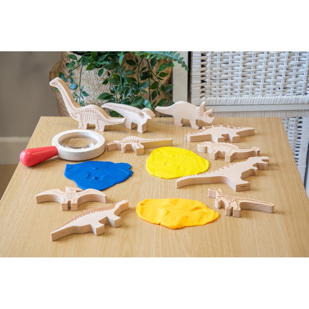Figūrėlių skeleto ypač tinka pieštuko ar kreidelės trynimo technikai po popieriumi, kai vaikas išryškina kaulų formas ir atranda dinozauro struktūrą. Blokelius galima naudoti ir spaudiniams ant plastilino, kinetinio smėlio ar modelino, taip suteikiant dar daugiau reljefinių pojūčių. Rinkinys papildo dera su mediniais stalo skirtukais „Dinozaurų pažinimas”, tačiau taip pat puikiai veikia kaip atskira sensorinė ir kūrybinė priemonė namams ar ugdymo įstaigoms.