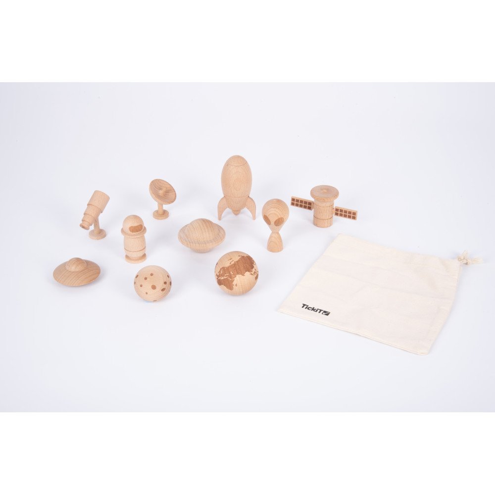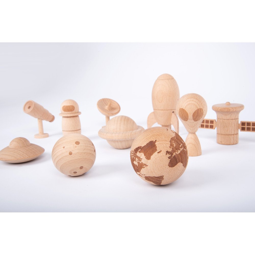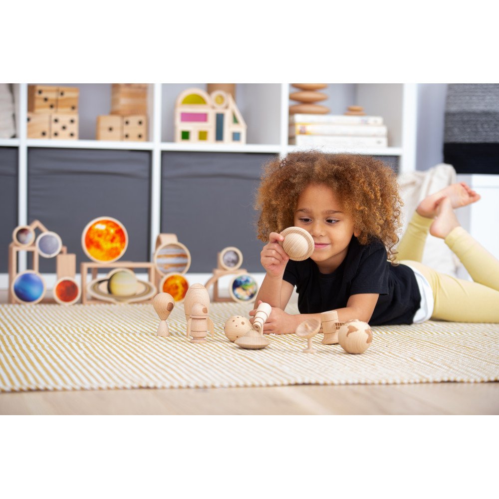 Medinės kaladėlės vaikams „Visatos pažinimas“ (10 vnt.) padeda vaikams kurti pasakojimus, dialogus ir plėsti savo žodyną. Rinkinyje esantys objektai sudaro aiškią sceną pasakojimui: astronautas, raketa, ateivis, erdvėlaivis, teleskopas, palydovas, Žemė, Mėnulis, planeta su žiedu ir palydovinė antena. Vaikui lengva pradėti žaidimą, nes jis turi konkrečius personažus ir veiksmus, todėl natūraliai atsiranda istorijos apie skrydį, misiją, atradimus ir bendravimą. Išgraviruotos detalės suteikia taktilinį pojutį, padeda vaikams apibūdinti tai, ką mato, ir mokytis naujų žodžių, susijusių su kosmosu, planetomis ir tyrinėjimu.