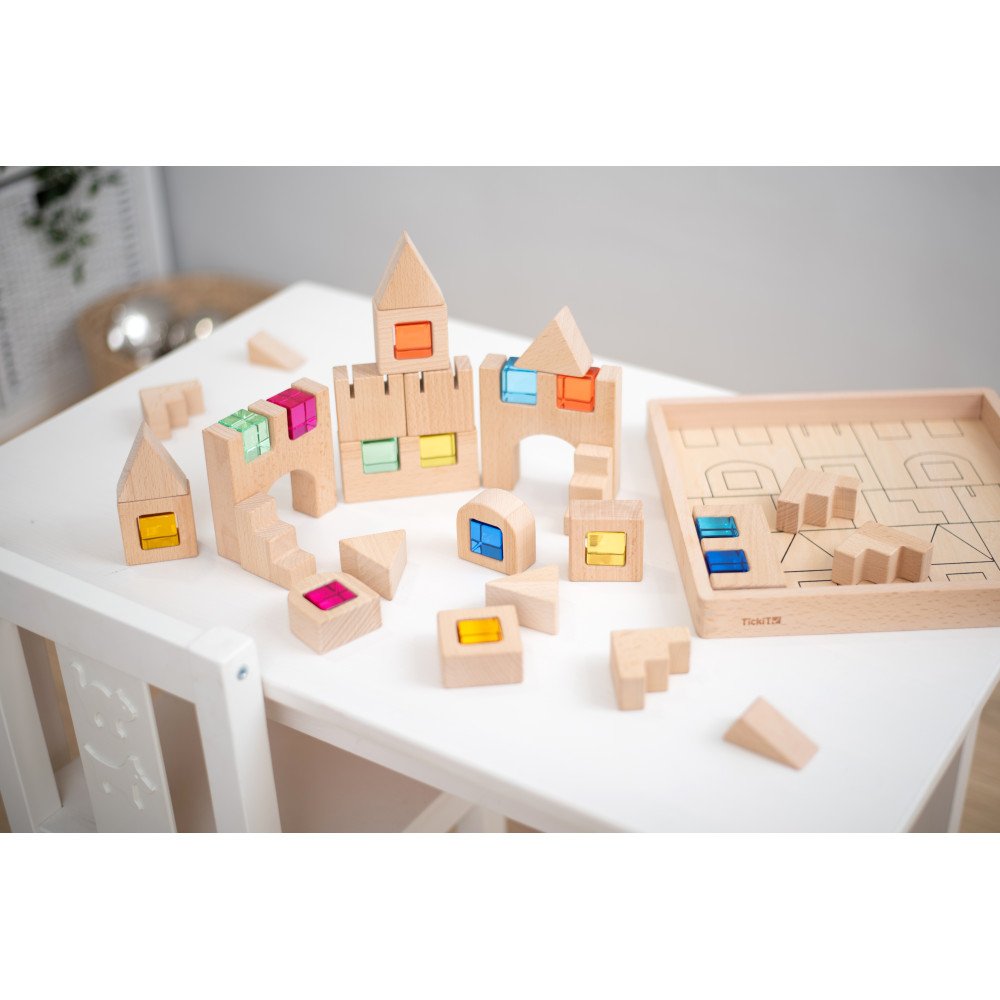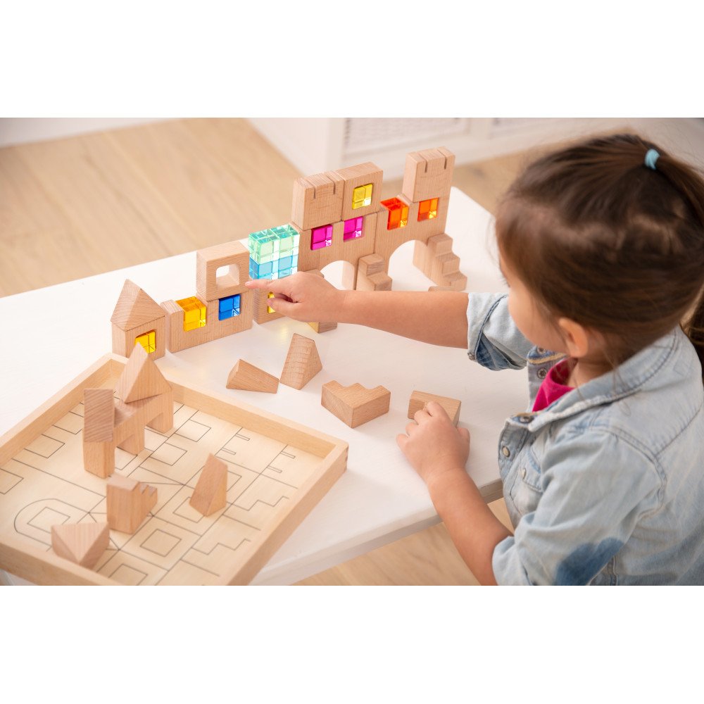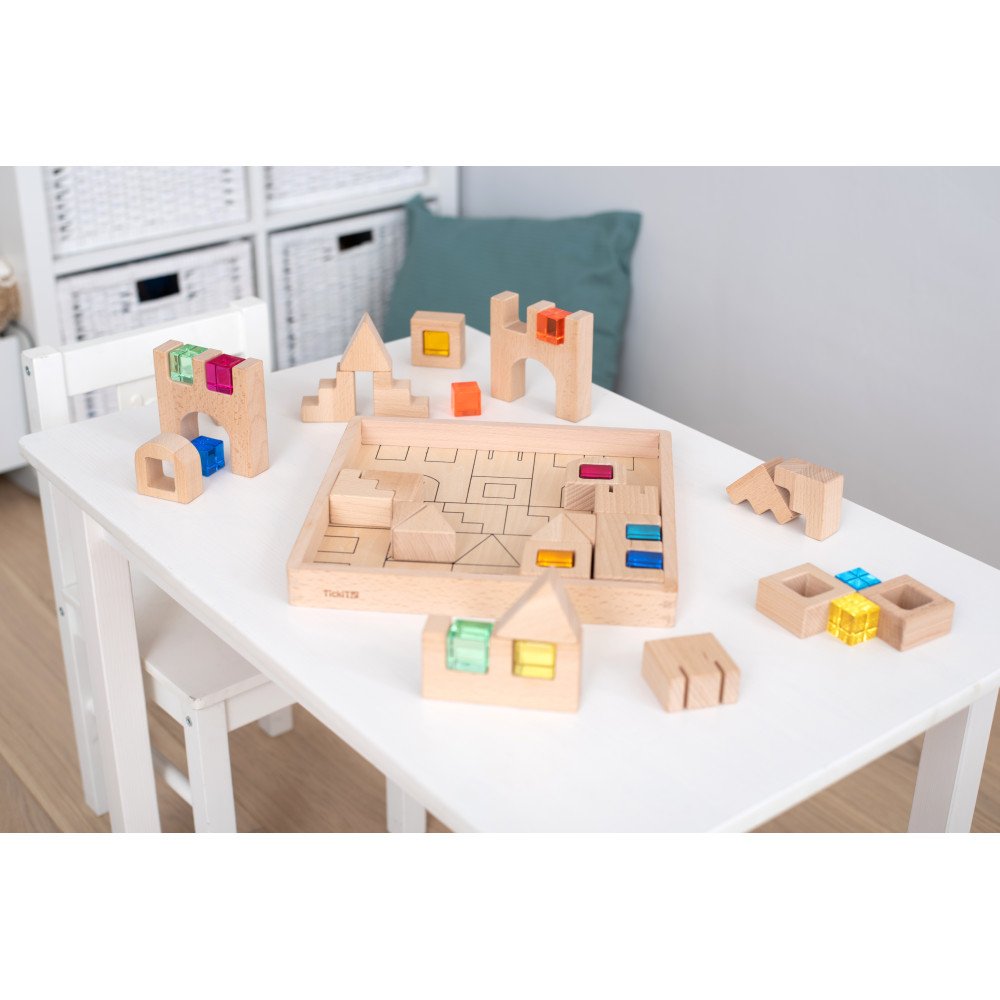 Skaidrūs spalvoti kubeliai pagauna šviesą, todėl vaikai noriai juos naudoja kaip langus, duris ar dekoracijas savo statiniuose, o suaugusieji gali įtraukti spalvų rūšiavimą ir raštų kūrimą į laisvalaikio užsiėmimus. Laikymo padėklas su pažymėtomis kaladėlių vietomis padeda greitai susitvarkyti po veiklos ir palaikyti struktūrą, kuri daugeliui vaikų palengvina savarankišką darbą.
