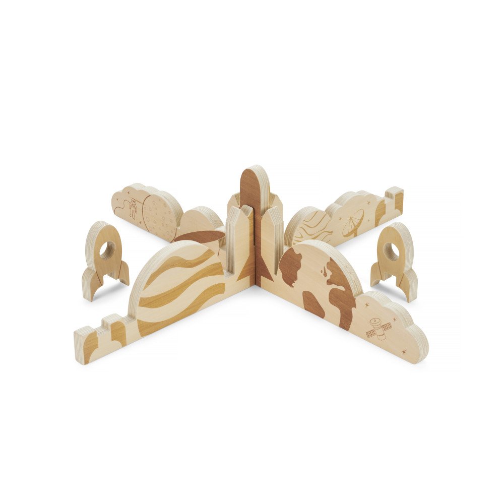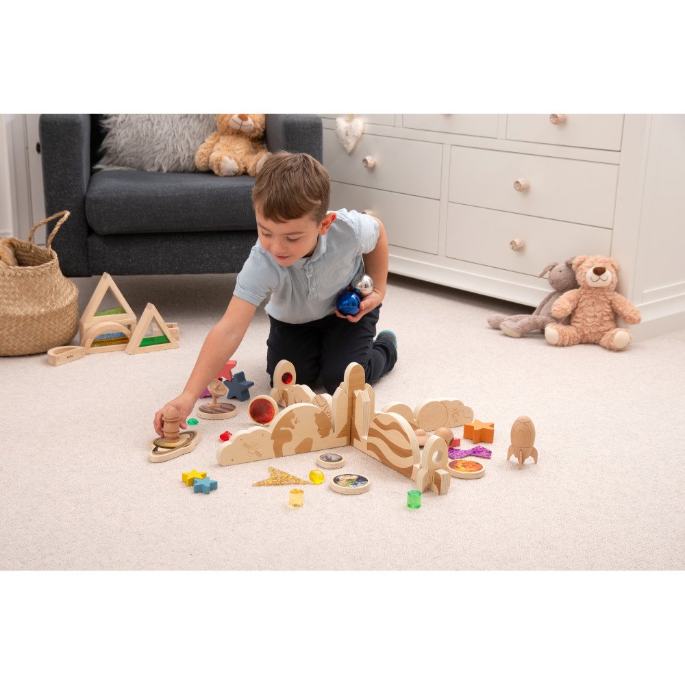 Medinės pertvaros grupiniams žaidimams „Visatos pažinimas” padeda vaikams kurti kosmoso scenas, kurios skatina kalbą, pasakojimą ir bendravimą. Ant beržo faneros lazeriu išgraviruoti taktiliniai kosmoso vaizdai – planetos, raketos, palydovas ir astronautas – suteikia aiškią temą, todėl vaikui lengviau pradėti kalbėti, apibūdinti veiksmus ir kurti nuoseklias istorijas. Tokios mažybinės scenos padeda plėsti žodyną, mokytis dialogų ir sakinių kūrimo, o skirtuvų tema ypač patraukli vaikams, kurie įsitraukia į vaidmenų žaidimus per techniką ir nuotykius.