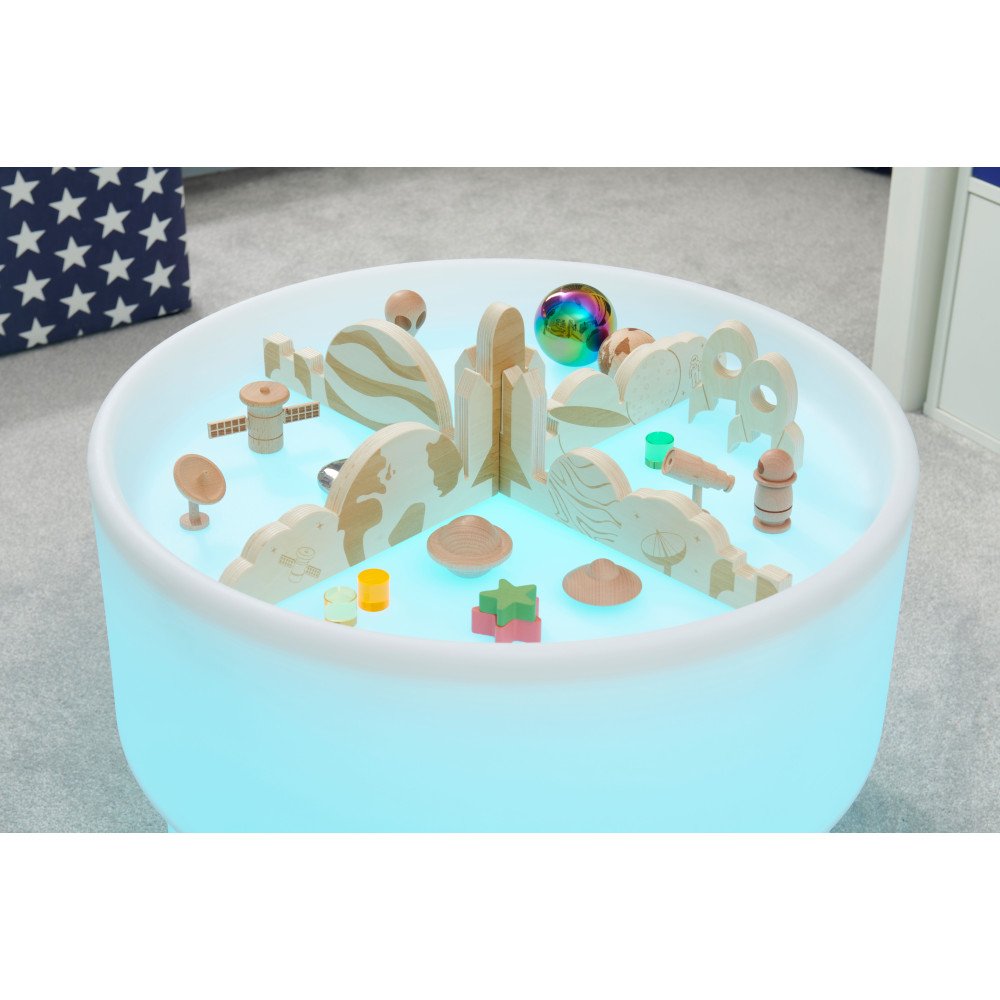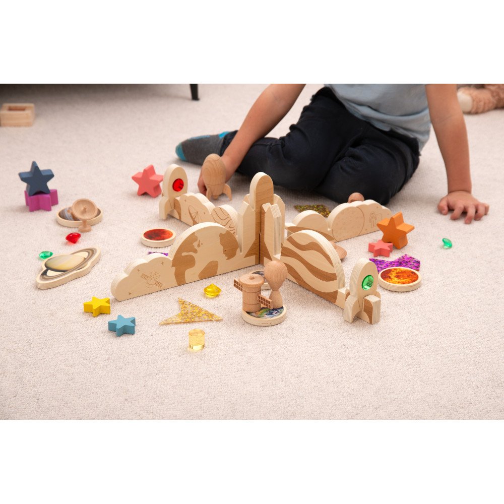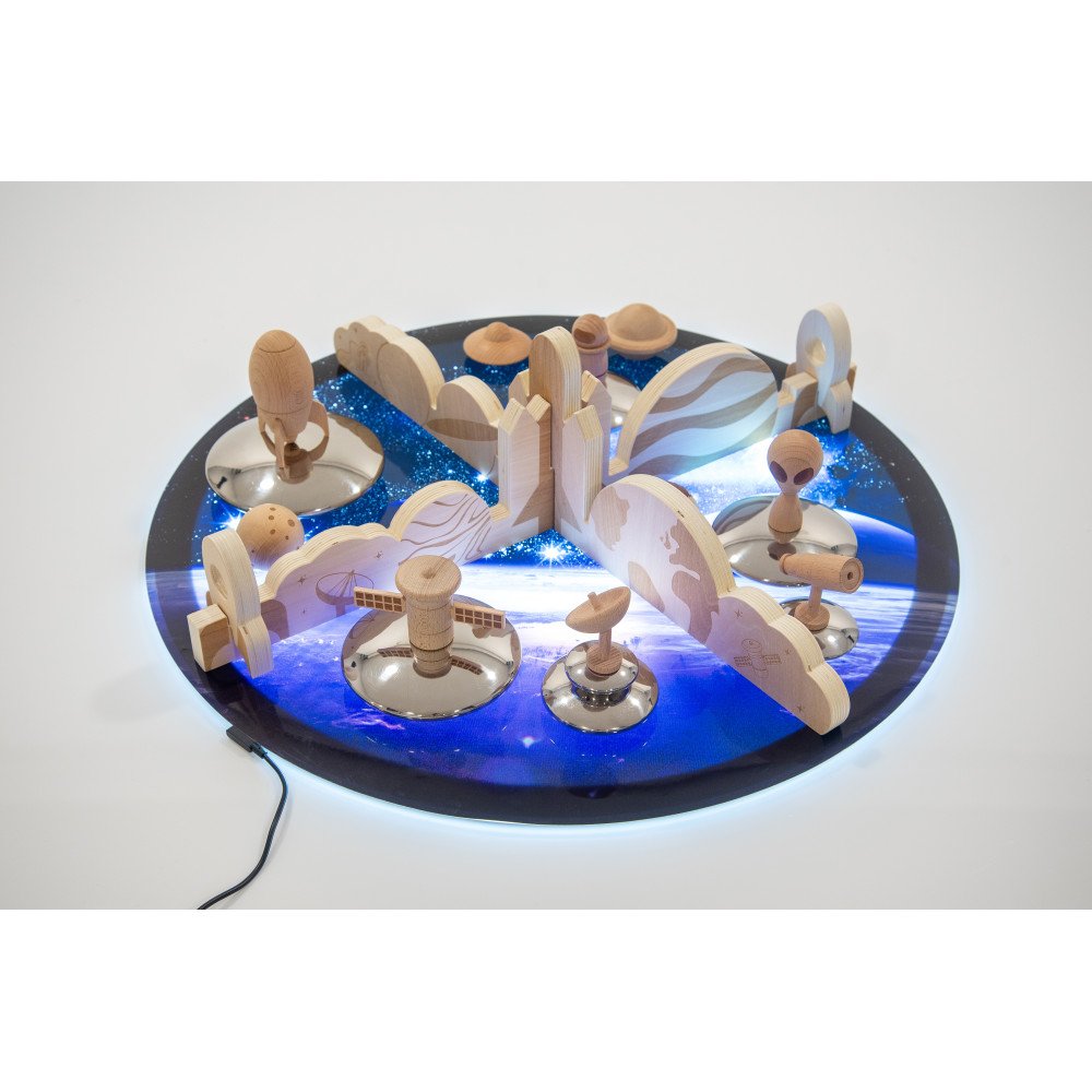 Mediniai žaidimų skirtuvai ypač naudingi ugdymo įstaigose, sensorinio kambaryio veiklose ar specialių poreikių vaikams, kai reikia aiškaus rėmo bendravimui. Logopedijoje ir specialiajame ugdyme jos gali būti naudojamos kaip vizualus pagrindas pasakojimams, klausimų – atsakymų žaidimams ir situacijų kūrimui, kai vaikui lengviau kalbėti turint prieš akis aiškų vaizdą. Pertvaros tinka naudoti tiek ant šviesos stalų, tiek ant grindų, o dvi papildomos raketos suteikia dar vieną elementą įtraukioms istorijoms kurti.