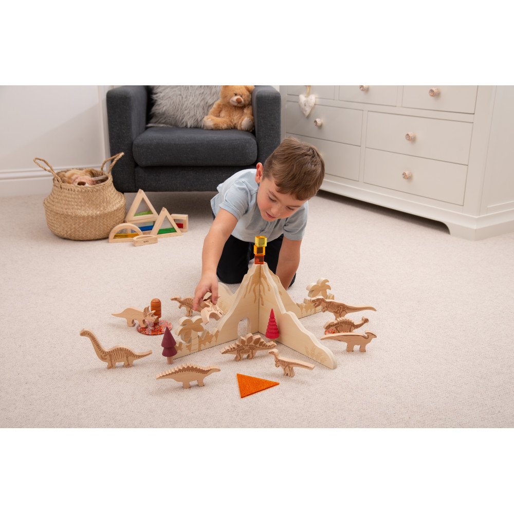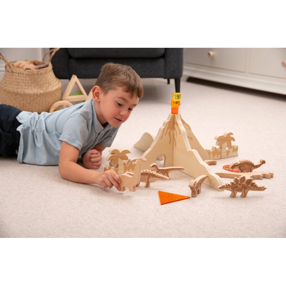 Mediniai stalo skirtukai „Dinozaurų pažinimas” leidžia greitai paruošti juros periodo sceną individualiems žaidimams ugdymo įstaigose. Dvi beržo faneros pertvaros paprastai susistato tarpusavyje, todėl jos tinka pamokos ar veiklos laikui, kai svarbu greitas paruošimas ir greitas susitvarkymas po užsiėmimo. Lazeriu išgraviruoti taktiliniai elementai – medžiai, paparčiai ir lava – sukuria aiškią temą, o centrinė ugnikalnio forma tampa patraukliu vizualiniu akcentu tyrinėjimo ir pokalbio veikloms.