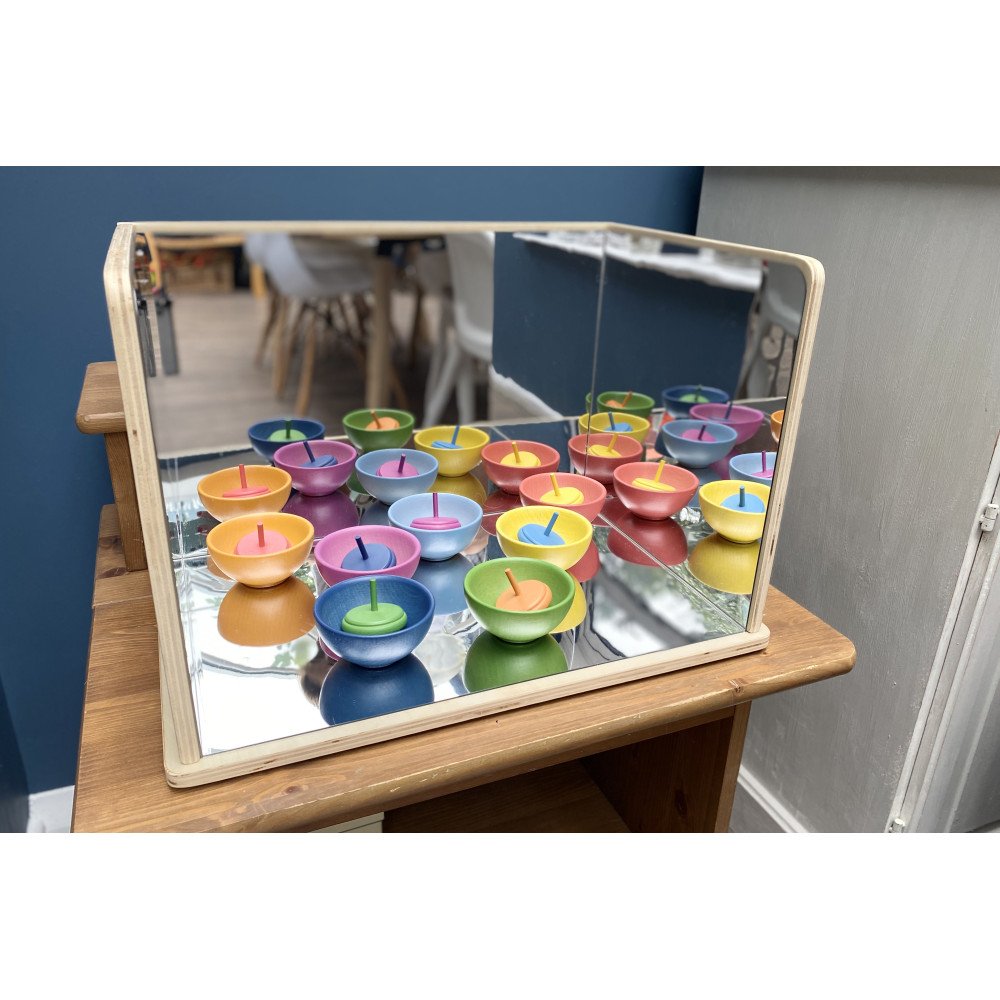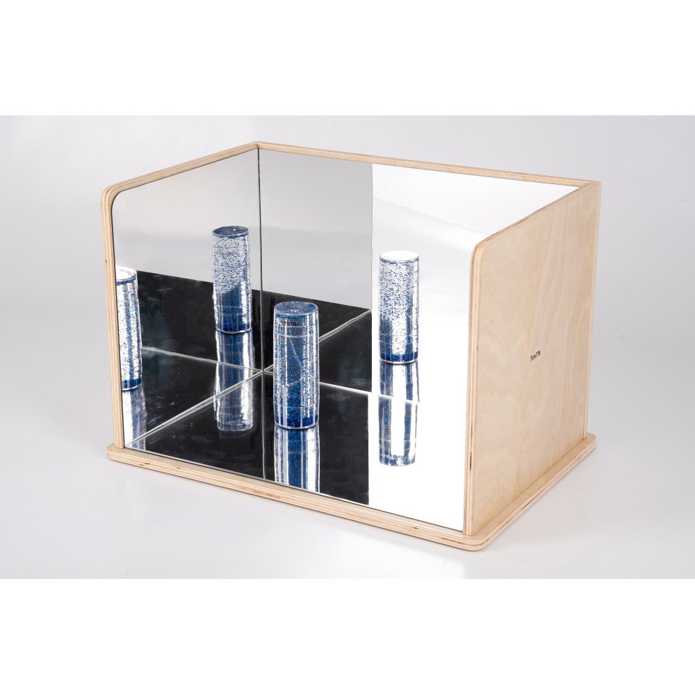 Medinis tyrinėjimo veidrodis – atspindžių ir vaizduotės žaidimams. Vizualiai įtraukianti ugdomoji priemonė, leidžianti vaikams tyrinėti atspindžių pasikartojimą, veidrodžio efektus ir objektų vaizdus iš skirtingų perspektyvų. Dėl lygiagrečių veidrodžių išdėstymo objektai atsispindi pirmyn ir atgal, sukurdami begalybės įspūdį, kuris natūraliai žadina smalsumą ir skatina tyrinėjimą.