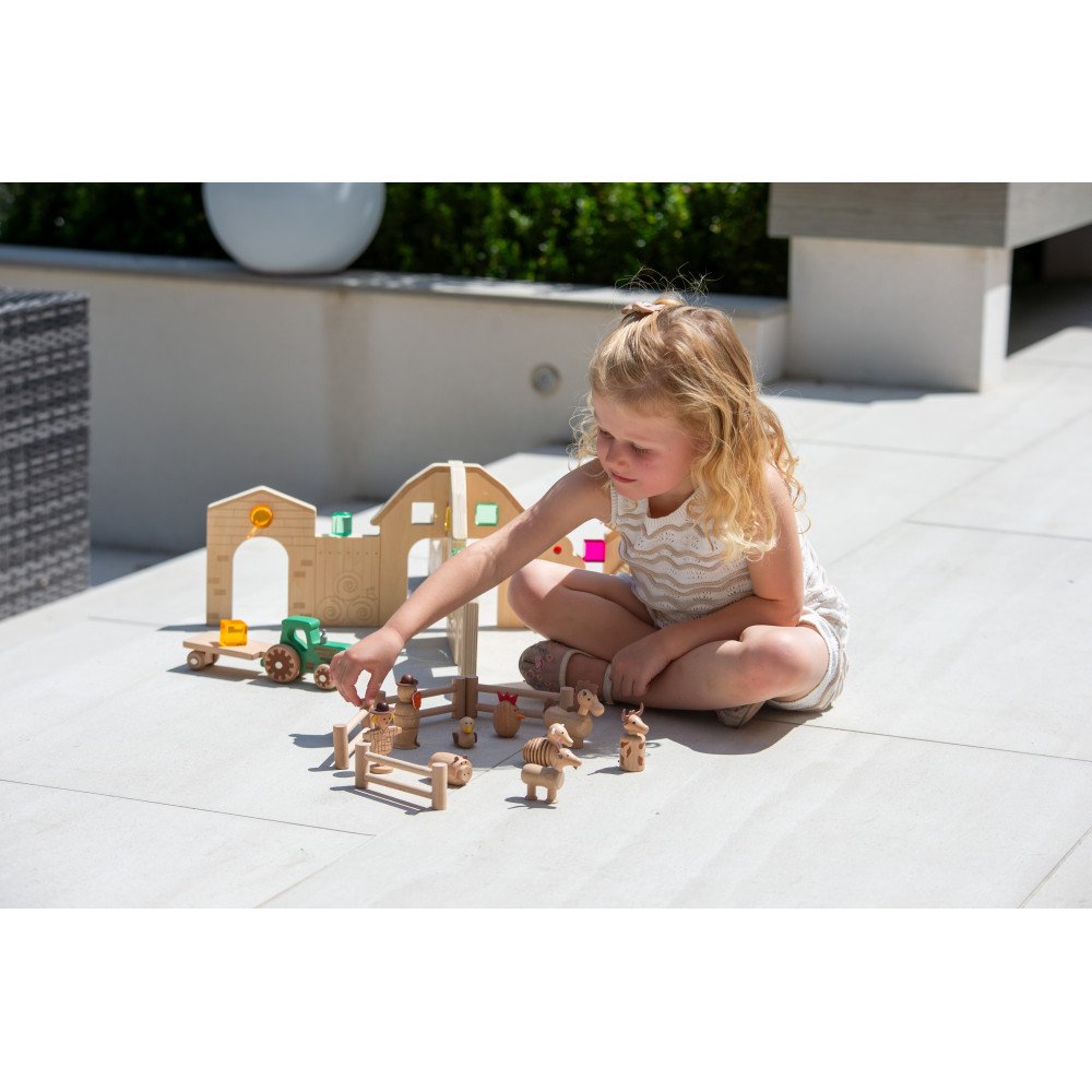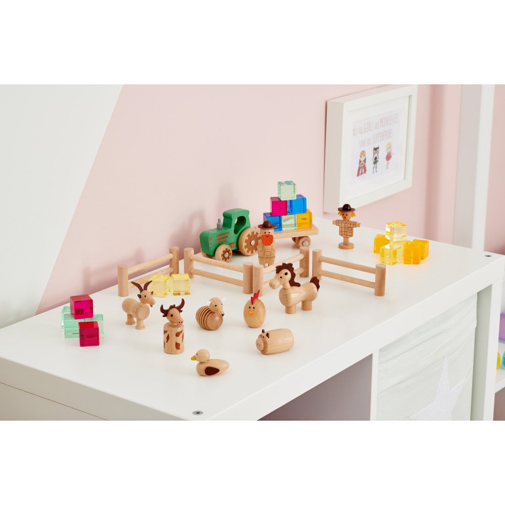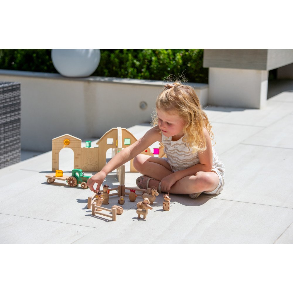 Medinių kaladėlių rinkinys „Ūkio pažinimas” (15 vnt.) – medienos figūrėlės ūkio scenoms, pasakojimams ir vaidmenų žaidimams. Paprastos, vaikui lengvai atpažįstamos detalės padeda greitai pradėti žaidimą, o judančios dalys ir dirbtinės odos akcentai suteikia papildomo įsitraukimo bei taktilinio pojūčio. Komplekte yra traktorius su priekaba, ūkininkas ir daugelis gyvūnu bei 4 tvoros segmentai, todėl vaikas gali iš karto susikurti aiškią ūkio aplinką žaidimams.