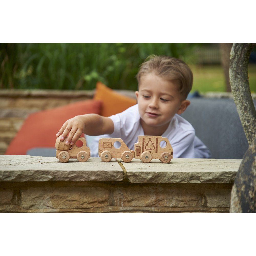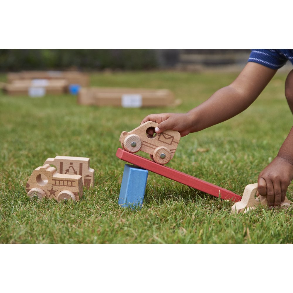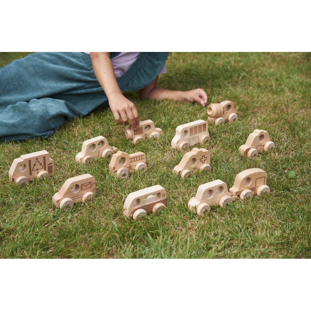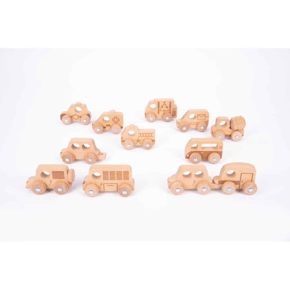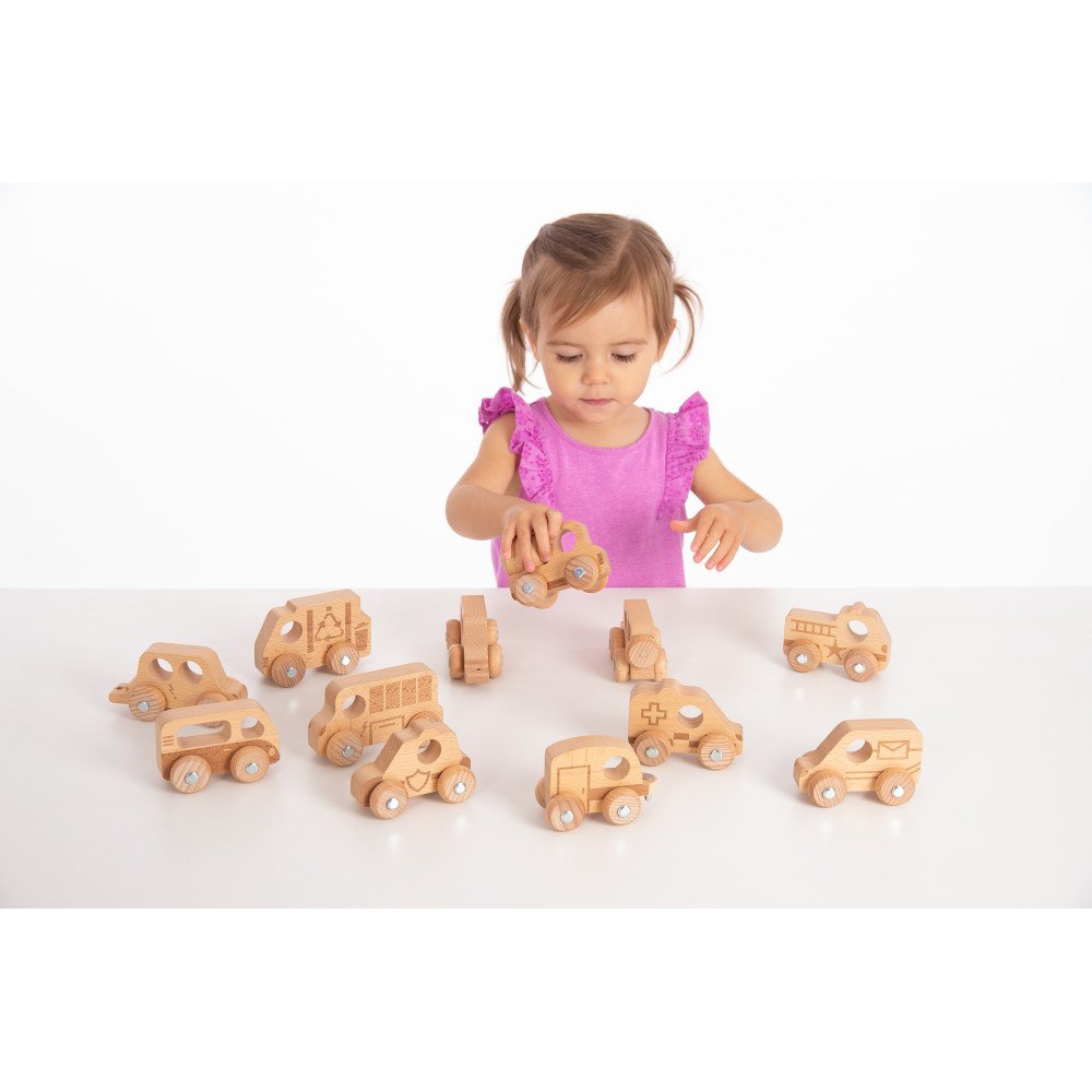 Medinių mašinėlių rinkinys “Miesto pažinimas” (12 vnt.) lavina smulkiąją motoriką ir rankų–akių koordinaciją per judėjimą ir tikslų valdymą. Kiekviena transporto priemonė turi 4 besisukančius ratukus ir metalines ašis, todėl vaikas gali stumti, ridenti, manevruoti, sustoti ir vėl pajudėti. Tokie veiksmai treniruoja pirštų kontrolę, riešo stabilumą ir tikslumą, o lazeriu įspaustos linijos suteikia lengvą reljefą, kurį patogu apčiuopti ir suimti.