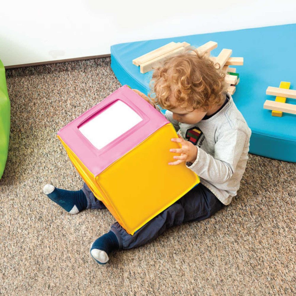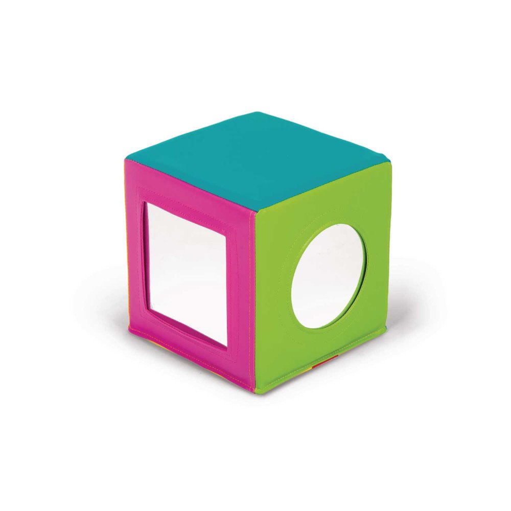 Minkštas sensorinis kubas su veidrodėliais – tai daugiafunkcė ugdomoji priemonė, skirta ankstyvajam vaikų sensoriniam ir pažintiniam vystymuisi. Kubas pagamintas iš patvarių, saugių medžiagų, o kiekviena jo sienelė yra skirtingos spalvos. Keturiuose kubo paviršiuose integruoti dideli, saugūs akriliniai veidrodėliai skirtingų geometrinių formų – kvadrato, apskritimo, stačiakampio ir trikampio.