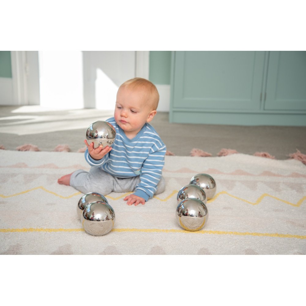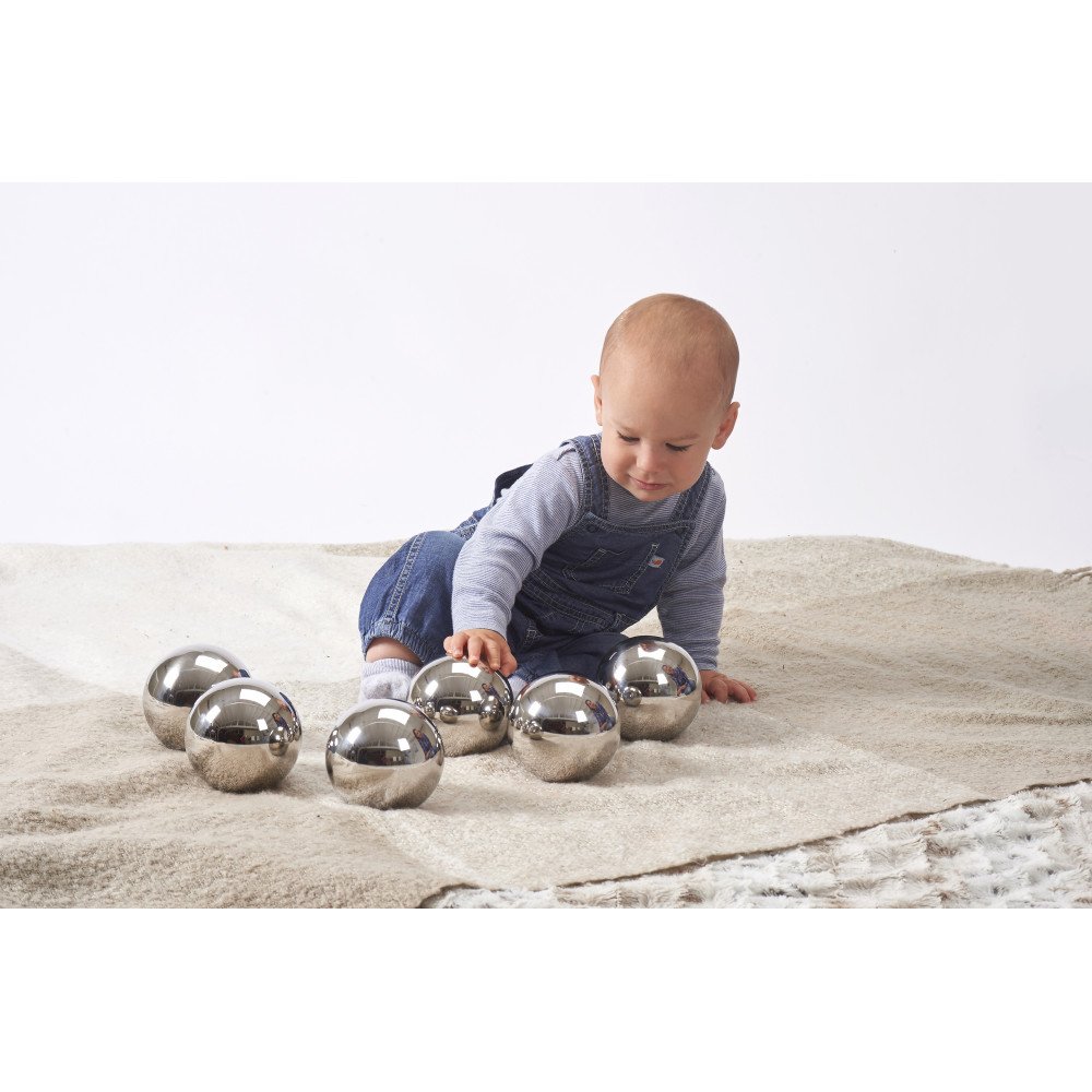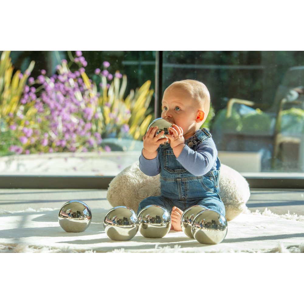 Nors visi šeši kamuoliai atrodo panašiai, kiekvienas elgiasi skirtingai: vienas rieda svyruodamas, kitas negali tiesiai tiesiai, dalis skleidžia barškėjimo garsą, o kiti išlieka tylūs, bet skiriasi pojūtis sukant ar kratant. Vaikai natūraliai lygina, kuris kamuolys garsesnis, kuris sunkiau nuspėjamas, kaip pasikeičia judėjimas ant skirtingo paviršiaus. Veidrodinis paviršius dar labiau įtraukia – atspindys keičiasi su kiekvienu pasukimu, atsiranda šviesos blyksniai, matosi pasikeitęs vaizdas, todėl žvilgsnis ilgiau išlieka sutelktas į veiklą.