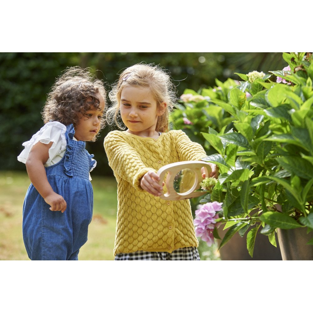 Padidinimo stiklas vaikams padeda vaikams pastebėti smulkias detales ir mokytis stebėti aplinką iš arčiau. Didinamojo stiklo lęšiai suteikia 2 kartų arba 3 kartų padidinimą, todėl vaikas gali palyginti, kiek daugiau matosi priartinus vaizdą. Stebint lapo gyslas, akmens faktūrą, audinio siūlus ar smulkius taškelius ant daikto, vaikas mokosi ieškoti detalių ir pastebėti skirtumus, kurių plika akimi nesiamto. Tvirta medinė rankena su dviem laikymo vietomis leidžia mažoms rankoms stabiliai laikyti didinamąjį stiklą ir tiksliai nukreipti į objektą.