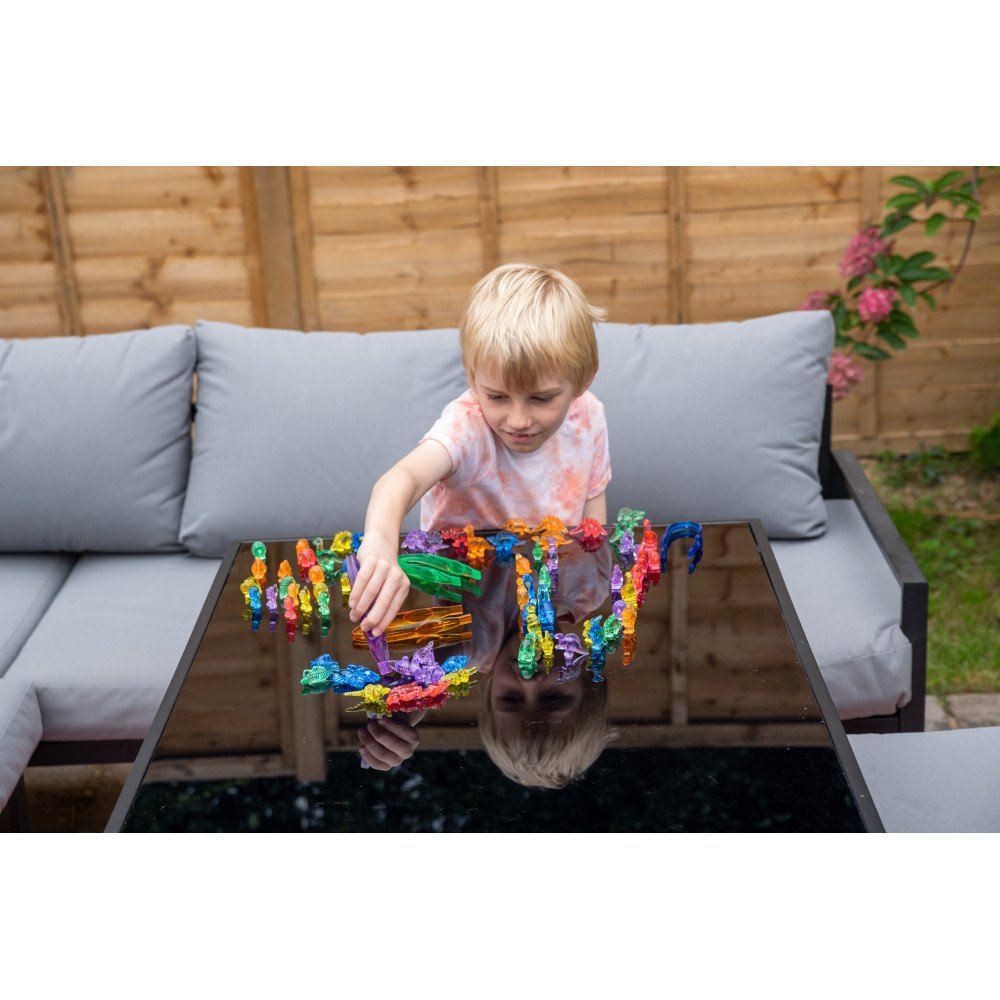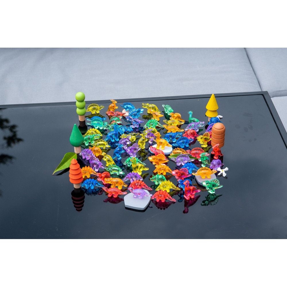 Spalvotų dinozaurų permatomas paviršius puikiai atsiskleidžia naudojant ant šviesos stalo ar šviesos lentos, todėl priemonė tinka sensoriniam ugdymui, sensorinei integracijai ir veikloms sensoriniame kambaryje. Paviršiaus detalės suteikia papildomą lytėjimo patirtį, o skirtingos dinozaurų formos skatina pažinimą, kalbos plėtrą ir kūrybinį žaidimą.