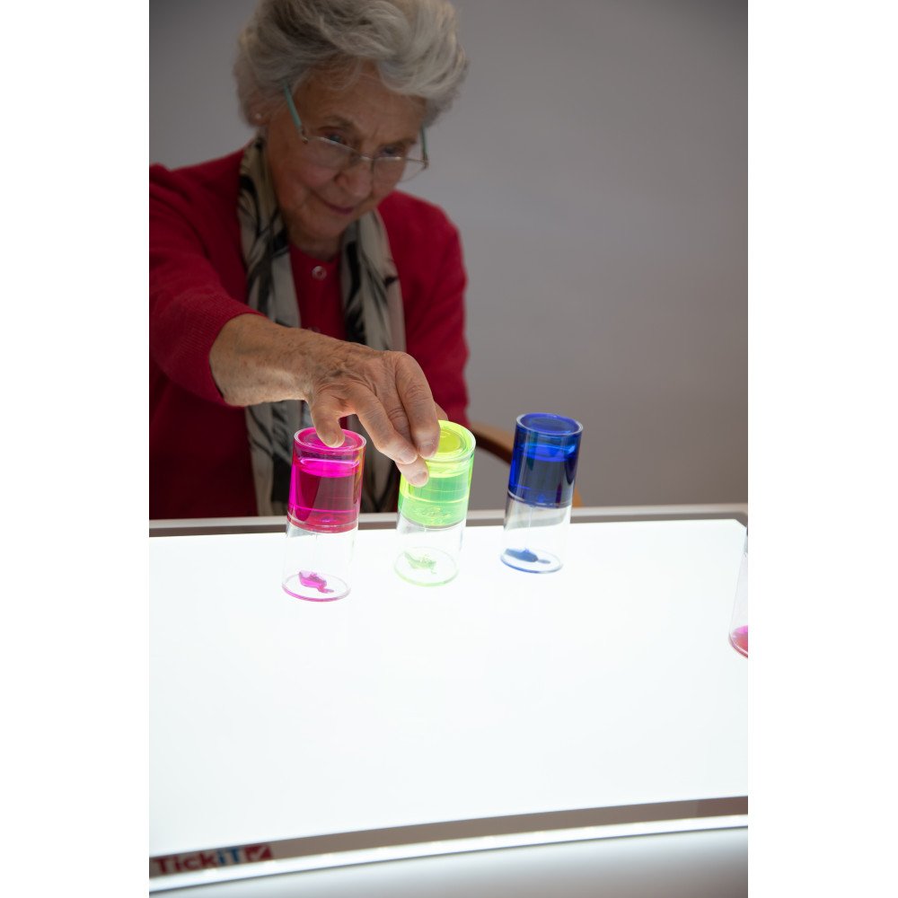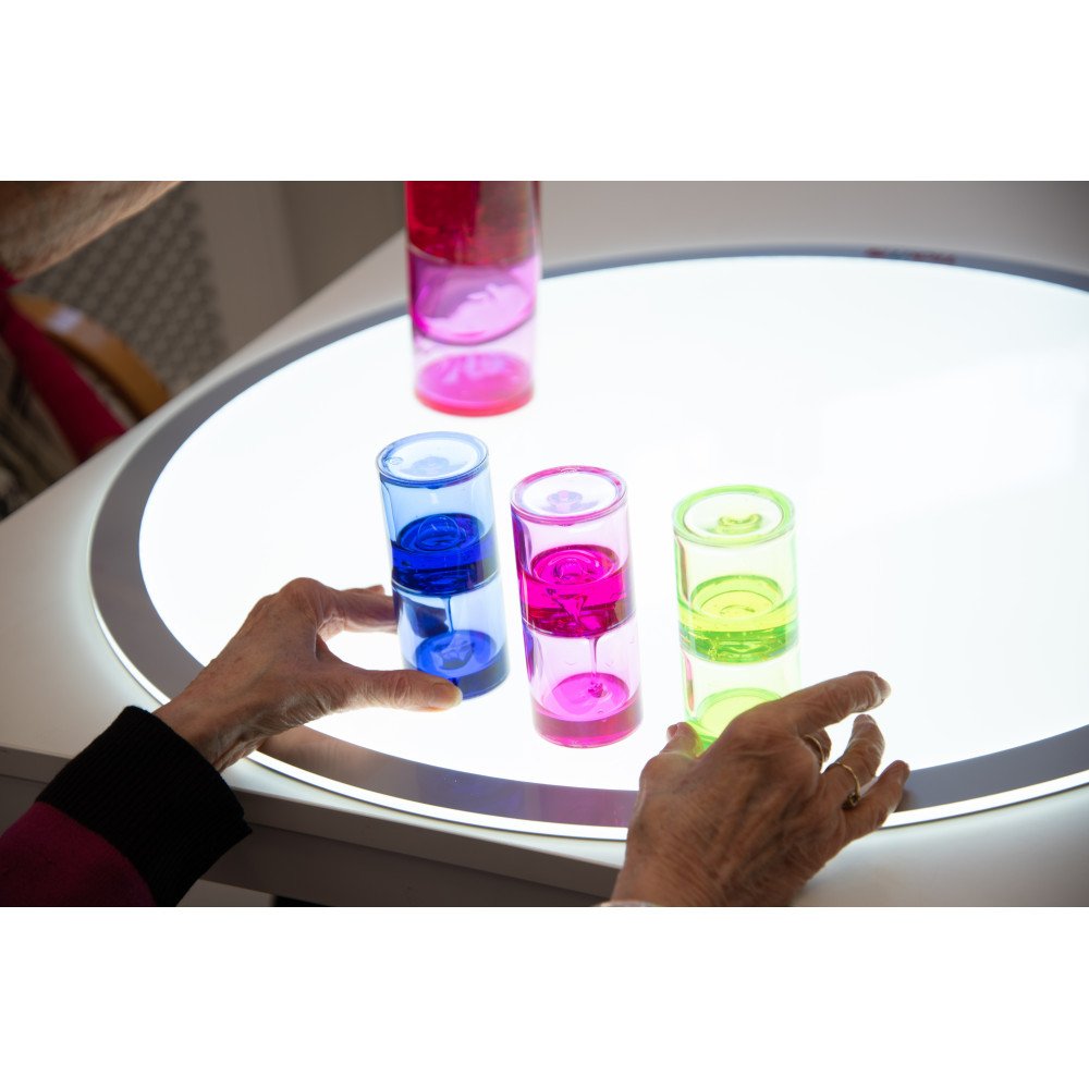 Stebint spalvų (mėlyna, rožinė, žalia) judėjimą lengva skatinti kalbos ugdymą – vaikai apibūdina skysčio judėjimą, lygina greitį ir kryptį. Priemonė tinka ir sensorinei integracijai, taip pat ergoterapijai, kai siekiama švelnaus vizualinio stimulo bei struktūruotos, raminančios veiklos.