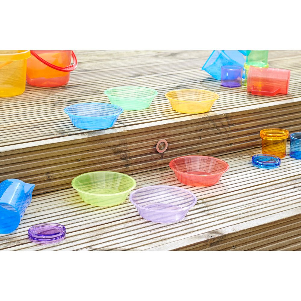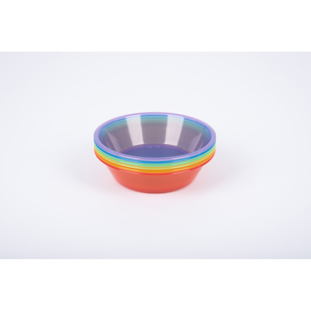 • Rinkinį sudaro 6 spalvų (raudona, oranžinė, geltona, žalia, mėlyna, violetinė) permatomi dubenėliai: