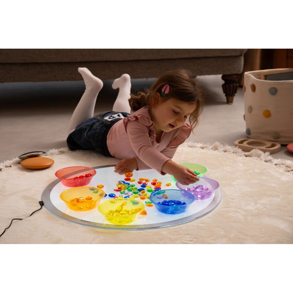 Skaidrūs dubenėliai tinka ir smėlio bei vandens žaidimams: vaikai semia, pilsto, maišo, lygina tūrius ir stebi, kaip keičiasi spalva bei šviesa per permatomą plastiką. Jie dera su kitomis skaidriomis priemonėmis ar šviesos stalais, todėl veiklas lengva išplėsti sensoriniame kampelyje ar ugdymo įstaigoje.