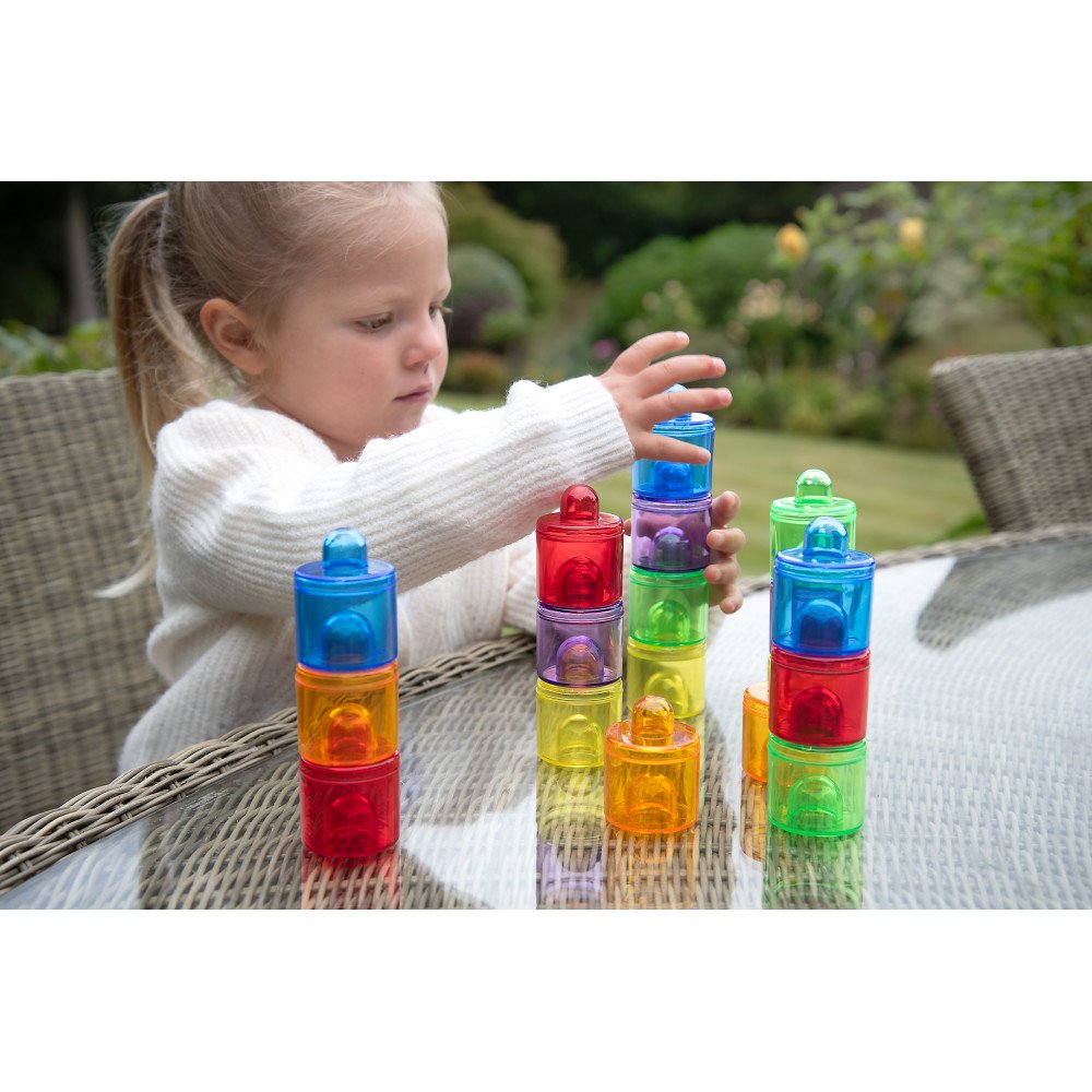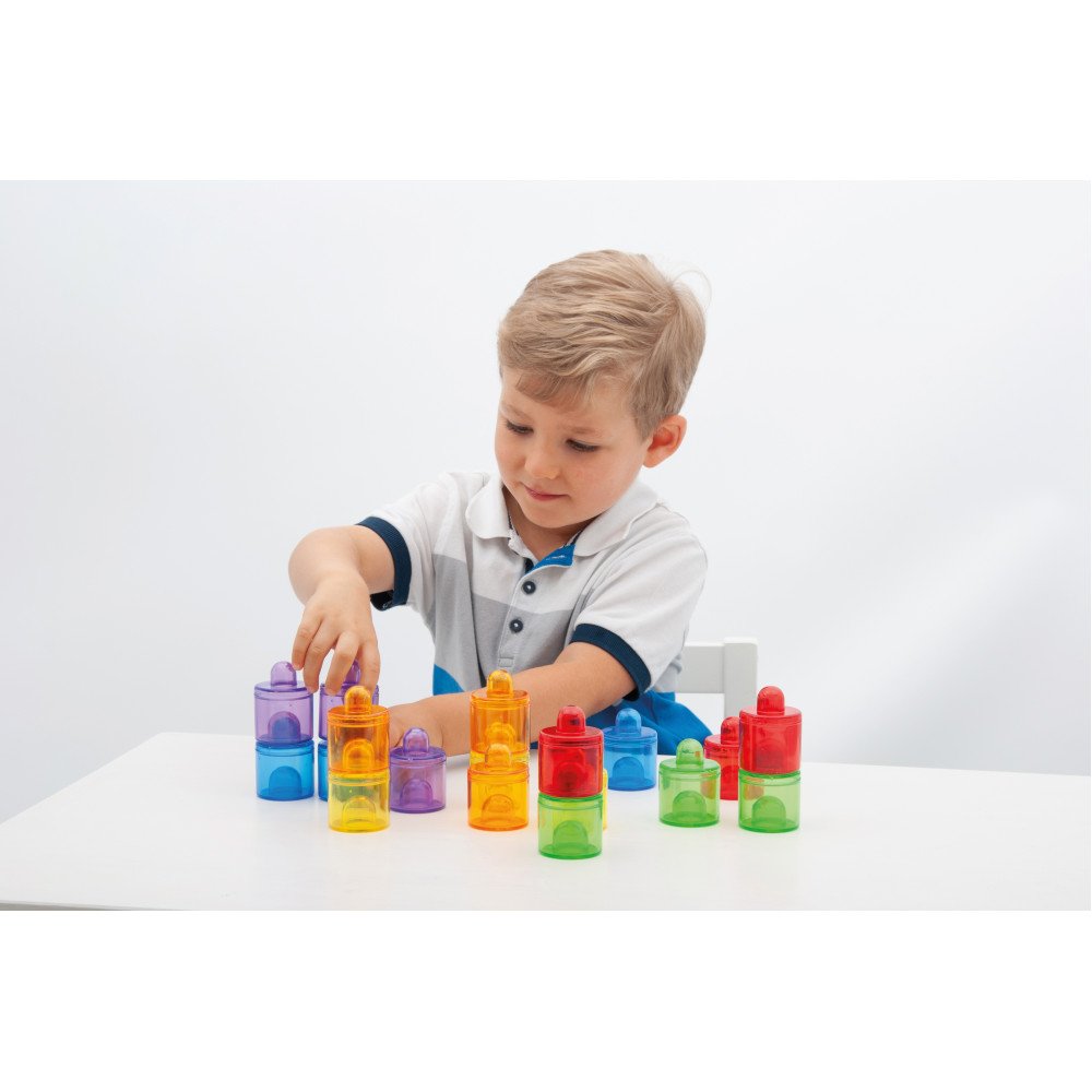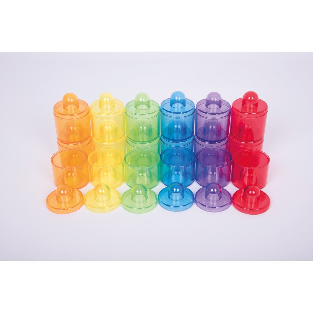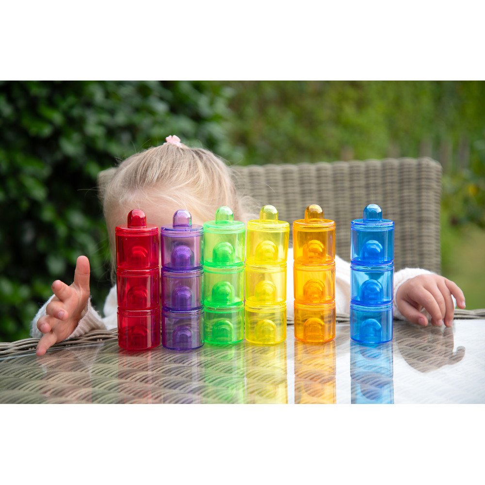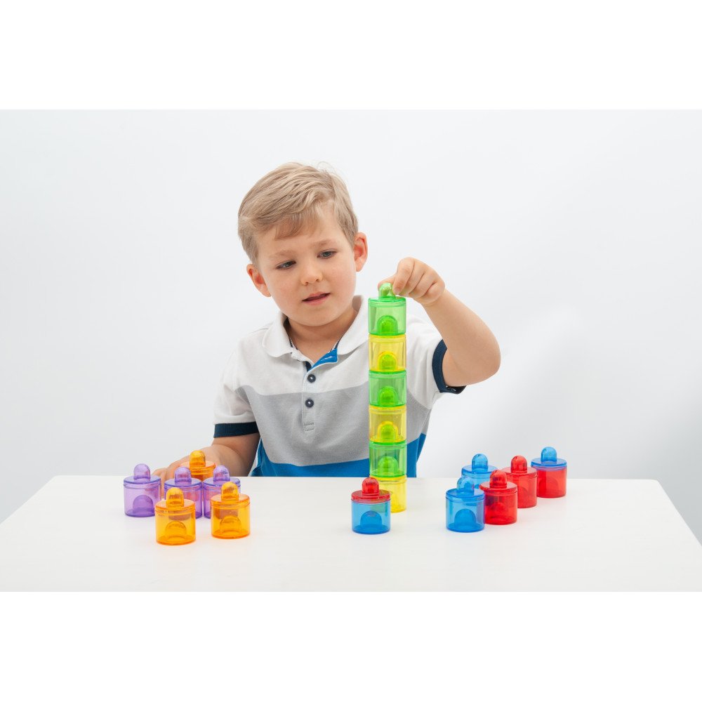 Permatomi spalvoti tyrinėjimo indeliai su dangteliais leidžia vaikams tyrinėti, rūšiuoti ir saugiai laikyti skirtingas medžiagas. Į indelius galima berti ir pilti įvairias priemones: ryžius, kruopas, pupeles, smėlį, vandens karoliukus, konfeti, sagas ar akmenukus. Vaikai stebi, kaip medžiagos skiriasi pagal spalvą, svorį, garsą, birumą ar permatomumą, o uždėtas dangtelis leidžia sukratyti turinį ir klausytis, kaip jis skamba. Tokie bandymai lavina pastabumą, smalsumą ir padeda kurti paprastas išvadas apie medžiagų savybes.