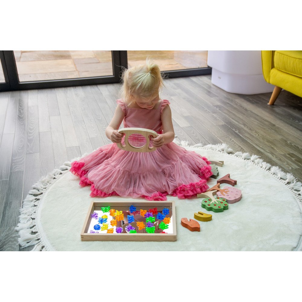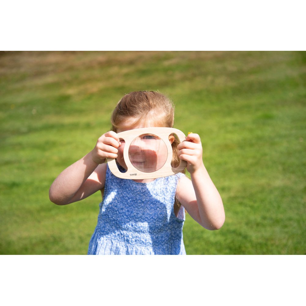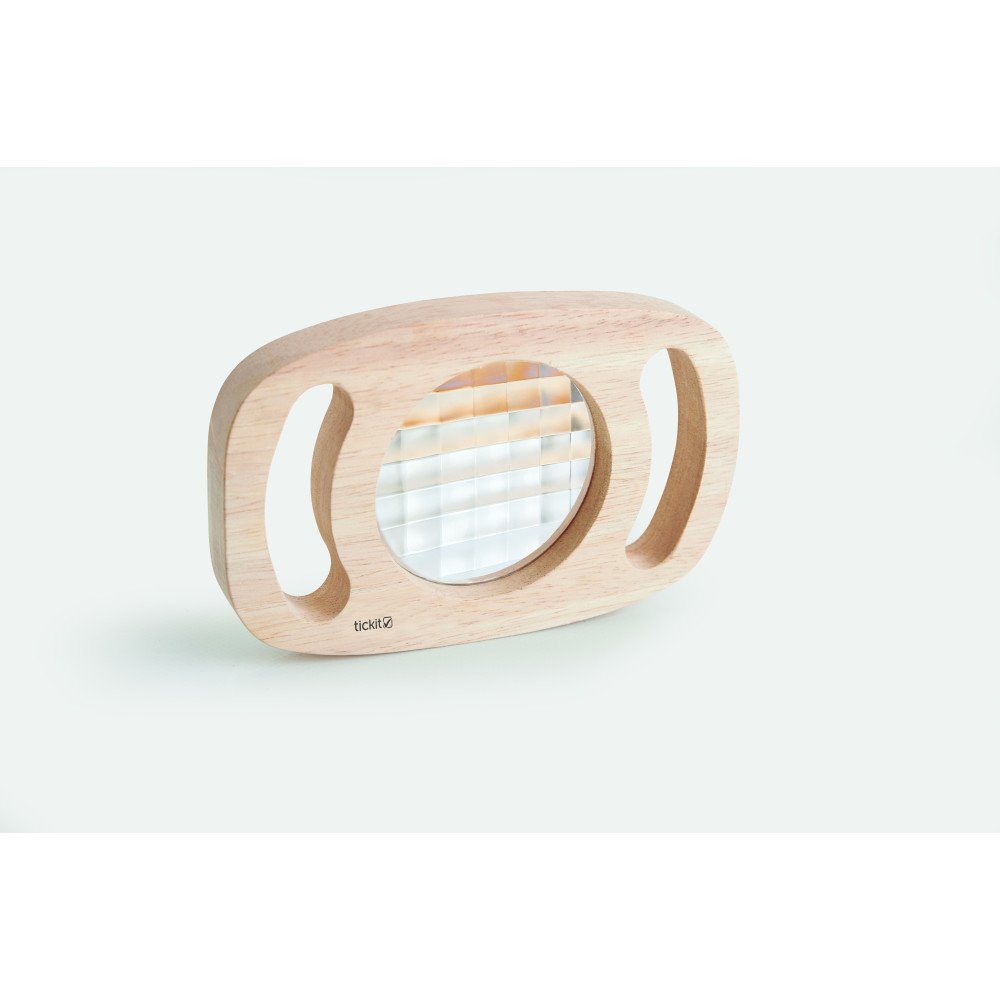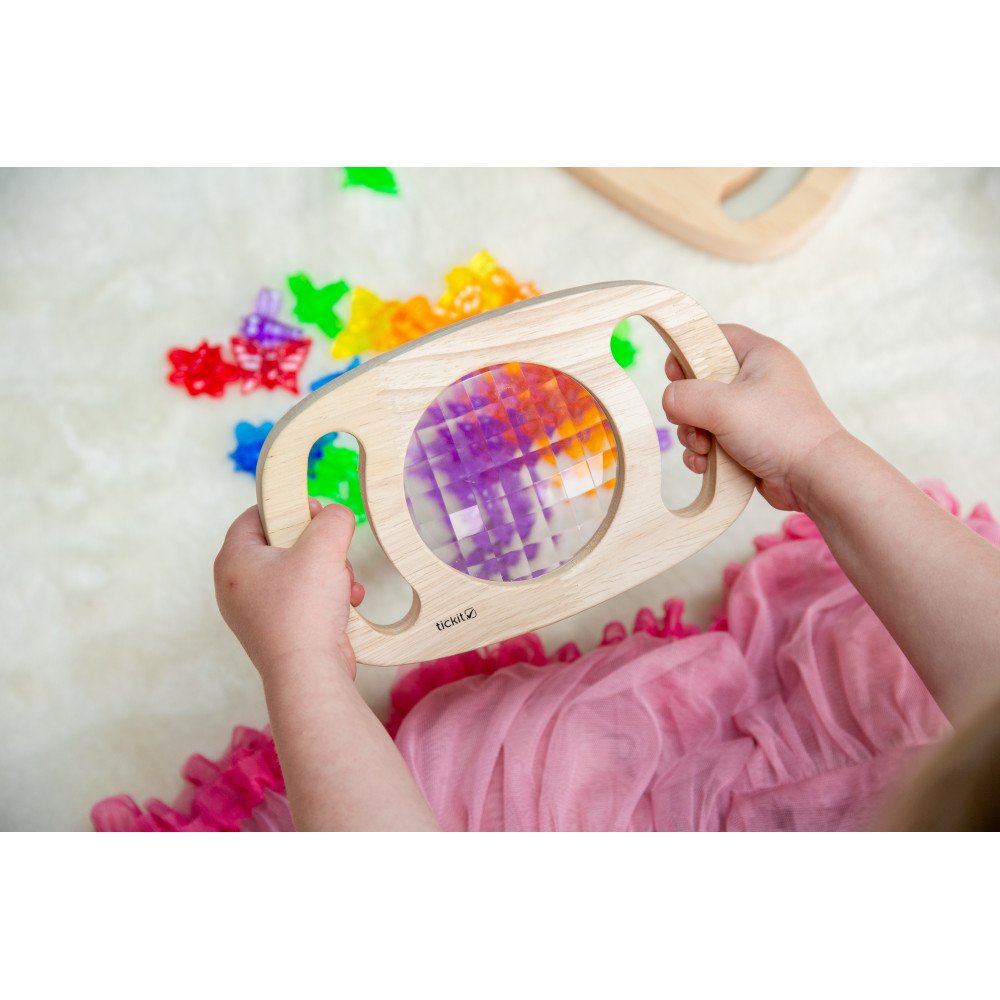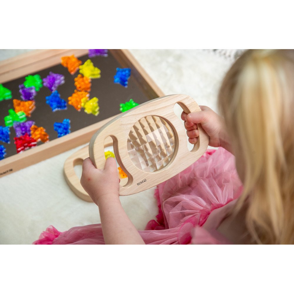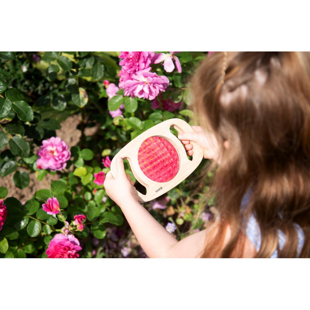 Rėmelį patogu laikyti už rankenų, todėl net mažos rankos gali jį valdyti pačios: vaikas prineša prie akių, nukreipia į objektą, keičia kampą ir lygina, kaip kinta raštai. Tai taip pat skatina kalbėjimą apie tai, ką vaikas mato – spalvas, formas, pasikartojimus ir pokyčius.