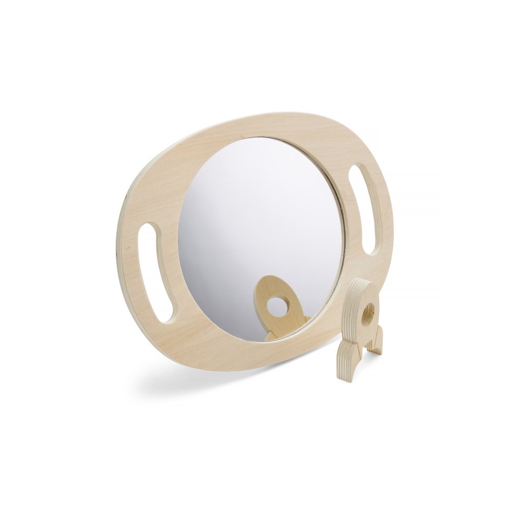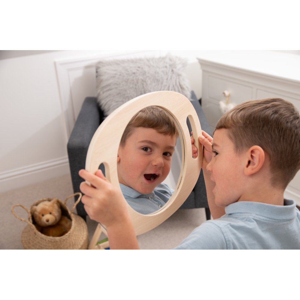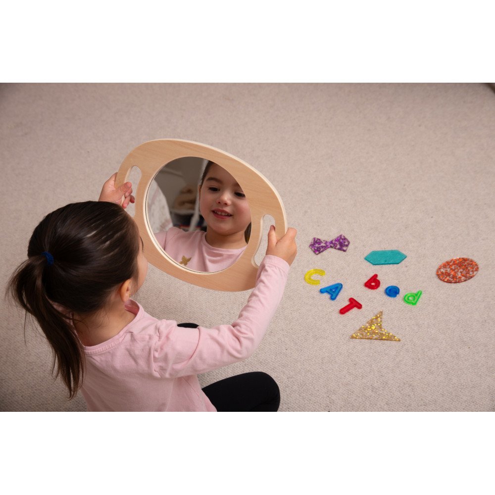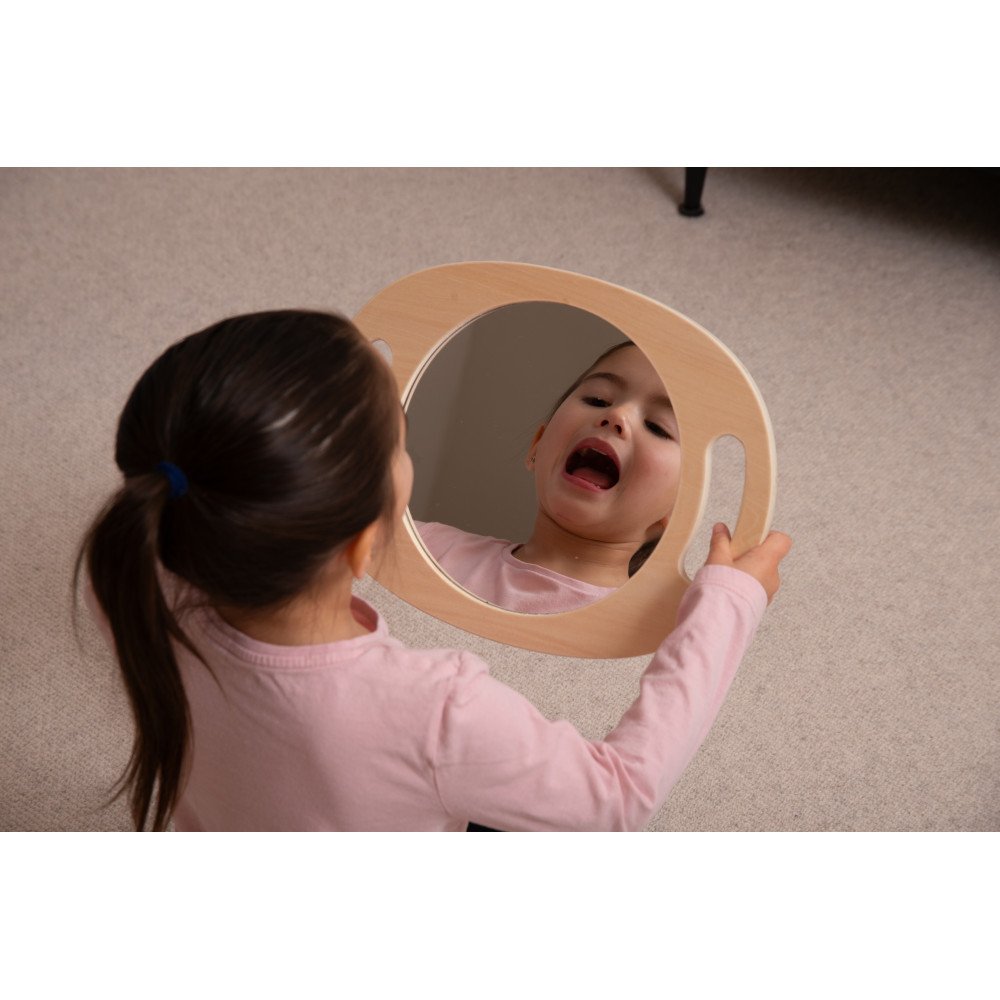 Rankinis akrilinis veidrodis su mediniu rėmu vaikams – savęs stebėjimui, emocijų pažinimui ir kalbos ugdymo veikloms ugdymo įstaigose. Veidrodis turi patogias rankenas, todėl jį lengva laikyti net mažesnėmis rankomis, o pilnas atspindintis paviršius leidžia vaikams aiškiai matyti veidą, mimikas ir burnos judesius. Tai ypač naudinga logopedinėse veiklose, kai svarbu stebėti artikuliaciją, garsų tarimą ir burnos padėtį.
