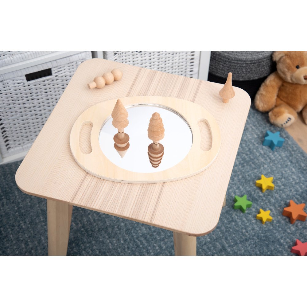 Akrilinio veidrodžio medžiaga yra saugesnė kasdieniam naudojimui vaikų grupėse nei stiklas, o beržo faneros rėmas suteikia stabilumo ir ilgaamžiškumo. Tai praktiška priemonė darželiams, mokykloms, logopedų kabinetams ir nusiraminimo kampeliams, kai reikia tvirto, lengvai pritaikomo įrankio kasdienėms ugdomosioms veikloms.