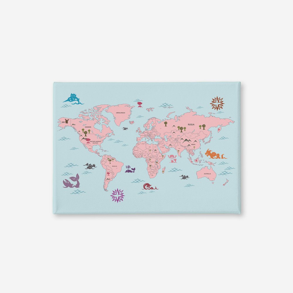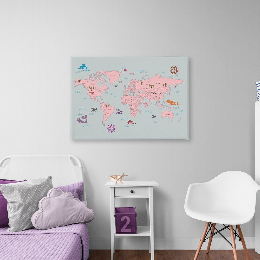Paveikslas ant drobės su pasaulio žemėlapiu lietuvių kalba gali būti ir orginali dovana vaikams ar pedagogams rugsėjo 1-osios proga.