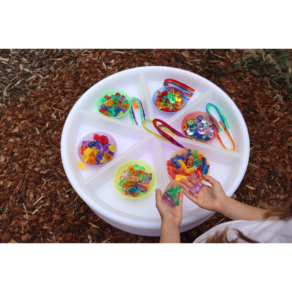 Šis rinkinys sukurtas taip, kad vaikai galėtų patogiai tyrinėti, rūšiuoti ir skaičiuoti skirtingas permatomas detales ant spalvas keičiančio paviršiaus. Šviesa sustiprina spalvų matomumą, todėl veiklos tampa aiškesnės ir labiau įtraukiančios. Vaikai gali dėlioti automobilius, namelius ir brangakmenius į padėklus ar dubenėlius, skaičiuoti, lyginti kiekius, kurti sekas ir atlikti pirmąsias ankstyvosios matematikos užduotis.