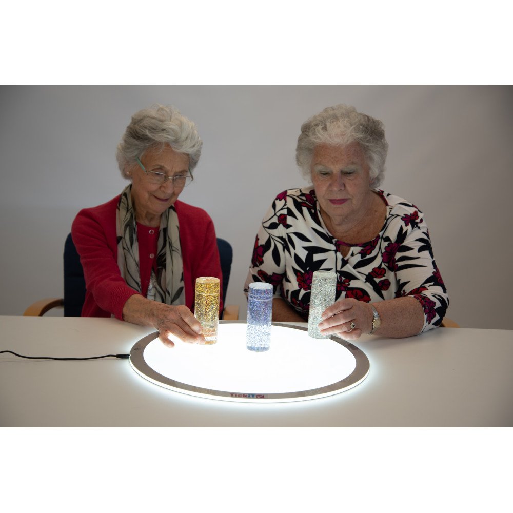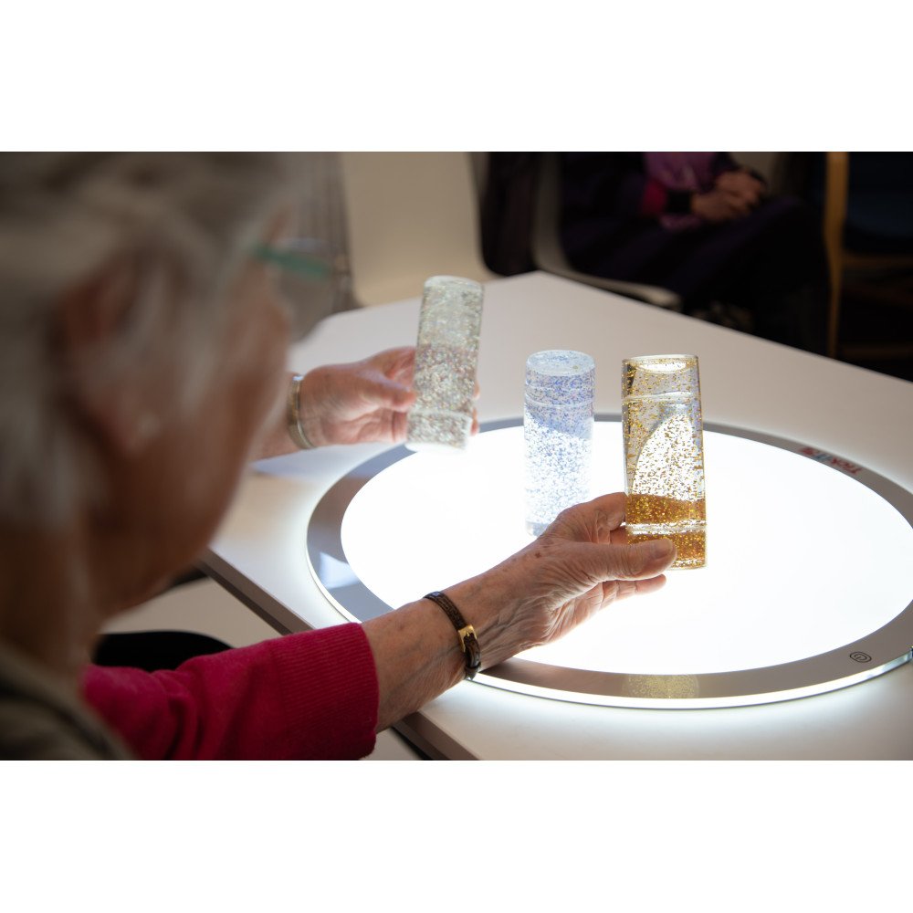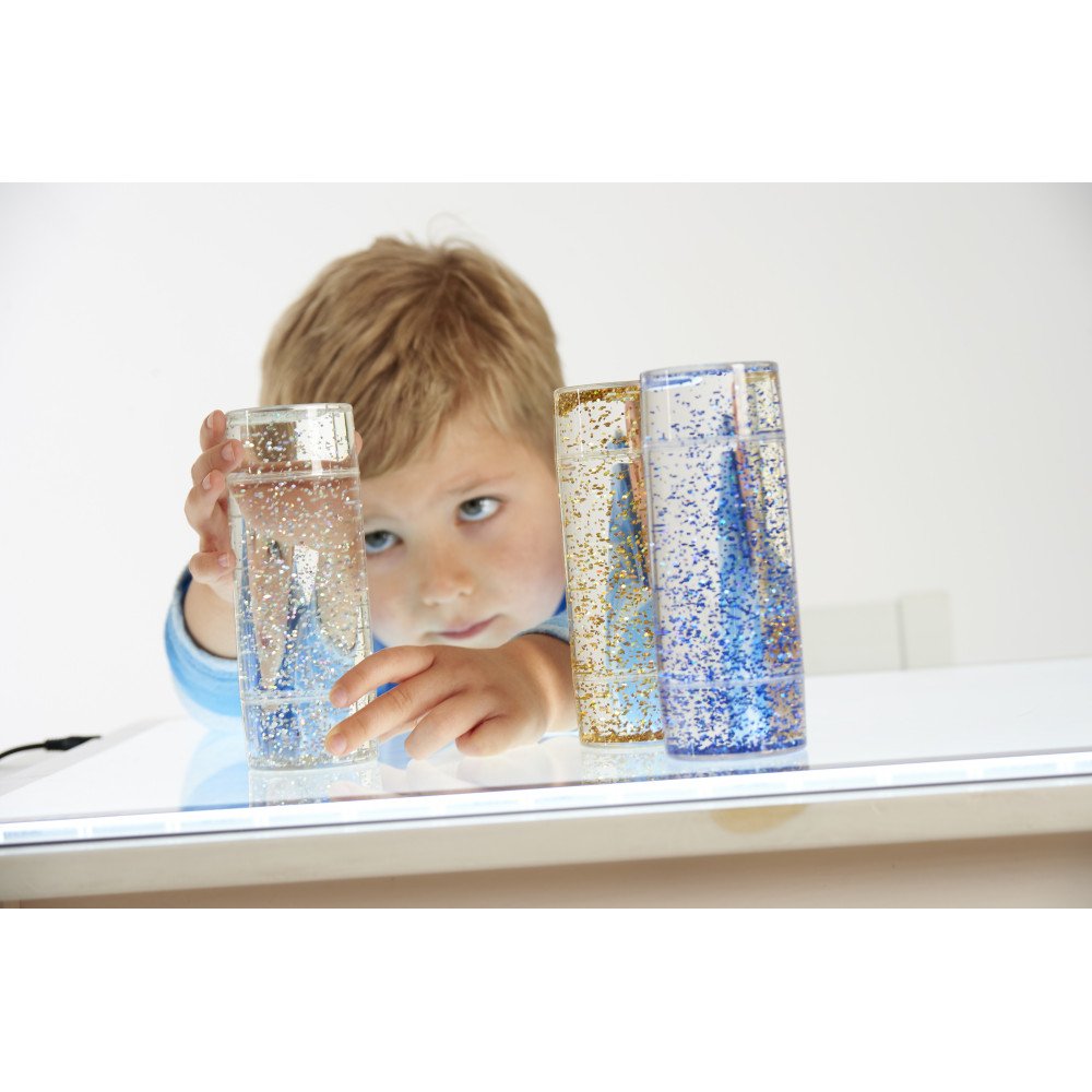 Sensoriniai cilindrai su blizgučiais (3 vnt.) sukuria blizgučių audrą, kuri padeda nusiraminti, sutelkti dėmesį ir ramiai stebėti judėjimą. Trijuose skaidriuose cilindruose esantis saugus, netoksiškas vandens ir glicerolio pagrindo skystis su blizgučiais sukuria įspūdingą sūkurį: pakračius ar apvertus blizgučiai intensyviai sukasi, tada staiga sulėtėja ir švelniai žėri. Tai puiki priemonė sensorinei integracijai, sensoriniam kambariui ir ugdymo įstaigoms, kai reikalinga rami veikla, padedanti emocijų valdymui ir nusiraminimui, ypač dirbant su specialių poreikių vaikais.