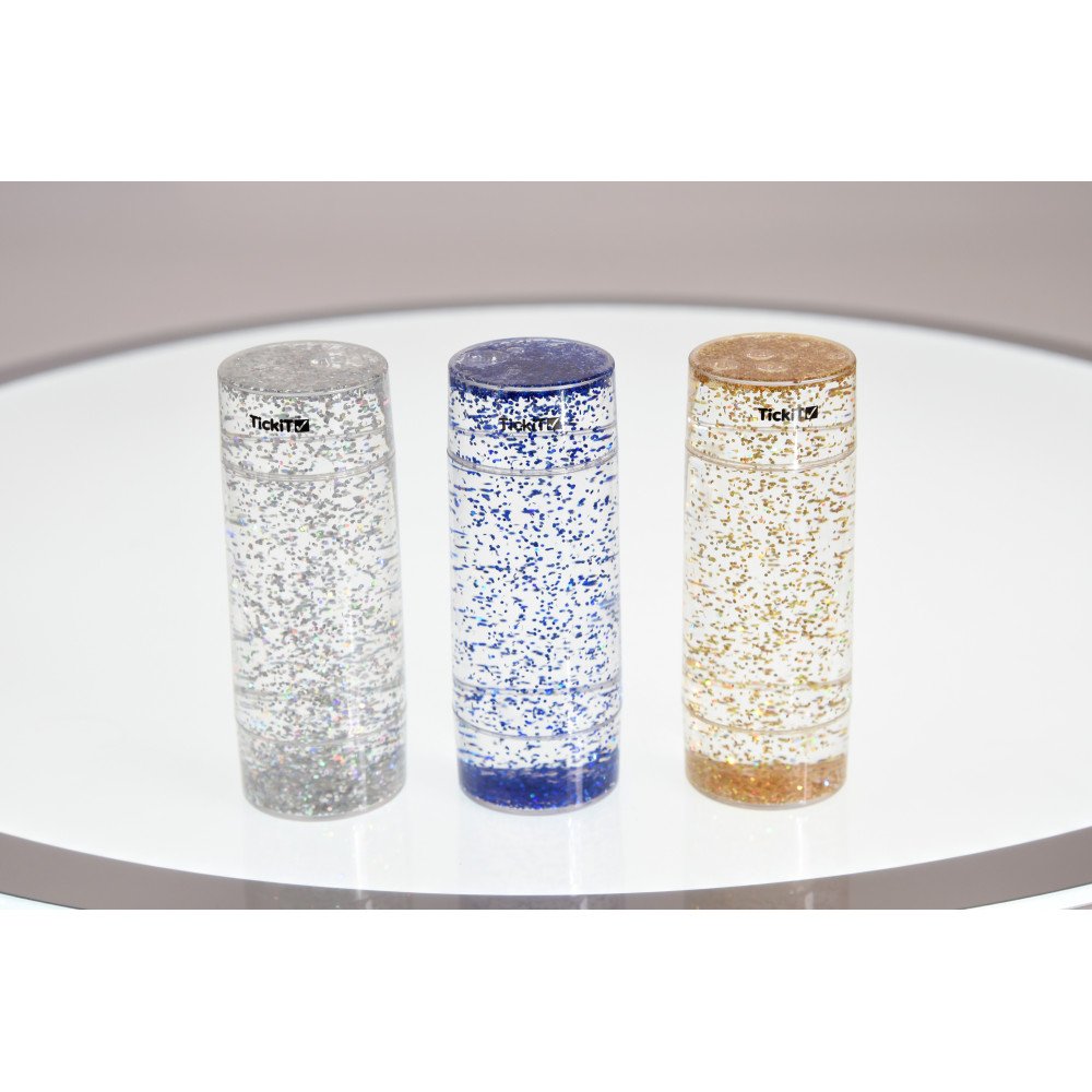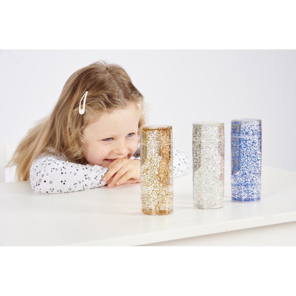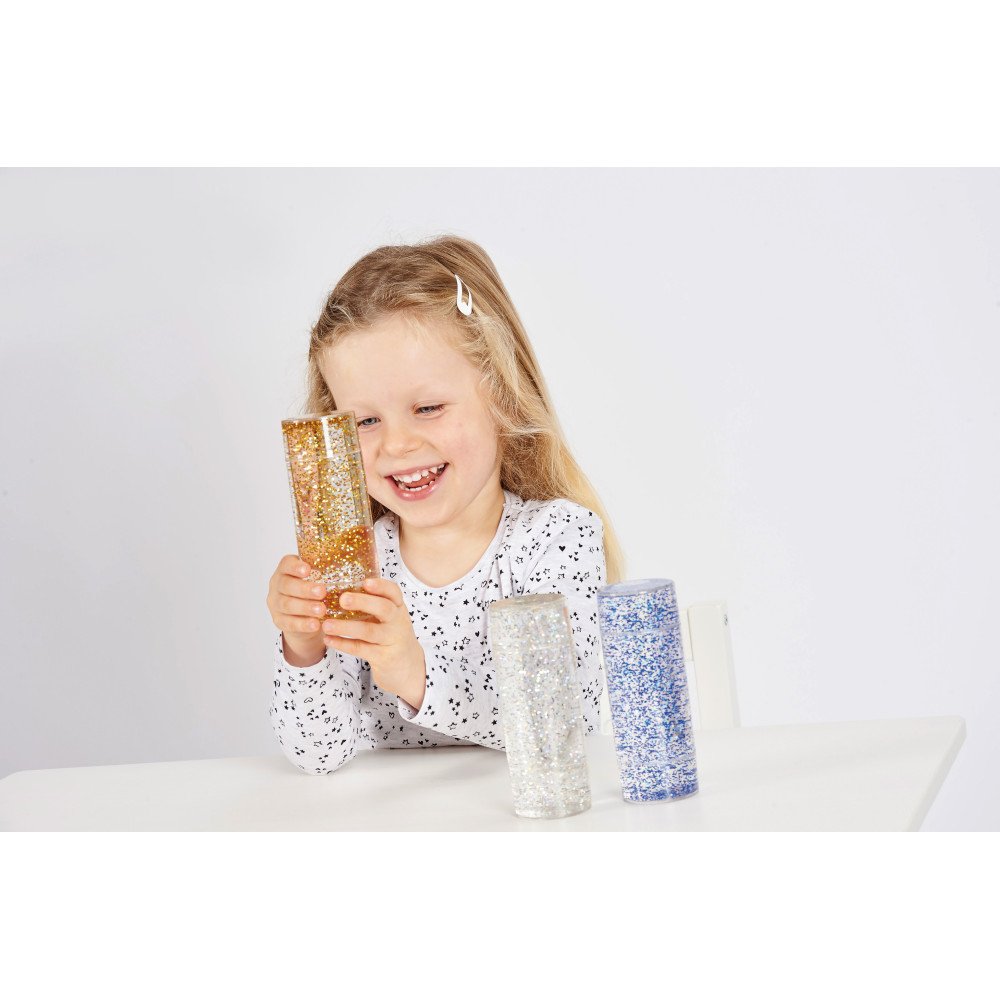 • Komplektacija: 3 vnt. sensoriniai cilindrai su blizgučiais (auksinis, sidabrinis, mėlynas).