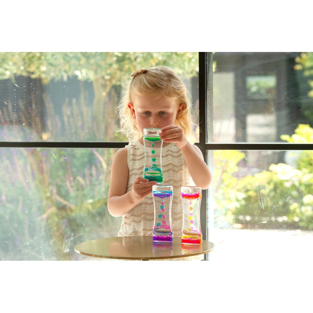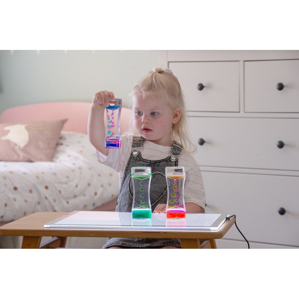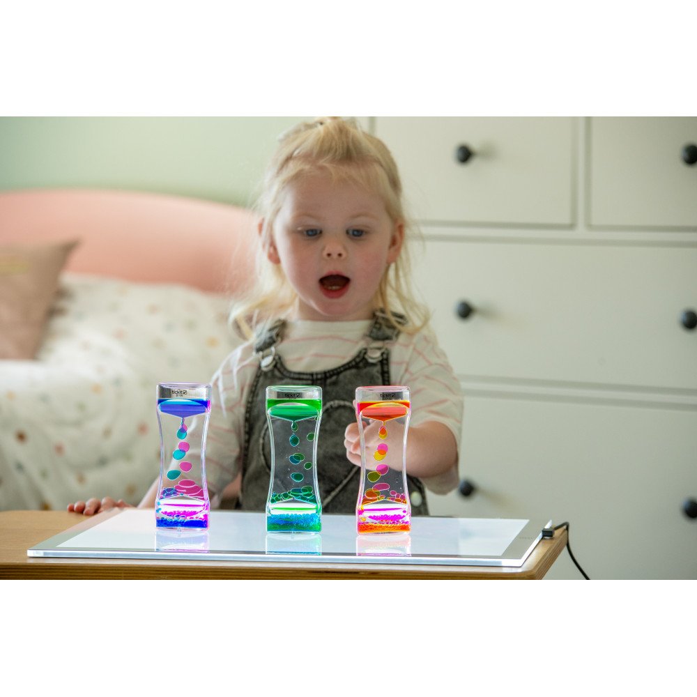 Sensoriniai skysčio cilindrai šviesos stalui (3 vnt.) sukuria įtraukų spalvų srautą, kuris padeda susikaupti ir nusiraminti. Kiekviename skaidriame cilindre esantys du skysčiai apvertus suformuoja dvi ryškias sroves, kurios švelniai teka į apačią. Padėjus ant šviesos stalo, apšviestumas sustiprina spalvų kontrastą ir judėjimo matomumą, todėl sensorinis įsitraukimas tampa gilesnis, o vaikas lengviau pereina į ramų stebėjimą. Tai ypač naudinga sensoriniame kambaryje, ugdymo įstaigose ir dirbant su specialių poreikių vaikais, kai svarbi sensorinė integracija, dėmesys ir nusiraminimas.