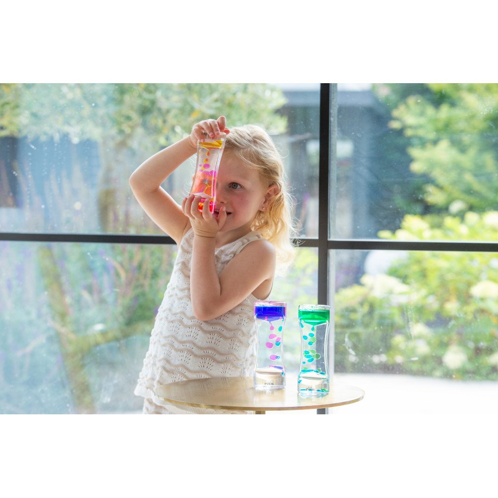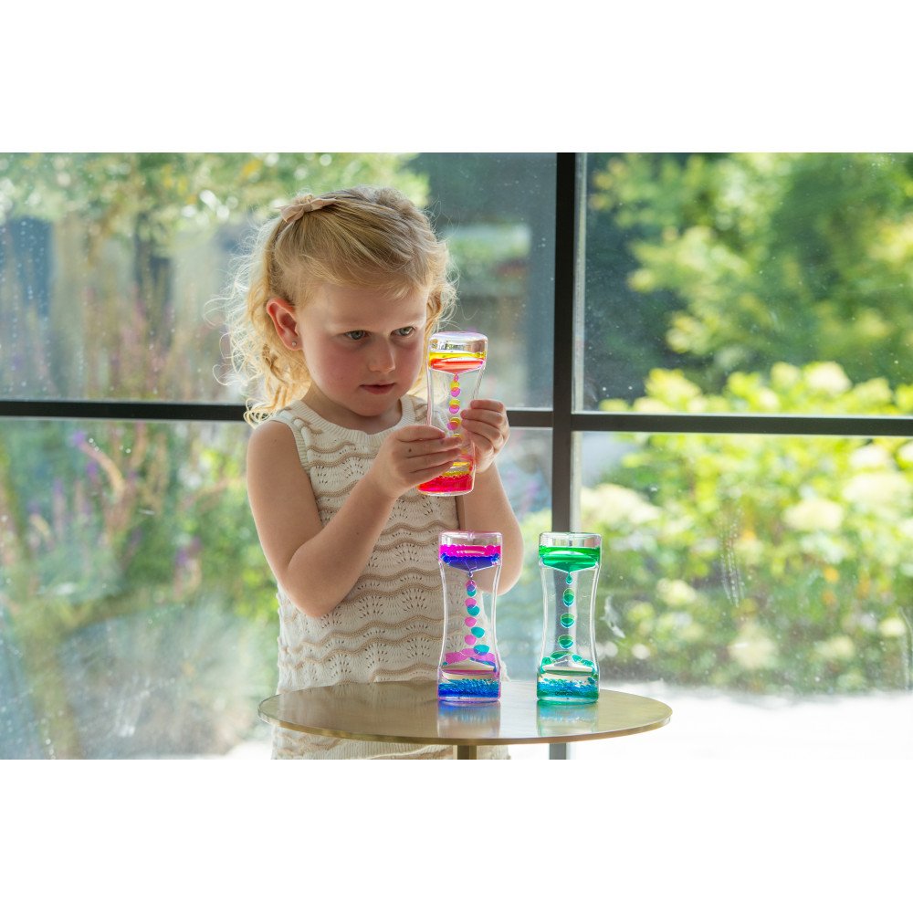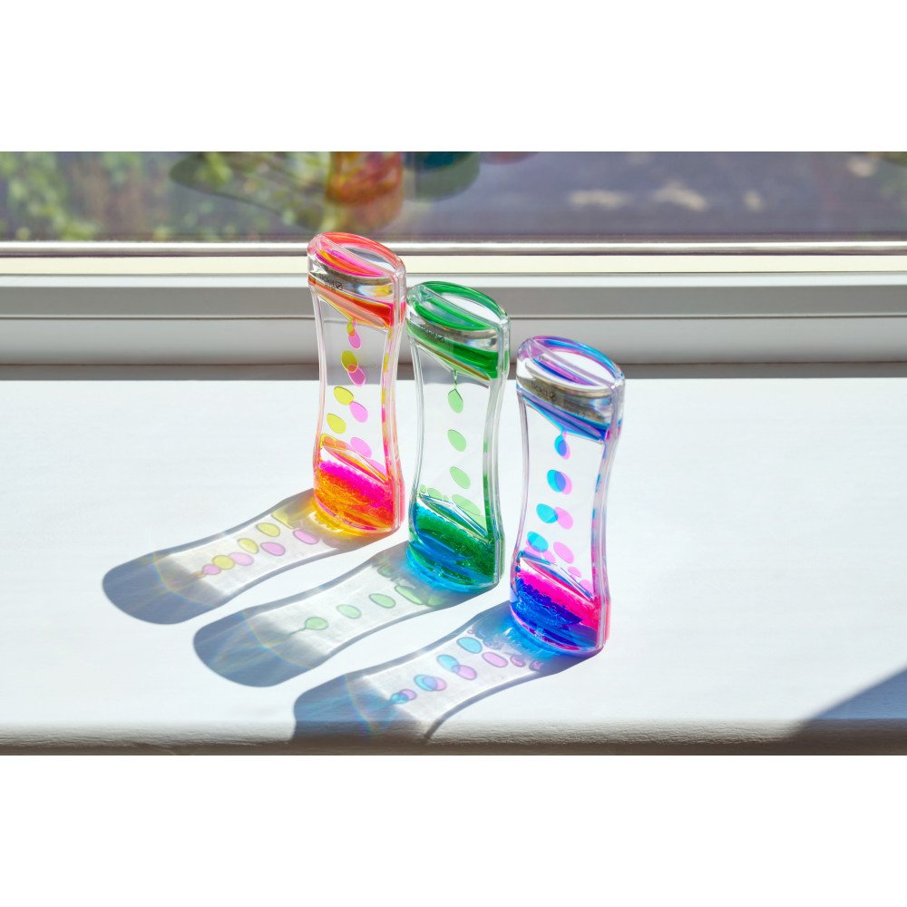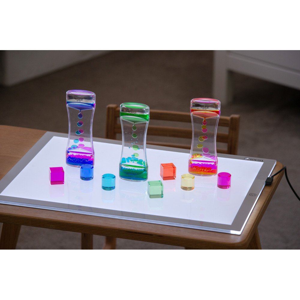 Sensoriniai skysčio cilindrai šviesos stalui (3 vnt.) sukuria įtraukų spalvų srautą, kuris padeda susikaupti ir nusiraminti. Kiekviename skaidriame cilindre esantys du skysčiai apvertus suformuoja dvi ryškias sroves, kurios švelniai teka į apačią. Padėjus ant šviesos stalo, apšviestumas sustiprina spalvų kontrastą ir judėjimo matomumą, todėl sensorinis įsitraukimas tampa gilesnis, o vaikas lengviau pereina į ramų stebėjimą. Tai ypač naudinga sensoriniame kambaryje, ugdymo įstaigose ir dirbant su specialių poreikių vaikais, kai svarbi sensorinė integracija, dėmesys ir nusiraminimas.