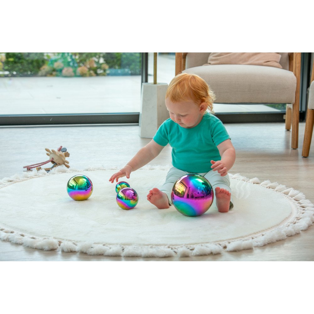 Sensoriniai šviesą atspindintys kamuoliai suteikia vaikams įtraukiančią regos ir lytėjimo patirtį stebint kintančius atspindžius ir šviesos blyksnius.