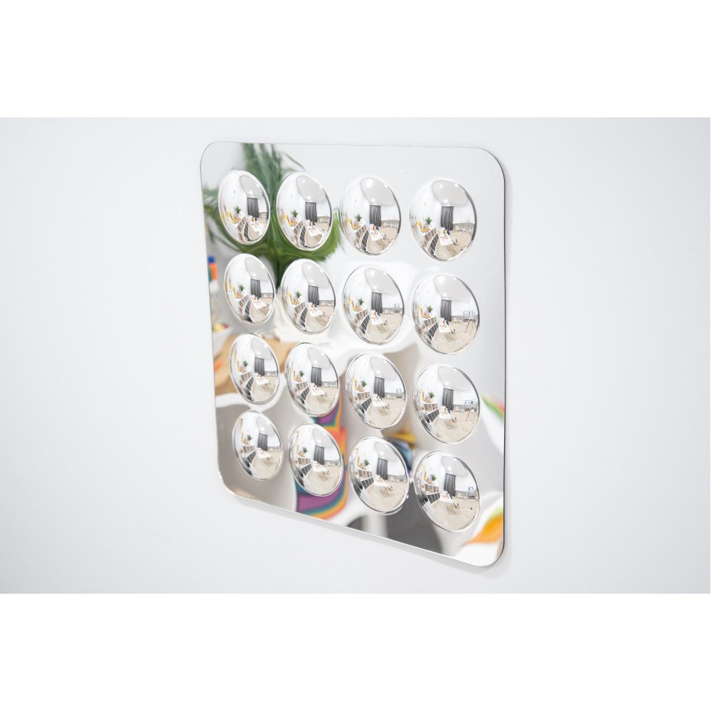 Skydas pagamintas iš įbrėžimams atsparaus akrilo, todėl yra saugus ir tinkamas intensyviam kasdieniam naudojimui darželiuose, mokyklose, sensoriniuose kambariuose ar terapijos aplinkoje. Lygus paviršius lengvai valomas, o komplekte esantys tvirtinimo sprendimai leidžia patikimai pritvirtinti veidrodį prie sienos ar sensorinės plokštės. Nors formatas kompaktiškas, 16 kupolų sukuria ypač turtingą vizualinę patirtį.
