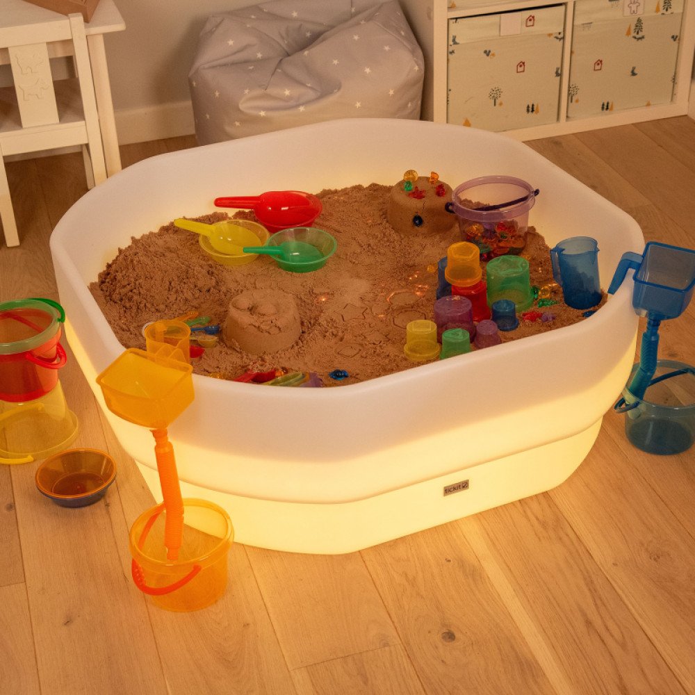 Sensorinis atradimų stalas smėlio, vandens ir šviesos patirtims sukurtas grupinėms sensorinėms veikloms darželiuose, mokyklose ir terapijos erdvėse. Tvirta, gilesnė ir ilgaamžiška konstrukcija pritaikyta intensyviam naudojimui ugdymo įstaigose, kai reikia didesnės, patogiai prižiūrimos ir greitai paruošiamos veiklų zonos. Stalas suteikia švelnią baltą arba spalvotą šviesą, kuri valdoma nuotolinio valdymo pulteliu, todėl lengva keisti nuotaiką ir prisitaikyti prie skirtingų užduočių.