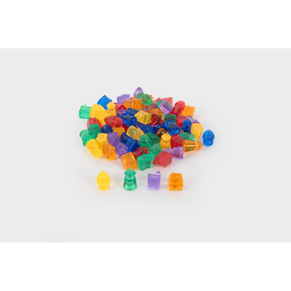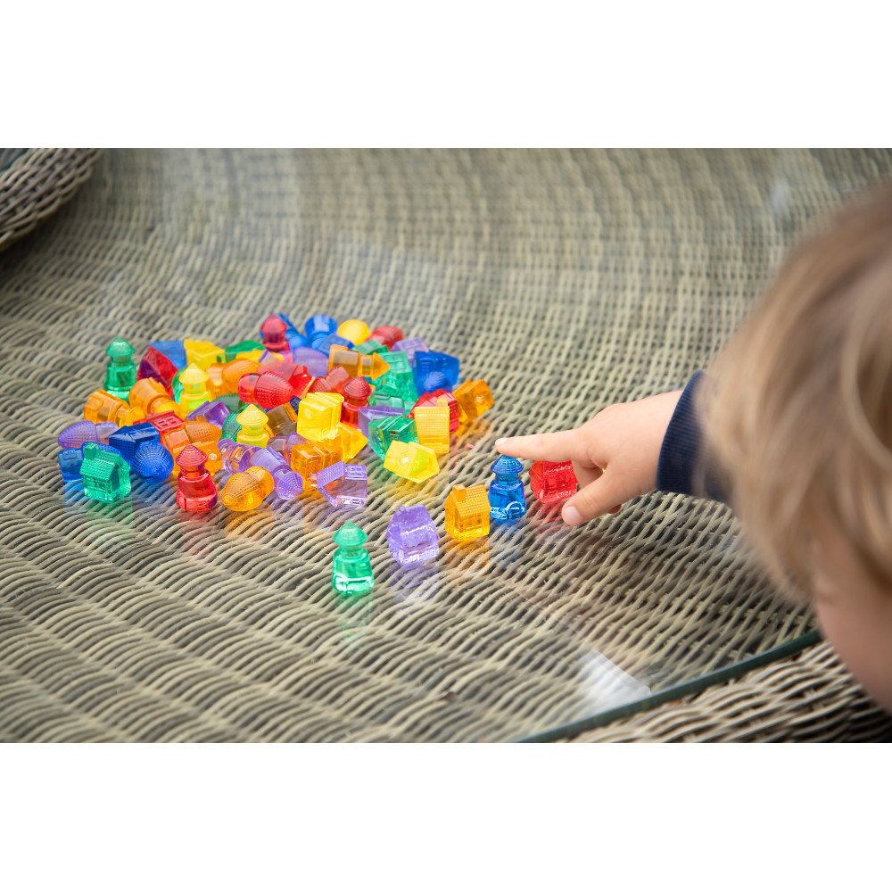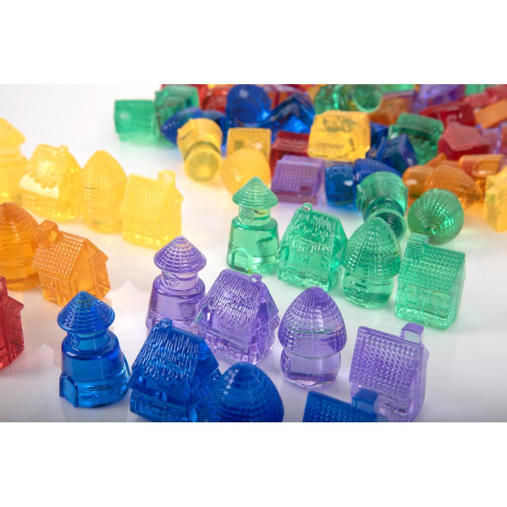 Sensorinis permatomų namelių rinkinys sukrutas tikslioms rankų užduotims – paimti, perkelti ir padėti į vietą taip, kad namukas stovėtų tvarkingai.