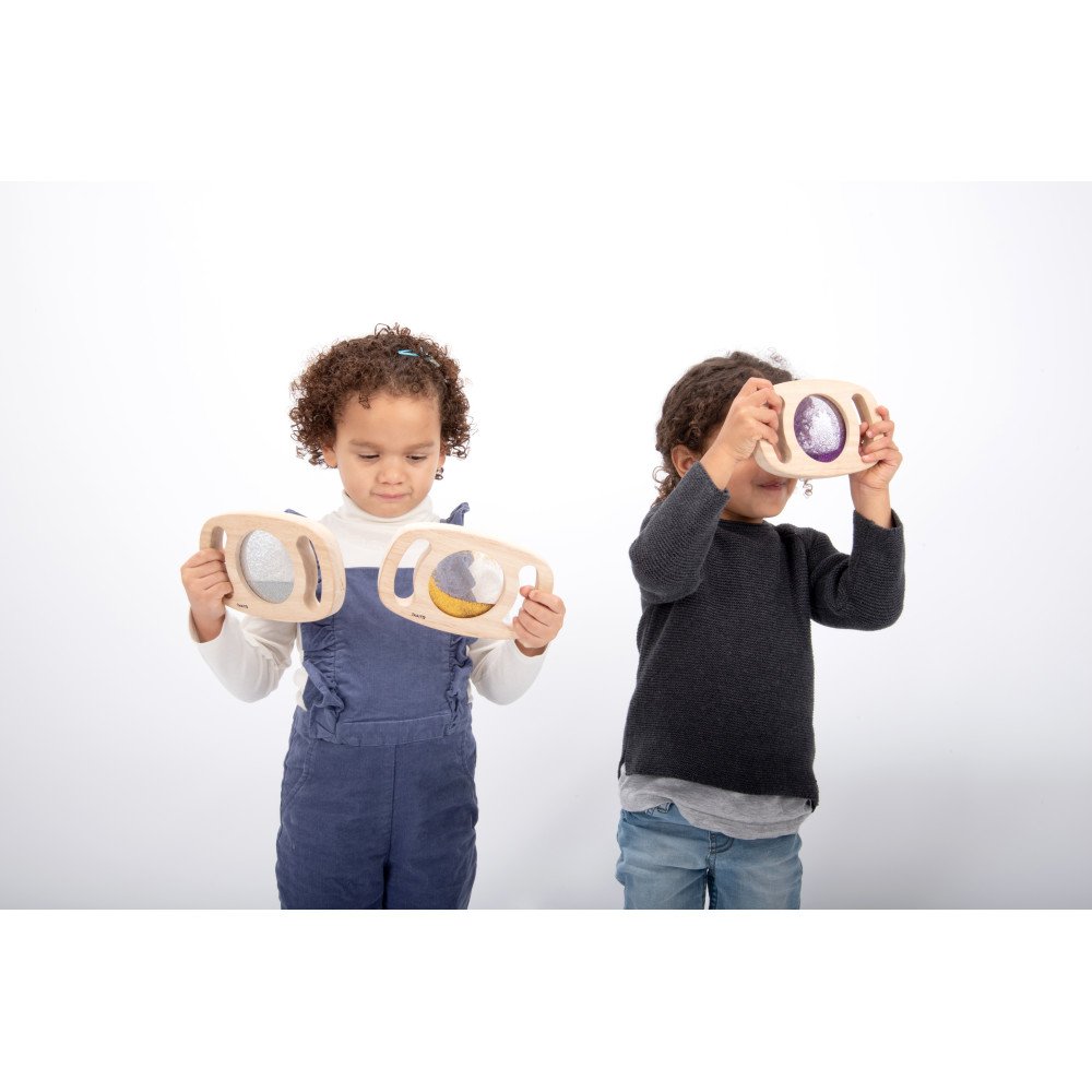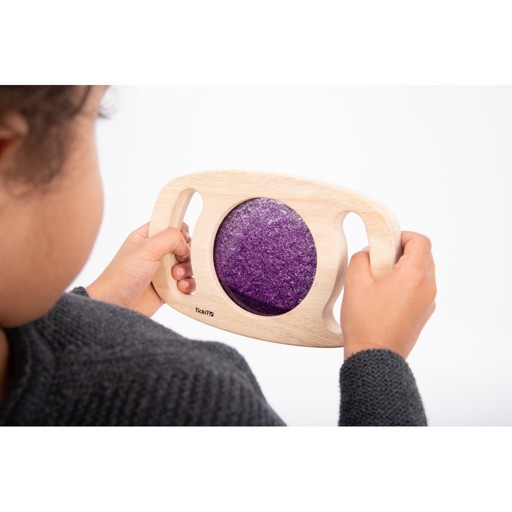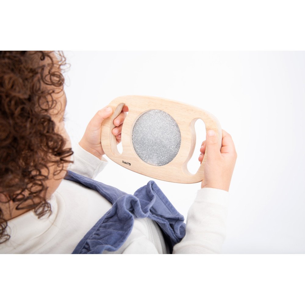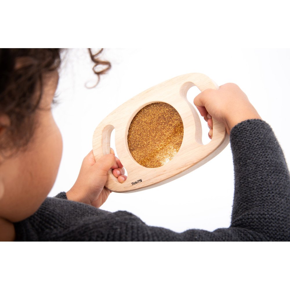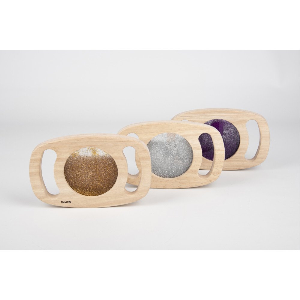 Sensorinių plokštelių su blizgučiais rinkinys suteikia vaikams regos stimuliaciją stebint, kaip skystyje lėtai juda blizgučiai ir atsispindi šviesa. Vaikas gali rėmelį pakreipti, pasukti ar apversti ir matyti, kaip blizgučiai susisuka į sūkurį, sulėtėja ir nusėda. Toks lėtas judėjimas padeda sutelkti dėmesį, skatina stebėjimą ir kviečia tyrinėti šviesos pokyčius – blizgučiai mirga, keičia ryškumą ir sukuria švelnius šviesos blyksnius. Naudojant prie lango ar ant šviesos stalo efektas tampa dar ryškesnis, todėl veikla ypač įtraukianti sensoriniam tyrinėjimui ir nusiraminimui.