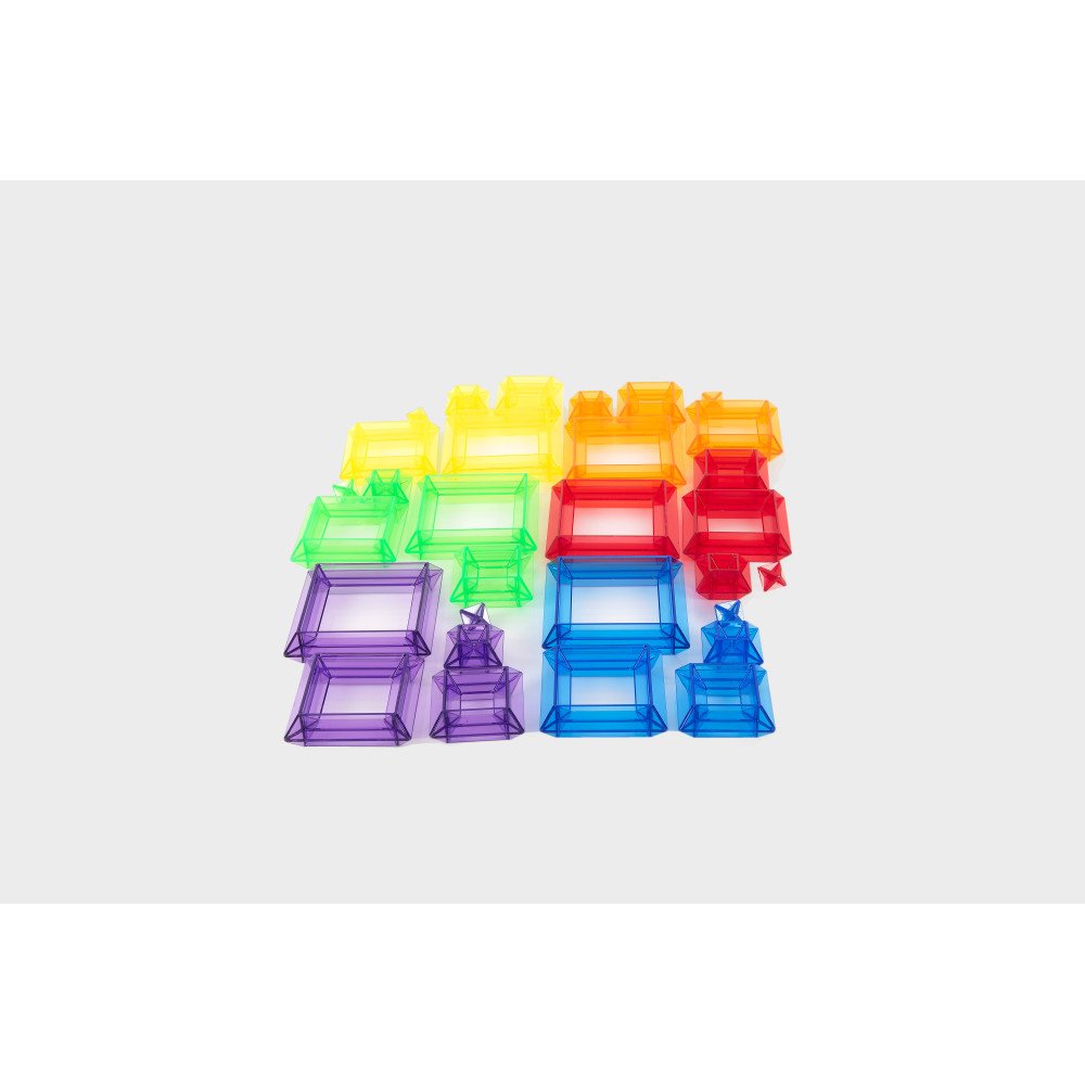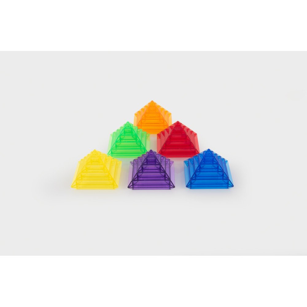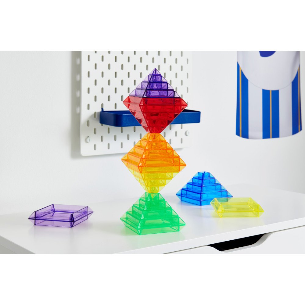 Skaidrios spalvotos statymo piramidės (30 vnt.) – tai atviro tipo ugdomoji priemonė, leidžianti vaikams kurti įvairias konstrukcijas ir tyrinėti formas per žaidimą. Kvadratinės piramidžių dalys sukurtos taip, kad būtų galima jas statyti skirtingais būdais: vertikaliai (nuo didžiausios iki mažiausios arba atvirkščiai), taip pat horizontaliai, jungiant kelias detales ir formuojant aukštesnes, sudėtingesnes struktūras.