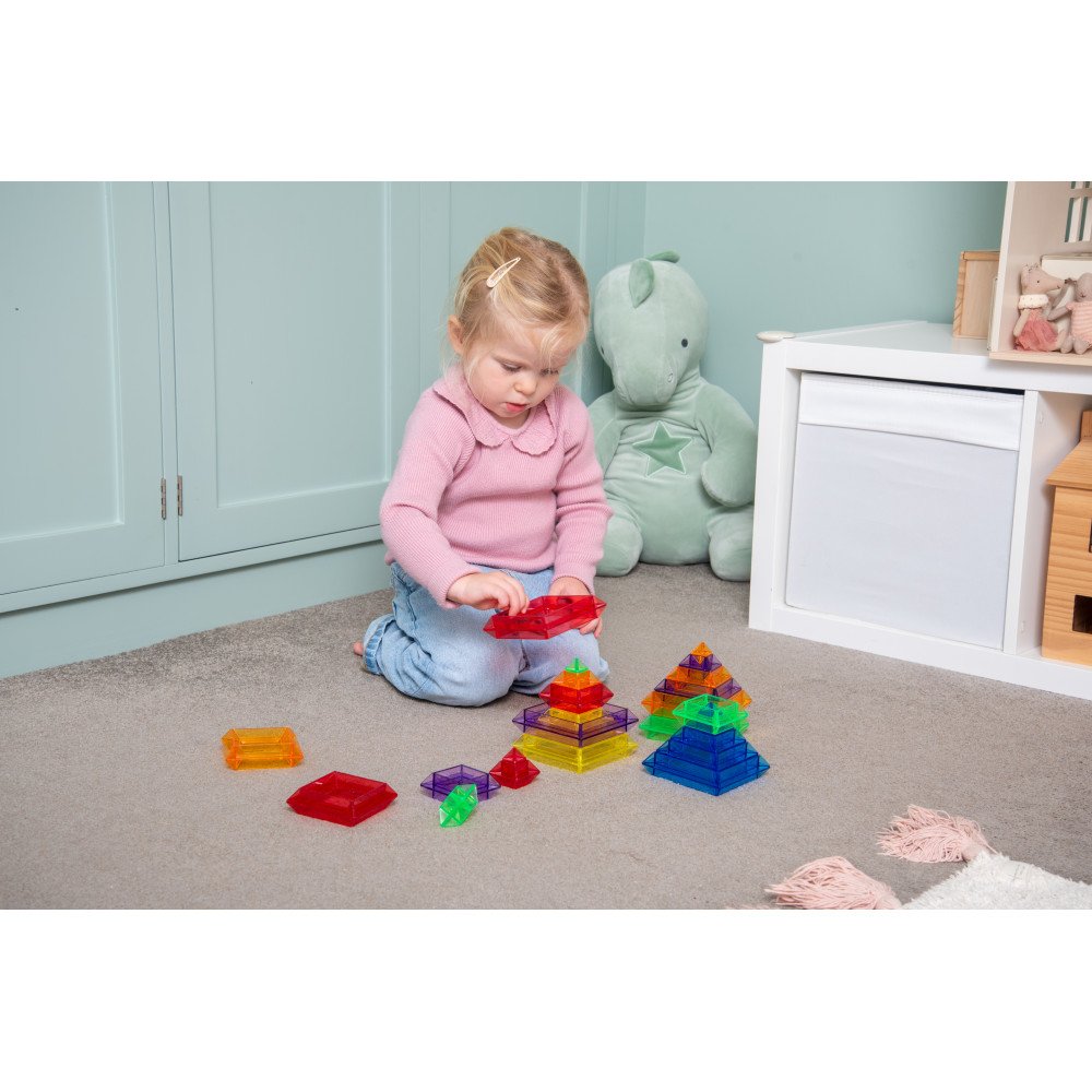 Permatomos ryškios spalvos suteikia papildomą vizualinį efektą, ypač naudojant piramides ant šviesos stalo ar LED panelės. Šviesa išryškina spalvas, sluoksnius ir konstrukcijų formas, todėl vaikai ilgiau išlaiko dėmesį ir noriau eksperimentuoja. Dėl šios priežasties rinkinys tinka tiek laisvam, vaiko inicijuotam žaidimui, tiek struktūruotoms ugdomosioms veikloms.
