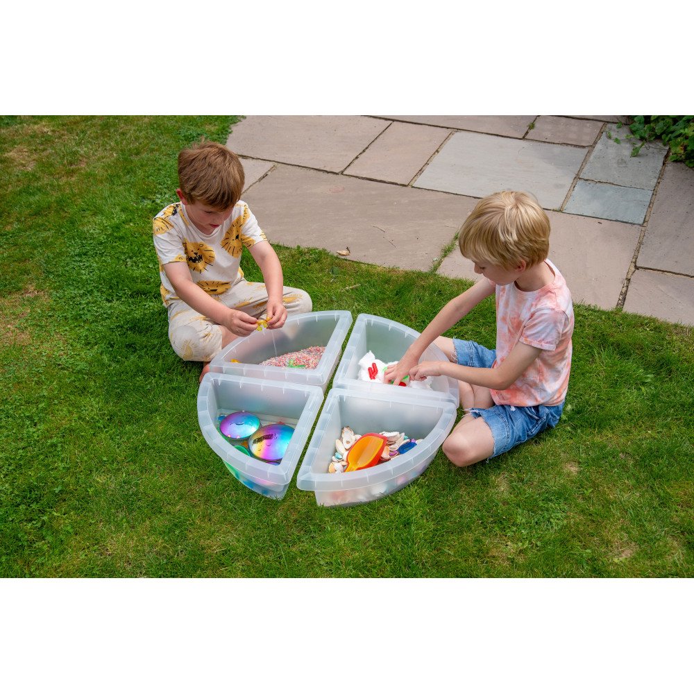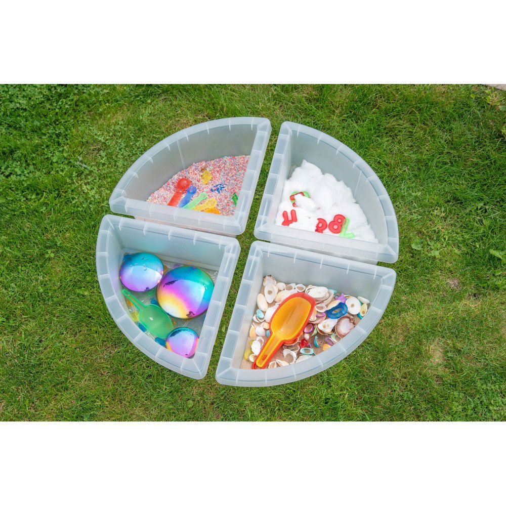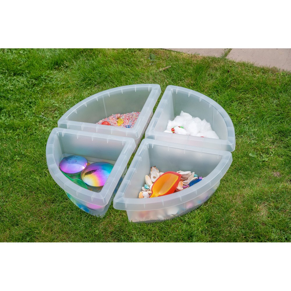 Skaidrūs 4 skyrių padėklai padeda tvarkingai organizuoti sensorines veiklas ir leidžia vaikams vienu metu tyrinėti kelias medžiagas. Kiekvienas padėklas turi keturis atskirus gilius skyrius, todėl vaikai gali pilstyti, semti, rūšiuoti ir lyginti skirtingas tekstūras: smėlį, vandenį, kruopas, akmenukus, konstravimo detales ar dailės reikmenis. Atskyrimas į dalis padeda vaikui lengviau susikoncentruoti, pasirinkti, kurį skyrių naudoti, ir palaikyti veiklos struktūrą be maišymosi. Pasikartojantys semimo, pilimo ir perkelimo judesiai lavina smulkiąją motoriką, rankų–akių koordinaciją ir stiprina pirštų miklumą.