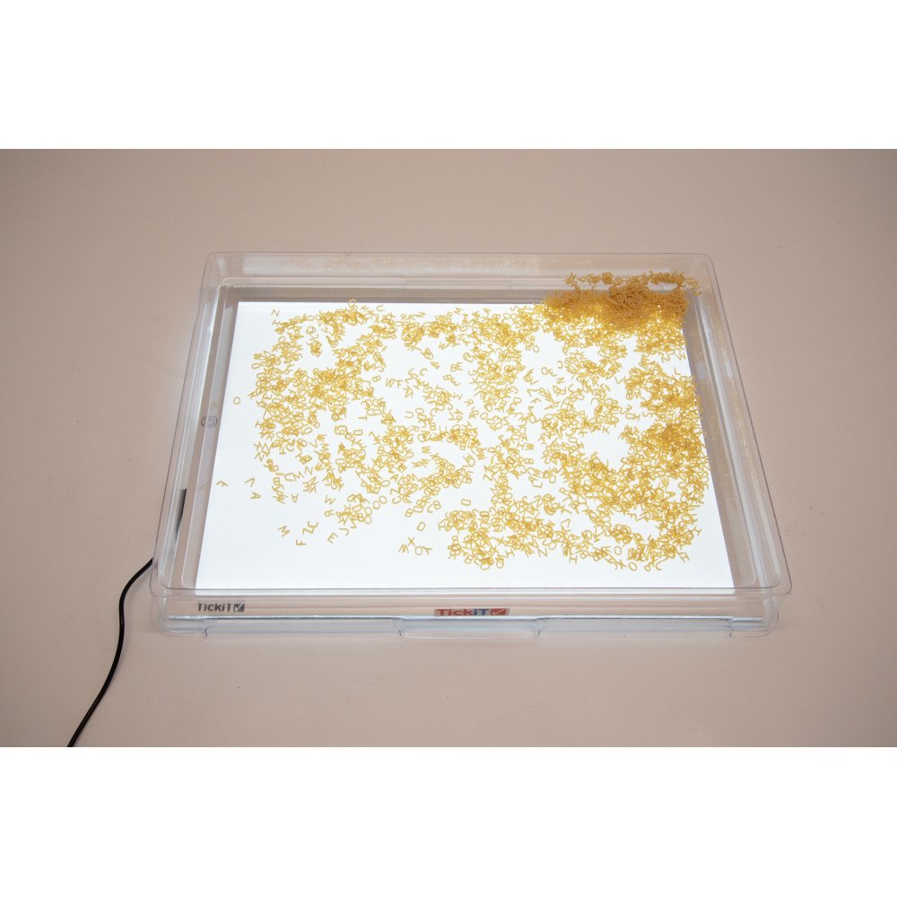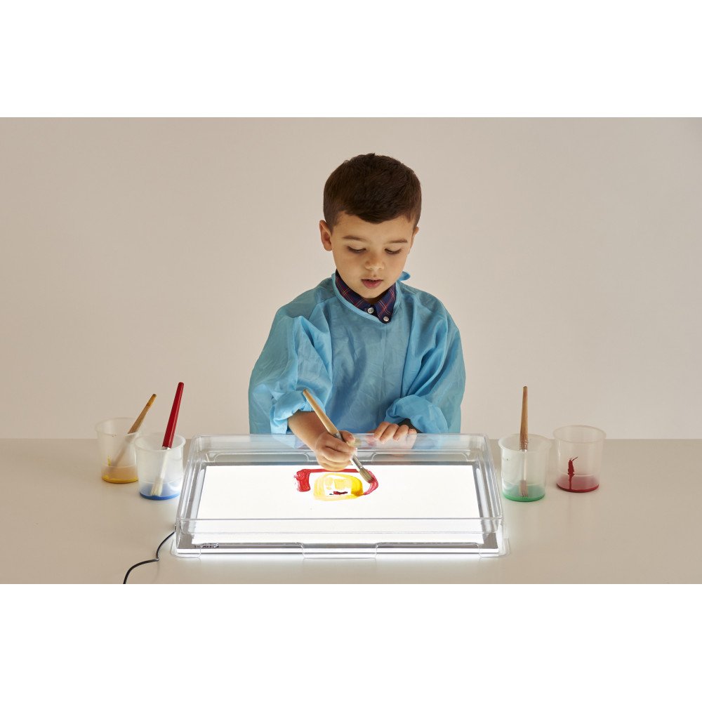 Padėklas puikiai tinka darbui su permatomomis detalėmis, spalvų maišymo eksperimentais, šviesos ir šešėlių stebėjimu bei raštų kūrimu. Ugdymo įstaigose ir terapinėse aplinkose tai praktiškas priedas, padedantis kurti struktūruotas, įtraukias ir vizualiai patrauklias veiklas.